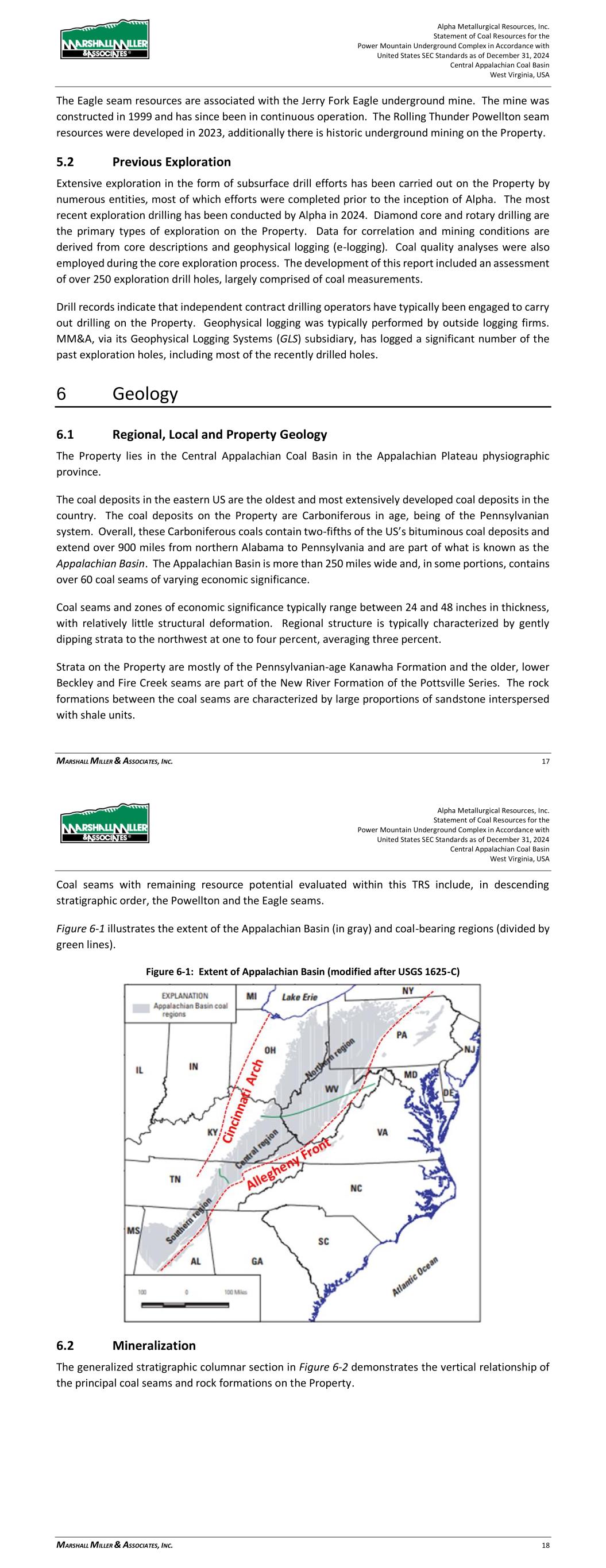Alpha Metallurgical Resources, Inc. Statement of Coal Resources for the Power Mountain Underground Complex in Accordance with United States SEC Standards as of December 31, 2024 Central Appalachian Coal Basin West Virginia, USA MARSHALL MILLER & ASSOCIATES, INC. 17 The Eagle seam resources are associated with the Jerry Fork Eagle underground mine. The mine was constructed in 1999 and has since been in continuous operation. The Rolling Thunder Powellton seam resources were developed in 2023, additionally there is historic underground mining on the Property. 5.2 Previous Exploration Extensive exploration in the form of subsurface drill efforts has been carried out on the Property by numerous entities, most of which efforts were completed prior to the inception of Alpha. The most recent exploration drilling has been conducted by Alpha in 2024. Diamond core and rotary drilling are the primary types of exploration on the Property. Data for correlation and mining conditions are derived from core descriptions and geophysical logging (e-logging). Coal quality analyses were also employed during the core exploration process. The development of this report included an assessment of over 250 exploration drill holes, largely comprised of coal measurements. Drill records indicate that independent contract drilling operators have typically been engaged to carry out drilling on the Property. Geophysical logging was typically performed by outside logging firms. MM&A, via its Geophysical Logging Systems (GLS) subsidiary, has logged a significant number of the past exploration holes, including most of the recently drilled holes. 6 Geology 6.1 Regional, Local and Property Geology The Property lies in the Central Appalachian Coal Basin in the Appalachian Plateau physiographic province. The coal deposits in the eastern US are the oldest and most extensively developed coal deposits in the country. The coal deposits on the Property are Carboniferous in age, being of the Pennsylvanian system. Overall, these Carboniferous coals contain two-fifths of the US’s bituminous coal deposits and extend over 900 miles from northern Alabama to Pennsylvania and are part of what is known as the Appalachian Basin. The Appalachian Basin is more than 250 miles wide and, in some portions, contains over 60 coal seams of varying economic significance. Coal seams and zones of economic significance typically range between 24 and 48 inches in thickness, with relatively little structural deformation. Regional structure is typically characterized by gently dipping strata to the northwest at one to four percent, averaging three percent. Strata on the Property are mostly of the Pennsylvanian-age Kanawha Formation and the older, lower Beckley and Fire Creek seams are part of the New River Formation of the Pottsville Series. The rock formations between the coal seams are characterized by large proportions of sandstone interspersed with shale units. Alpha Metallurgical Resources, Inc. Statement of Coal Resources for the Power Mountain Underground Complex in Accordance with United States SEC Standards as of December 31, 2024 Central Appalachian Coal Basin West Virginia, USA MARSHALL MILLER & ASSOCIATES, INC. 18 Coal seams with remaining resource potential evaluated within this TRS include, in descending stratigraphic order, the Powellton and the Eagle seams. Figure 6-1 illustrates the extent of the Appalachian Basin (in gray) and coal-bearing regions (divided by green lines). Figure 6-1: Extent of Appalachian Basin (modified after USGS 1625-C) 6.2 Mineralization The generalized stratigraphic columnar section in Figure 6-2 demonstrates the vertical relationship of the principal coal seams and rock formations on the Property.