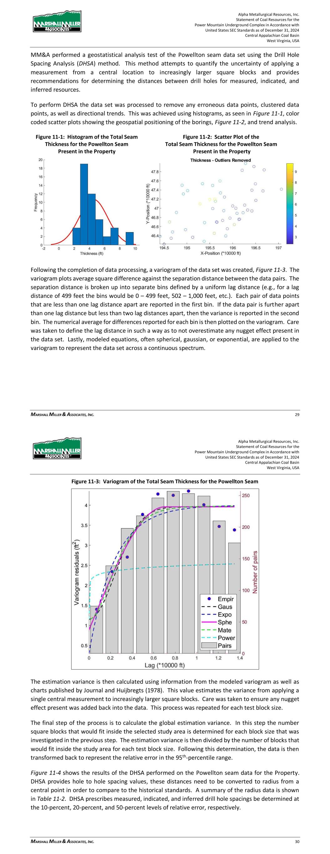 Alpha Metallurgical Resources, Inc. Statement of Coal Resources for the Power Mountain Underground Complex in Accordance with United States SEC Standards as of December 31, 2024 Central Appalachian Coal Basin West Virginia, USA MARSHALL MILLER & ASSOCIATES, INC. 29 MM&A performed a geostatistical analysis test of the Powellton seam data set using the Drill Hole Spacing Analysis (DHSA) method. This method attempts to quantify the uncertainty of applying a measurement from a central location to increasingly larger square blocks and provides recommendations for determining the distances between drill holes for measured, indicated, and inferred resources. To perform DHSA the data set was processed to remove any erroneous data points, clustered data points, as well as directional trends. This was achieved using histograms, as seen in Figure 11-1, color coded scatter plots showing the geospatial positioning of the borings, Figure 11-2, and trend analysis. Figure 11-1: Histogram of the Total Seam Thickness for the Powellton Seam Present in the Property Figure 11-2: Scatter Plot of the Total Seam Thickness for the Powellton Seam Present in the Property Following the completion of data processing, a variogram of the data set was created, Figure 11-3. The variogram plots average square difference against the separation distance between the data pairs. The separation distance is broken up into separate bins defined by a uniform lag distance (e.g., for a lag distance of 499 feet the bins would be 0 – 499 feet, 502 – 1,000 feet, etc.). Each pair of data points that are less than one lag distance apart are reported in the first bin. If the data pair is further apart than one lag distance but less than two lag distances apart, then the variance is reported in the second bin. The numerical average for differences reported for each bin is then plotted on the variogram. Care was taken to define the lag distance in such a way as to not overestimate any nugget effect present in the data set. Lastly, modeled equations, often spherical, gaussian, or exponential, are applied to the variogram to represent the data set across a continuous spectrum. Alpha Metallurgical Resources, Inc. Statement of Coal Resources for the Power Mountain Underground Complex in Accordance with United States SEC Standards as of December 31, 2024 Central Appalachian Coal Basin West Virginia, USA MARSHALL MILLER & ASSOCIATES, INC. 30 Figure 11-3: Variogram of the Total Seam Thickness for the Powellton Seam The estimation variance is then calculated using information from the modeled variogram as well as charts published by Journal and Huijbregts (1978). This value estimates the variance from applying a single central measurement to increasingly larger square blocks. Care was taken to ensure any nugget effect present was added back into the data. This process was repeated for each test block size. The final step of the process is to calculate the global estimation variance. In this step the number square blocks that would fit inside the selected study area is determined for each block size that was investigated in the previous step. The estimation variance is then divided by the number of blocks that would fit inside the study area for each test block size. Following this determination, the data is then transformed back to represent the relative error in the 95th-percentile range. Figure 11-4 shows the results of the DHSA performed on the Powellton seam data for the Property. DHSA provides hole to hole spacing values, these distances need to be converted to radius from a central point in order to compare to the historical standards. A summary of the radius data is shown in Table 11-2. DHSA prescribes measured, indicated, and inferred drill hole spacings be determined at the 10-percent, 20-percent, and 50-percent levels of relative error, respectively.