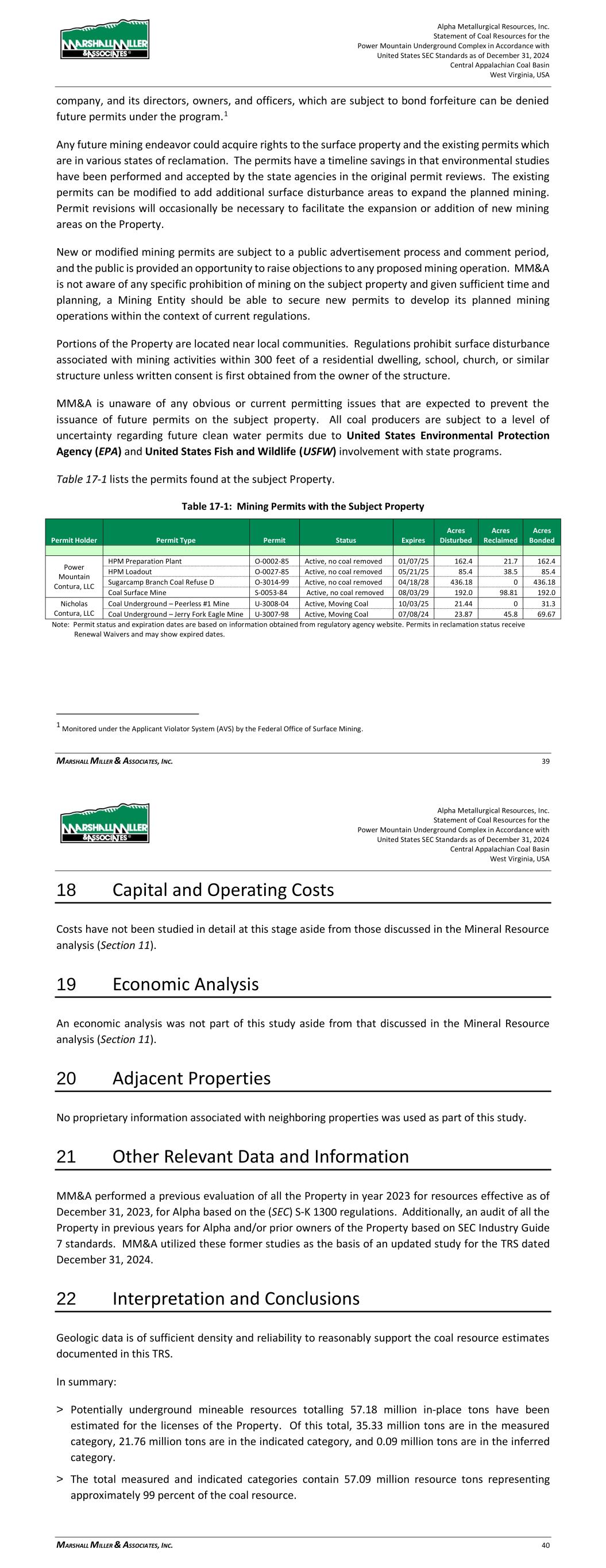 Alpha Metallurgical Resources, Inc. Statement of Coal Resources for the Power Mountain Underground Complex in Accordance with United States SEC Standards as of December 31, 2024 Central Appalachian Coal Basin West Virginia, USA MARSHALL MILLER & ASSOCIATES, INC. 39 company, and its directors, owners, and officers, which are subject to bond forfeiture can be denied future permits under the program.1 Any future mining endeavor could acquire rights to the surface property and the existing permits which are in various states of reclamation. The permits have a timeline savings in that environmental studies have been performed and accepted by the state agencies in the original permit reviews. The existing permits can be modified to add additional surface disturbance areas to expand the planned mining. Permit revisions will occasionally be necessary to facilitate the expansion or addition of new mining areas on the Property. New or modified mining permits are subject to a public advertisement process and comment period, and the public is provided an opportunity to raise objections to any proposed mining operation. MM&A is not aware of any specific prohibition of mining on the subject property and given sufficient time and planning, a Mining Entity should be able to secure new permits to develop its planned mining operations within the context of current regulations. Portions of the Property are located near local communities. Regulations prohibit surface disturbance associated with mining activities within 300 feet of a residential dwelling, school, church, or similar structure unless written consent is first obtained from the owner of the structure. MM&A is unaware of any obvious or current permitting issues that are expected to prevent the issuance of future permits on the subject property. All coal producers are subject to a level of uncertainty regarding future clean water permits due to United States Environmental Protection Agency (EPA) and United States Fish and Wildlife (USFW) involvement with state programs. Table 17-1 lists the permits found at the subject Property. Table 17-1: Mining Permits with the Subject Property Permit Holder Permit Type Permit Status Expires Acres Disturbed Acres Reclaimed Acres Bonded Power Mountain Contura, LLC HPM Preparation Plant O-0002-85 Active, no coal removed 01/07/25 162.4 21.7 162.4 HPM Loadout O-0027-85 Active, no coal removed 05/21/25 85.4 38.5 85.4 Sugarcamp Branch Coal Refuse D O-3014-99 Active, no coal removed 04/18/28 436.18 0 436.18 Coal Surface Mine S-0053-84 Active, no coal removed 08/03/29 192.0 98.81 192.0 Nicholas Contura, LLC Coal Underground – Peerless #1 Mine U-3008-04 Active, Moving Coal 10/03/25 21.44 0 31.3 Coal Underground – Jerry Fork Eagle Mine U-3007-98 Active, Moving Coal 07/08/24 23.87 45.8 69.67 Note: Permit status and expiration dates are based on information obtained from regulatory agency website. Permits in reclamation status receive Renewal Waivers and may show expired dates. 1 Monitored under the Applicant Violator System (AVS) by the Federal Office of Surface Mining. Alpha Metallurgical Resources, Inc. Statement of Coal Resources for the Power Mountain Underground Complex in Accordance with United States SEC Standards as of December 31, 2024 Central Appalachian Coal Basin West Virginia, USA MARSHALL MILLER & ASSOCIATES, INC. 40 18 Capital and Operating Costs Costs have not been studied in detail at this stage aside from those discussed in the Mineral Resource analysis (Section 11). 19 Economic Analysis An economic analysis was not part of this study aside from that discussed in the Mineral Resource analysis (Section 11). 20 Adjacent Properties No proprietary information associated with neighboring properties was used as part of this study. 21 Other Relevant Data and Information MM&A performed a previous evaluation of all the Property in year 2023 for resources effective as of December 31, 2023, for Alpha based on the (SEC) S-K 1300 regulations. Additionally, an audit of all the Property in previous years for Alpha and/or prior owners of the Property based on SEC Industry Guide 7 standards. MM&A utilized these former studies as the basis of an updated study for the TRS dated December 31, 2024. 22 Interpretation and Conclusions Geologic data is of sufficient density and reliability to reasonably support the coal resource estimates documented in this TRS. In summary: > Potentially underground mineable resources totalling 57.18 million in-place tons have been estimated for the licenses of the Property. Of this total, 35.33 million tons are in the measured category, 21.76 million tons are in the indicated category, and 0.09 million tons are in the inferred category. > The total measured and indicated categories contain 57.09 million resource tons representing approximately 99 percent of the coal resource.