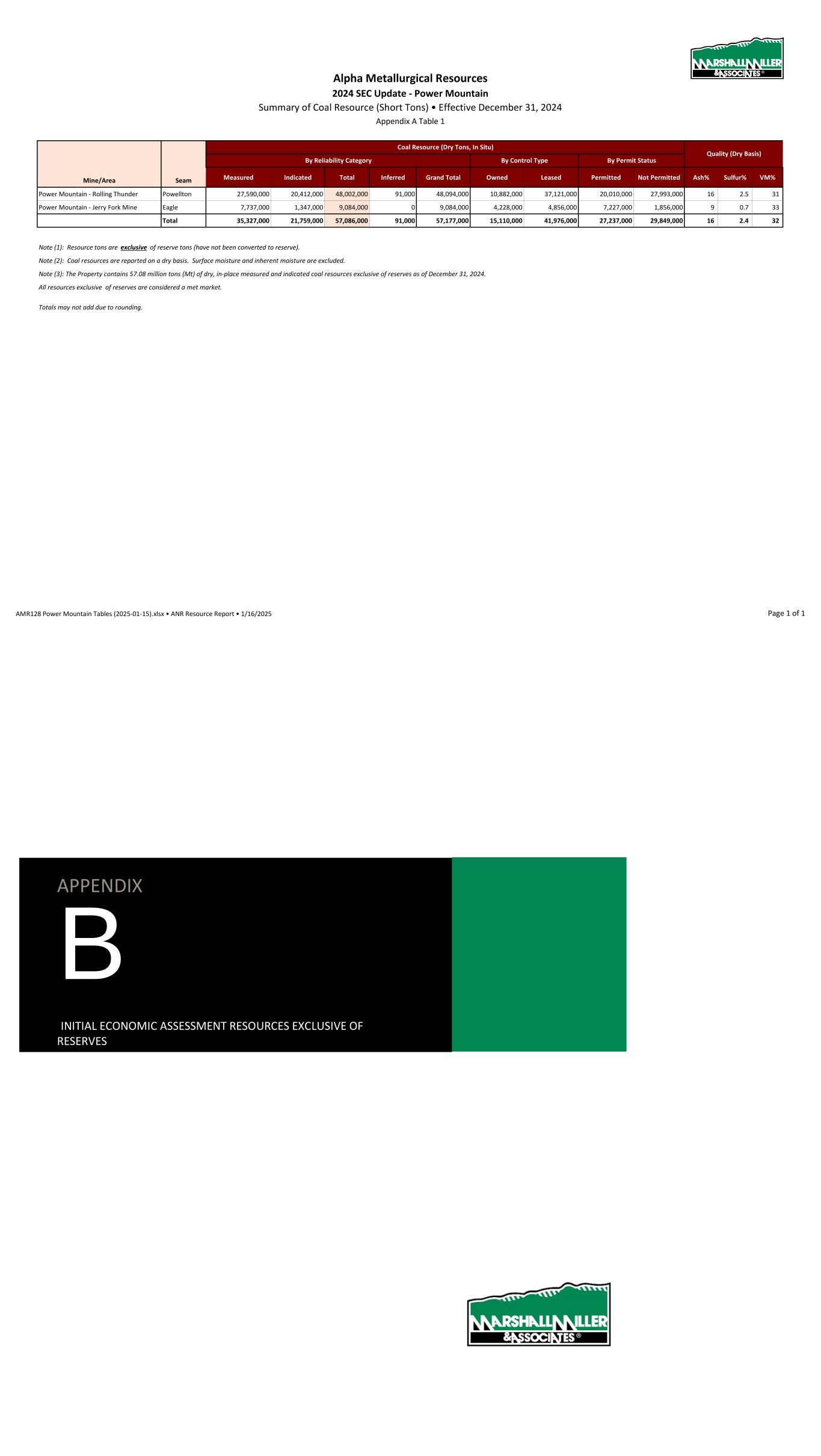 Alpha Metallurgical Resources 2024 SEC Update - Power Mountain Summary of Coal Resource (Short Tons) • Effective December 31, 2024 Appendix A Table 1 Mine/Area Seam Measured Indicated Total Inferred Grand Total Owned Leased Permitted Not Permitted Ash% Sulfur% VM% Power Mountain - Rolling Thunder Powellton 27,590,000 20,412,000 48,002,000 91,000 48,094,000 10,882,000 37,121,000 20,010,000 27,993,000 16 2.5 31 Power Mountain - Jerry Fork Mine Eagle 7,737,000 1,347,000 9,084,000 0 9,084,000 4,228,000 4,856,000 7,227,000 1,856,000 9 0.7 33 Total 35,327,000 21,759,000 57,086,000 91,000 57,177,000 15,110,000 41,976,000 27,237,000 29,849,000 16 2.4 32 Note (1): Resource tons are exclusive of reserve tons (have not been converted to reserve). Note (2): Coal resources are reported on a dry basis. Surface moisture and inherent moisture are excluded. Note (3): The Property contains 57.08 million tons (Mt) of dry, in-place measured and indicated coal resources exclusive of reserves as of December 31, 2024. All resources exclusive of reserves are considered a met market. Totals may not add due to rounding. Coal Resource (Dry Tons, In Situ) Quality (Dry Basis) By Reliability Category By Control Type By Permit Status AMR128 Power Mountain Tables (2025-01-15).xlsx • ANR Resource Report • 1/16/2025 Page 1 of 1 APPENDIX B INITIAL ECONOMIC ASSESSMENT RESOURCES EXCLUSIVE OF RESERVES
