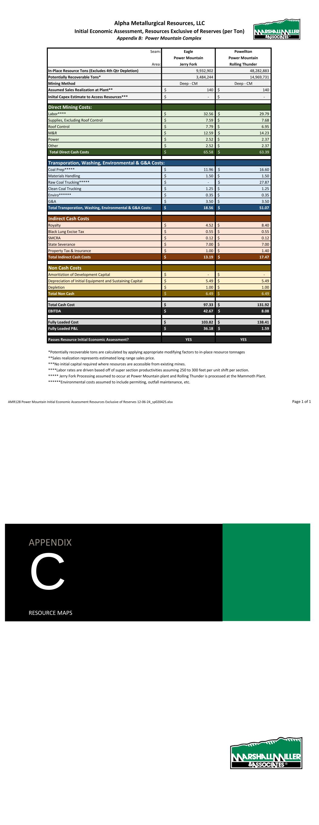 Alpha Metallurgical Resources, LLC Initial Economic Assessment, Resources Exclusive of Reserves (per Ton) Appendix B: Power Mountain Complex Seam: Eagle Powellton Power Mountain Power Mountain Area: Jerry Fork Rolling Thunder In-Place Resource Tons (Excludes 4th Qtr Depletion) 9,932,902 48,282,883 Potentially Recoverable Tons* 3,484,244 14,969,731 Mining Method Deep - CM Deep - CM Assumed Sales Realization at Plant** 140$ 140$ Iniital Capex Estimate to Access Resources*** -$ -$ Direct Mining Costs: Labor**** 32.56$ 29.79$ Supplies, Excluding Roof Control 7.59$ 7.68$ Roof Control 7.79$ 6.95$ M&R 12.59$ 14.23$ Power 2.52$ 2.37$ Other 2.52$ 2.37$ Total Direct Cash Costs 65.58$ 63.39$ Transporation, Washing, Environmental & G&A Costs: Coal Prep***** 11.96$ 16.60$ Materials Handling 1.50$ 1.50$ Raw Coal Trucking***** -$ 27.87$ Clean Coal Trucking 1.25$ 1.25$ Enviro****** 0.35$ 0.35$ G&A 3.50$ 3.50$ Total Transporation, Washing, Environmental & G&A Costs: 18.56$ 51.07$ Indirect Cash Costs Royalty 4.52$ 8.40$ Black Lung Excise Tax 0.55$ 0.55$ SMCRA 0.12$ 0.12$ State Severance 7.00$ 7.00$ Property Tax & Insurance 1.00$ 1.40$ Total Indirect Cash Costs 13.19$ 17.47$ Non Cash Costs Amoritiztion of Development Capital -$ -$ Depreciation of Initial Equipment and Sustaining Capital 5.49$ 5.49$ Depletion 1.00$ 1.00$ Total Non Cash 6.49$ 6.49$ Total Cash Cost 97.33$ 131.92$ EBITDA 42.67$ 8.08$ Fully Loaded Cost 103.82$ 138.41$ Fully Loaded P&L 36.18$ 1.59$ Passes Resource Initial Economic Assessment? YES YES *Potentially recoverable tons are calculated by applying appropriate modifying factors to in-place resource tonnages **Sales realization represents estimated long range sales price. ***No initial capital required where resources are accessible from existing mines. ****Labor rates are driven based off of super section productivities assuming 250 to 300 feet per unit shift per section. ***** Jerry Fork Processing assumed to occur at Power Mountain plant and Rolling Thunder is processed at the Mammoth Plant. ******Environmental costs assumed to include permiting, outfall maintenance, etc. AMR128 Power Mountain Initial Economic Assessment Resources Exclusive of Reserves 12-06-24_sp020425.xlsx Page 1 of 1 APPENDIX C RESOURCE MAPS