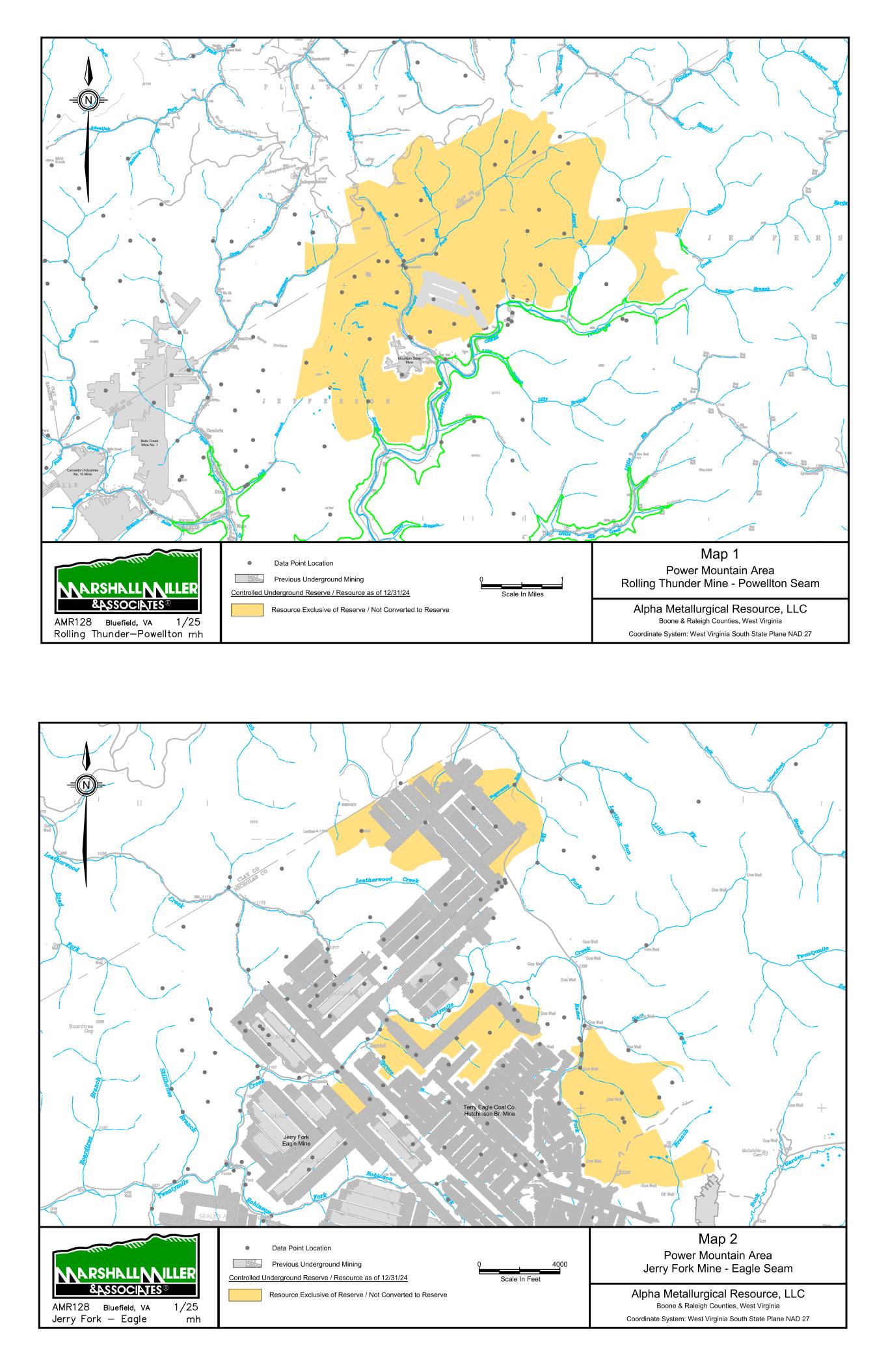 Alpha Metallurgical Resources, Inc. Statement of Coal Resources for the Power Mountain Underground Complex in Accordance with United States SEC Standards as of December 31, 2024 Central Appalachian Coal Basin West Virginia, USA MARSHALL MILLER & ASSOCIATES, INC. 9 utilization rate of 25.29% in 2024. The resources are assumed to produce a product of High Volatile metallurgical coking coal. 1.6 Mineral Resource Mineral resource estimates represent in-situ coal for the Property controlled by Alpha. The resources are summarized in Table 1-1 below. Resources totaling 57.18 million in-place tons have been estimated for the two coal seams evaluated on the Power Mountain property. Of this total, 35.33 million tons are in the measured category, 21.76 million tons are in the indicated category, and 0.09 million tons are in the inferred category. Table 1-1: Coal Resources Summary as of December 31, 2024 Coal Resource (Dry Tons, In Situ) By Reliability Category By Control Type By Permit Status Mine/Area Seam Measured Indicated Total Inferred Grand Total Owned Leased Permitted Not Permitted Rolling Thunder Powellton 27,590,000 20,412,000 48,002,000 91,000 48,094,000 10,882,000 37,121,000 20,010,000 27,993,000 Jerry Fork Mine Eagle 7,737,000 1,347,000 9,084,000 0 9,084,000 4,228,000 4,856,000 7,227,000 1,856,000 Total 35,327,000 21,759,000 57,086,000 91,000 57,177,000 15,110,000 41,976,000 27,237,000 29,849,000 Note: All Power Mountain resources are reported exclusive of reserves (have not been converted to reserve). 1.7 Mineral Reserves An economic evaluation and assessment of all modifying factors has not been completed. No reserves are reported for the Power Mountain coal resources. 1.8 Permitting The Power Mountain property has existing permits associated with existing mining operations and surface facilities. Required permits for the Rolling Thunder Powellton mine have been issued and are classified as active, moving coal. MM&A is unaware of any obvious or current Alpha permitting issues that are expected to prevent the issuance of future permits. Alpha, along with all coal producers, is subject to a level of uncertainty regarding future clean water permits due to United States Environmental Protection Agency (EPA) involvement with state programs. 1.9 Conclusion and Recommendations Sufficient data has been obtained through various exploration and sampling programs and mining operations to support the geological interpretations of seam structure and thickness for coal horizons situated on the Power Mountain property and reviewed in the study. The data is of sufficient quantity and reliability to reasonably support the coal resource estimates in this TRS. Alpha Metallurgical Resources, Inc. Statement of Coal Resources for the Power Mountain Underground Complex in Accordance with United States SEC Standards as of December 31, 2024 Central Appalachian Coal Basin West Virginia, USA MARSHALL MILLER & ASSOCIATES, INC. 10 In summary: > Potentially underground mineable resources totalling 57.18 million in-place tons have been estimated for the licenses of the Property. Of this total, 35.33 million tons are in the measured category, 21.76 million tons are in the indicated category, and 0.09 million tons are in the inferred category. > The total measured and indicated categories contain 57.09 million resource tons representing approximately 99 percent of the coal resource. 2 Introduction 2.1 Registrant and Terms of Reference Alpha authorized MM&A to prepare this Technical Report Summary (TRS) of coal resources controlled by Alpha in the Eagle and Powellton seams located in Nicholas County, West Virginia (the Property). This report was prepared for the sole use of Alpha and its affiliated and subsidiary companies and advisors. The report provides a statement of coal resources for Alpha, as defined under the United States Securities and Exchange Commission (SEC) standards. Coal resources are herein reported in U.S. units of measurement. 2.2 Information Sources The technical report is based on information provided by Alpha and reviewed by MM&A’s professionals, including geologists, mining engineers and environmental scientists. MM&A’s professionals hold professional registrations and memberships which qualify them as Qualified Persons in accordance with SEC guidelines.