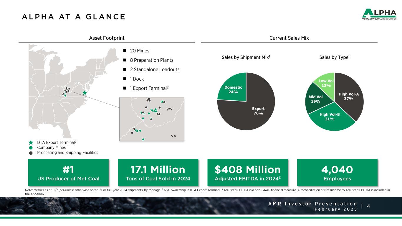 1 1A M R R a t i n g s A g e n c y P r e s e n t a t i o n J a n u a r y 2 0 2 5 |A M R I n v e s t o r F e b r S T R AT E G I C A L LY LO C AT E D AS S E T S W I T H A B I L I T Y TO S E RV E B OT H D O M E S T I C A N D E X P O R T M A R K E T S 3 Note: Metrics as of year-end 2024. 1 Represents Non-GAAP coal sales realization per ton. Refer to Appendix for a reconciliation of this non-GAAP financial measure. 22 % Domestic Coal Revenue 78 % Export Coal Revenue $ 152 Domestic Average Realized Price ($/ton) 1 $ 140 Export Average Realized Price ($/ton) 1 Dominion Terminal Associates (DTA) Coal Export Terminal Export Domestic # 1 US Producer of Met Coal 26 Countries Served 3.9 Million Tons Sold Domestically 13.2 Million Tons Sold Internationally Alpha owns 65% interest in DTA coal export terminal, enhancing access to key export markets and diversifying its customer base Newport News, Virginia Hub for Alpha coal exports Provides: — Transportation flexibility — Coal blending — Storage capacity Allows control of key export markets and maintains competitive cost