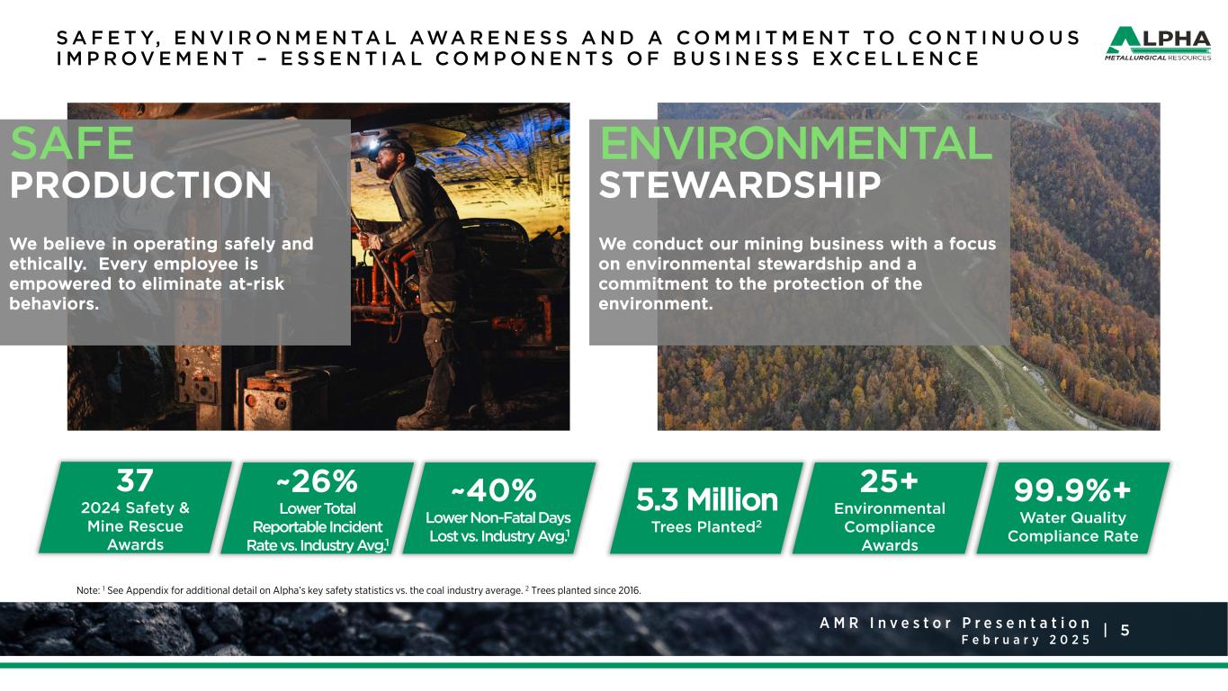 4A M R R a t i n g s A g e n c y P r e s e n t a t i o n J a n u a r y 2 0 2 5 |A M R I n v e s t o r F e b r A L P H A AT A G L A N C E Note: Metrics as of 12/31/24 unless otherwise noted. 1 For full-year 2024 shipments, by tonnage. 2 65% ownership in DTA Export Terminal. 3 Adjusted EBITDA is a non-GAAP financial measure. A reconciliation of Net Income to Adjusted EBITDA is included in the Appendix. Current Sales Mix Sales by Shipment Mix1 Sales by Type1 WV VA 17.1 Million Tons of Coal Sold in 2024 $408 Million Adjusted EBITDA in 20243 #1 US Producer of Met Coal 4,040 Employees Asset Footprint 20 Mines 8 Preparation Plants 2 Standalone Loadouts 1 Dock 1 Export Terminal2 DTA Export Terminal2 Company Mines Processing and Shipping Facilities High Vol-A 37% High Vol-B 31% Mid Vol 19% Low Vol 13% Export 76% Domestic 24%