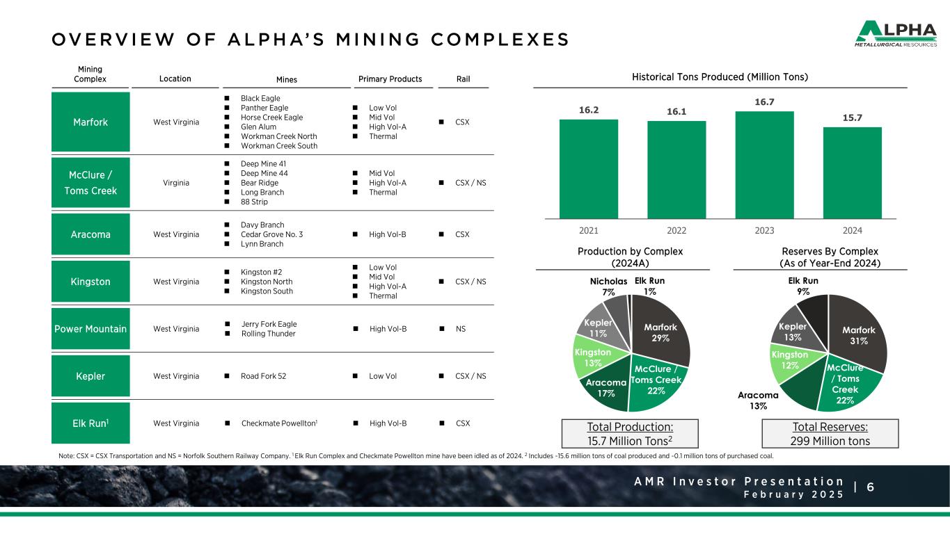5A M R R a t i n g s A g e n c y P r e s e n t a t i o n J a n u a r y 2 0 2 5 |A M R I n v e s t o r F e b r S A F E T Y, E N V I R O N M E N TA L AWA R E N E S S A N D A C O M M I T M E N T T O C O N T I N U O U S I M P R O V E M E N T – E S S E N T I A L C O M P O N E N T S O F B U S I N E S S E X C E L L E N C E Note: 1 See Appendix for additional detail on Alpha’s key safety statistics vs. the coal industry average. 2 Trees planted since 2016. ~26% Lower Total Reportable Incident Rate vs. Industry Avg.1 ~40% Lower Non-Fatal Days Lost vs. Industry Avg.1 37 2024 Safety & Mine Rescue Awards 5.3 Million Trees Planted2 25+ Environmental Compliance Awards 99.9%+ Water Quality Compliance Rate SAFE PRODUCTION We believe in operating safely and ethically. Every employee is empowered to eliminate at-risk behaviors. ENVIRONMENTAL STEWARDSHIP We conduct our mining business with a focus on environmental stewardship and a commitment to the protection of the environment.