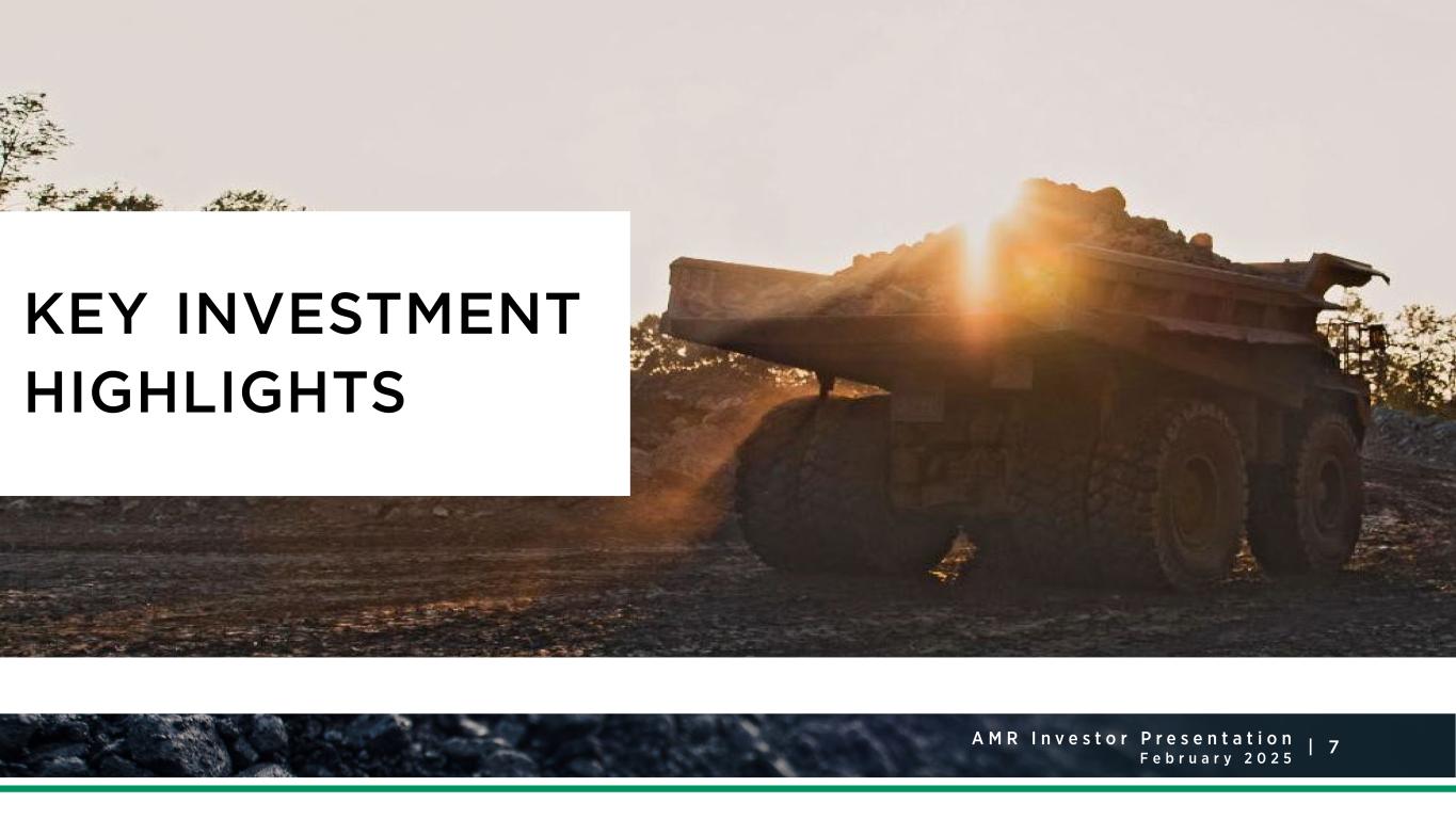1 4A M R R a t i n g s A g e n c y P r e s e n t a t i o n J a n u a r y 2 0 2 5 |A M R I n v e s t o r F e b r S T R O N G C U LT U R E O F C O M M I T M E N T T O S A F E T Y, E N V I R O N M E N TA L S T E WA R D S H I P, A N D C O N T I N U O U S I M P R O V E M E N T6 Environmental • Environmental Management Systems • Water Management Systems • Waste Management Systems • Biodiversity Control • “Beyond Compliance” Attitude Social • Safety and Health • Workforce and Operations • Community Involvement • Code of Ethics and Responsibility Governance • Rigorous reporting and documentation standards • Strategic shift away from thermal coal Environmental Awards & Recognition 2024 Best Reclaimed Underground Mine 2023 Exemplary Reclamation of Surface Mining 2023 Exemplary Reclamation of Underground Mining 2023 Best AML Dangerous Highwall Elimination 2022 Underground Reclamation Award 2022 Drainage Control award Outstanding Employee Relations Experienced Leadership Driving Growth Safety performance is ~40% better than industry average1 Competitive compensation and benefits package Equal opportunity employer Strict anti-harassment and anti-discrimination policies 85% workforce retention in 2024 Combined 100+ years of experience across the coal and financial industries 83% Board independence 33% Board gender diversity Average director age of 58 years Average board tenure of 3 years Note: 1 Represents 2022 – 2024YTD average Non-Fatal Days Lost for Alpha of 1.23 vs. 2.22 for the coal industry average.