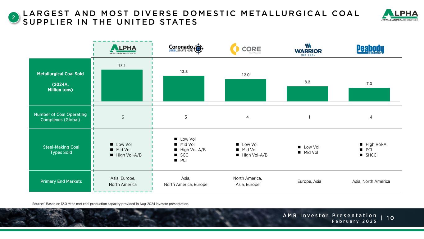 8A M R R a t i n g s A g e n c y P r e s e n t a t i o n J a n u a r y 2 0 2 5 |A M R I n v e s t o r F e b r K E Y I N V E S T M E N T H I G H L I G H T S Strategically Located Assets With Ability to Serve Both Domestic and Export Markets Experienced Management Team With Deep Industry Expertise and Familiarity With Alpha’s Asset Base Largest and Most Diverse Domestic Metallurgical Coal Supplier in the United States Outlook for Metallurgical Coal Remains Robust With Strong Long-Term Demand and Limited New Supply Flexible Cost Structure Enables Resilience Through the Commodity Price Cycle Strong Culture of Commitment to Safety, Environmental Stewardship, and Continuous Improvement Disciplined Capital Return Policy With Proven Ability to Adjust to Market Dynamics 4 1 2 3 5 6 7