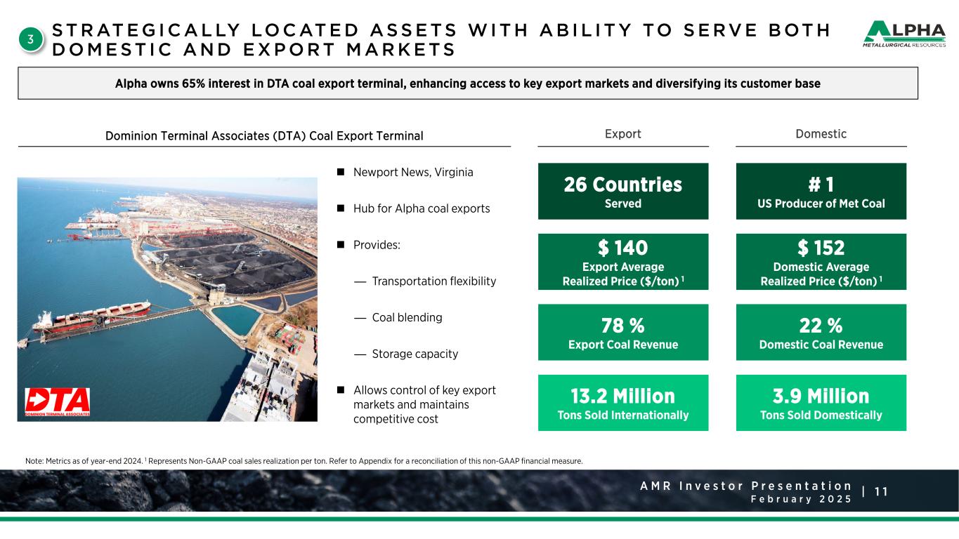 2 4A M R R a t i n g s A g e n c y P r e s e n t a t i o n J a n u a r y 2 0 2 5 |A M R I n v e s t o r F e b r (1) Based on committed and priced coal shipments as of February 20, 2025. Committed percentage based on the midpoint of shipment guidance range. (2) Actual average per-ton realizations on committed and priced tons recognized in future periods may vary based on actual freight expense in future periods relative to assumed freight expense embedded in projected average per-ton realizations. (3) Includes estimates of future coal shipments based upon contract terms and anticipated delivery schedules. Actual coal shipments may vary from these estimates. (4) Note: The Company is unable to present a quantitative reconciliation of its forward-looking non-GAAP cost of coal sales per ton sold financial measures to the most directly comparable GAAP measures without unreasonable efforts due to the inherent difficulty in forecasting and quantifying with reasonable accuracy significant items required for the reconciliation. The most directly comparable GAAP measure, GAAP cost of sales, is not accessible without unreasonable efforts on a forward-looking basis. The reconciling items include freight and handling costs, which are a component of GAAP cost of sales. Management is unable to predict without unreasonable efforts freight and handling costs due to uncertainty as to the end market and FOB point for uncommitted sales volumes and the final shipping point for export shipments. These amounts have varied historically and may continue to vary significantly from quarter to quarter and material changes to these items could have a significant effect on our future GAAP results. (5) Excludes expenses related to non-cash stock compensation and non-recurring expenses. (6) Includes contributions to fund normal operations at our DTA export facility and expected capital investments related to the facility upgrades. G U I DA N C E A S O F F E B R UA RY 2 8 , 2 0 2 5 Shipments (million tons) Low High Metallurgical 14.5 15.5 Non-Metallurgical Byproduct 1.0 1.4 Met Segment - Total Shipments 15.5 16.9 Committed / Priced Volumes(1)(2)(3) % Committed Average Price ($/ton) Metallurgical - Domestic $152.94 Metallurgical - Export $113.11 Metallurgical Total 32% $143.81 Non-Metallurgical Byproduct 95% $80.74 Met Segment 37% $131.73 Cost per ton ($/ton)(4) Low High Met Segment $103.00 $110.00 Other Items (US$ millions, except taxes) Low High SG&A(5) $53 $59 Idle Operations Expense $18 $28 Net Cash Interest Income $2 $10 DD&A $165 $185 Capital Expenditures $152 $182 Capital Contributions to Equity Affiliates(6) $44 $54 Cash Tax Rate 0% 5%