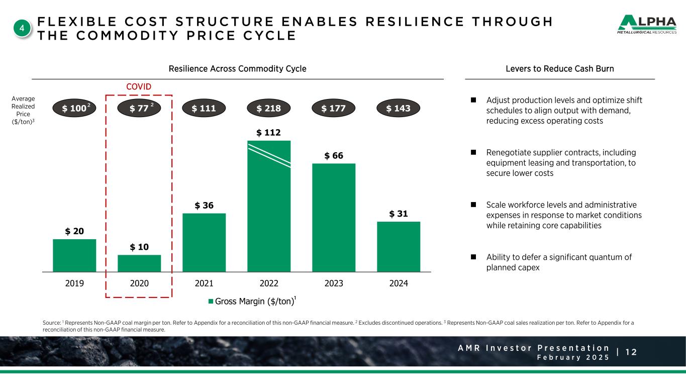 1 2A M R R a t i n g s A g e n c y P r e s e n t a t i o n J a n u a r y 2 0 2 5 |A M R I n v e s t o r F e b r Source: 1 Represents Non-GAAP coal margin per ton. Refer to Appendix for a reconciliation of this non-GAAP financial measure. 2 Excludes discontinued operations. 3 Represents Non-GAAP coal sales realization per ton. Refer to Appendix for a reconciliation of this non-GAAP financial measure. F L E X I B L E CO S T S T R U C T U R E E N A B L E S R E S I L I E N C E T H R O U G H T H E CO M M O D I T Y P R I C E C YC L E 4 Resilience Across Commodity Cycle Levers to Reduce Cash Burn Average Realized Price ($/ton)3 COVID Adjust production levels and optimize shift schedules to align output with demand, reducing excess operating costs Renegotiate supplier contracts, including equipment leasing and transportation, to secure lower costs Scale workforce levels and administrative expenses in response to market conditions while retaining core capabilities Ability to defer a significant quantum of planned capex 2 1 $ 20 $ 10 $ 36 $ 66 $ 31 2019 2020 2021 2022 2023 2024 Gross Margin ($/ton) $ 100 $ 77 $ 111 $ 218 $ 177 $ 143 $ 112 22
