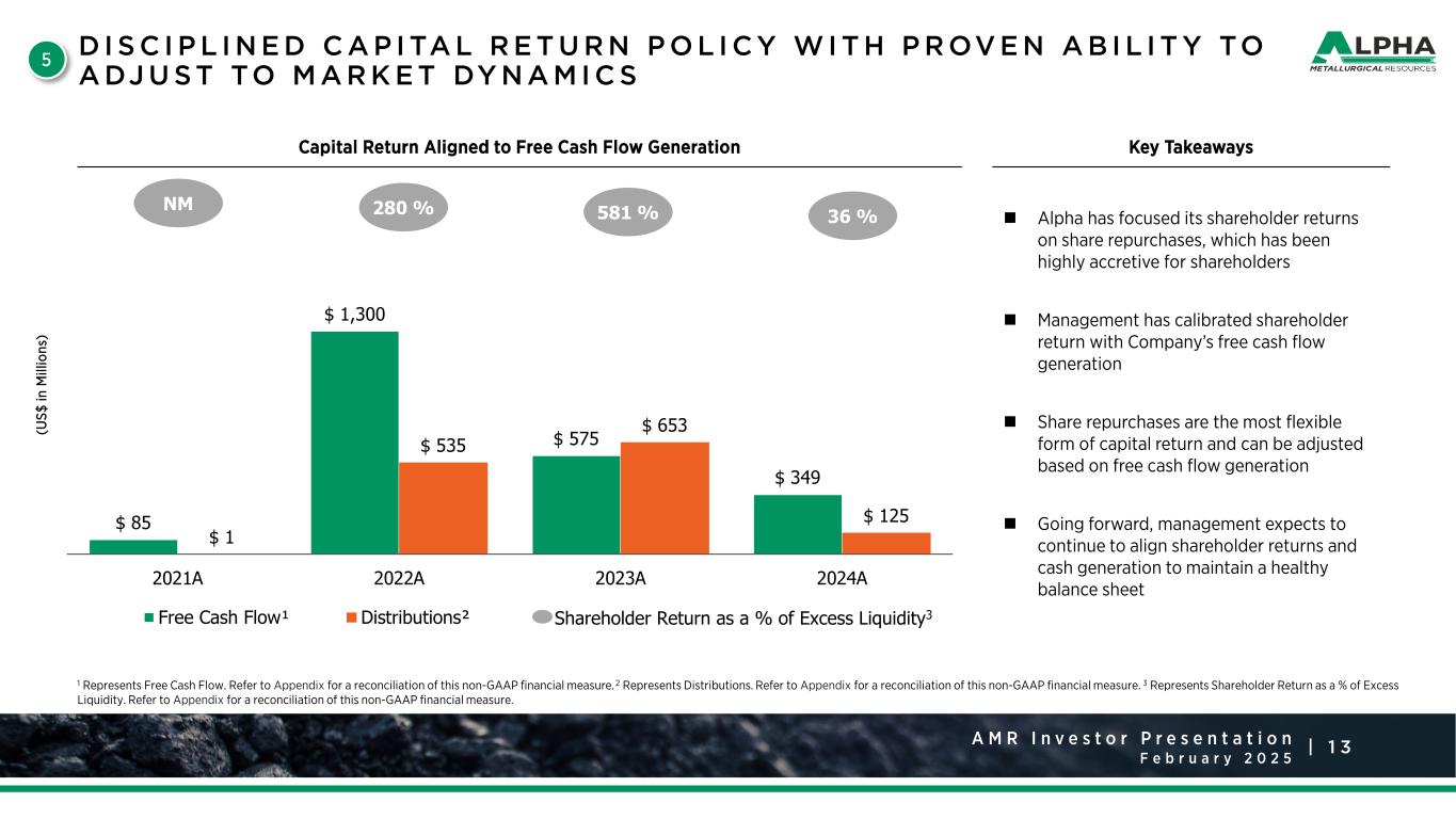 1 3A M R R a t i n g s A g e n c y P r e s e n t a t i o n J a n u a r y 2 0 2 5 |A M R I n v e s t o r F e b r D I S C I P L I N E D C A P I TA L R E T U R N P O L I C Y W I T H P R OV E N A B I L I T Y TO A DJ U S T TO M A R K E T DY N A M I C S 5 1 Represents Free Cash Flow. Refer to Appendix for a reconciliation of this non-GAAP financial measure. 2 Represents Distributions. Refer to Appendix for a reconciliation of this non-GAAP financial measure. 3 Represents Shareholder Return as a % of Excess Liquidity. Refer to Appendix for a reconciliation of this non-GAAP financial measure. Alpha has focused its shareholder returns on share repurchases, which has been highly accretive for shareholders Management has calibrated shareholder return with Company’s free cash flow generation Share repurchases are the most flexible form of capital return and can be adjusted based on free cash flow generation Going forward, management expects to continue to align shareholder returns and cash generation to maintain a healthy balance sheet Key TakeawaysCapital Return Aligned to Free Cash Flow Generation (U S$ in M ill io ns ) $ 85 $ 1,300 $ 575 $ 349 $ 1 $ 535 $ 653 $ 125 2021A 2022A 2023A 2024A Free Cash Flow¹ Distributions² Shareholder Return as a % of Excess Liquidity3 280 %NM 581 % 36 %