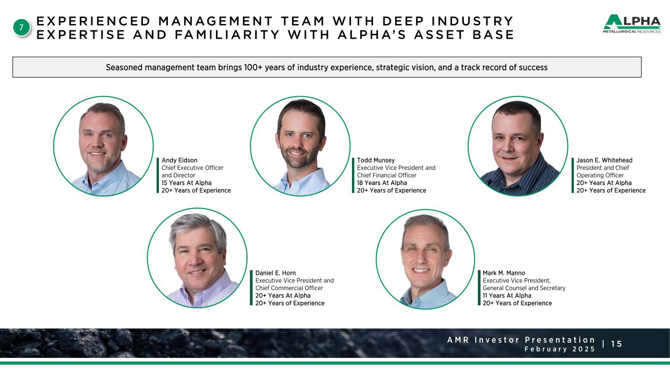 1 5A M R R a t i n g s A g e n c y P r e s e n t a t i o n J a n u a r y 2 0 2 5 |A M R I n v e s t o r F e b r E X P E R I E N C E D M A N AG E M E N T T E A M W I T H D E E P I N D U S T RY E X P E R T I S E A N D FA M I L I A R I T Y W I T H A L P H A’ S AS S E T B AS E 7 Seasoned management team brings 100+ years of industry experience, strategic vision, and a track record of success Daniel E. Horn Executive Vice President and Chief Commercial Officer 20+ Years At Alpha 20+ Years of Experience Mark M. Manno Executive Vice President, General Counsel and Secretary 11 Years At Alpha 20+ Years of Experience Andy Eidson Chief Executive Officer and Director 15 Years At Alpha 20+ Years of Experience Todd Munsey Executive Vice President and Chief Financial Officer 18 Years At Alpha 20+ Years of Experience Jason E. Whitehead President and Chief Operating Officer 20+ Years At Alpha 20+ Years of Experience
