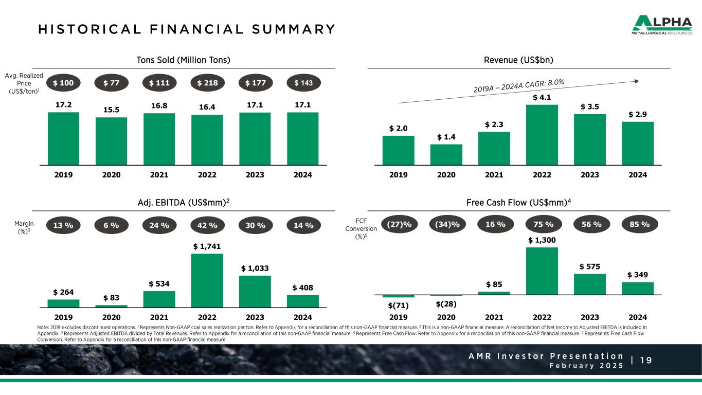 1 9A M R R a t i n g s A g e n c y P r e s e n t a t i o n J a n u a r y 2 0 2 5 |A M R I n v e s t o r F e b r H I S TO R I C A L F I N A N C I A L S U M M A RY Tons Sold (Million Tons) Revenue (US$bn) Adj. EBITDA (US$mm)2 Free Cash Flow (US$mm)4 Avg. Realized Price (US$/ton)1 Note: 2019 excludes discontinued operations. 1 Represents Non-GAAP coal sales realization per ton. Refer to Appendix for a reconciliation of this non-GAAP financial measure. 2 This is a non-GAAP financial measure. A reconciliation of Net Income to Adjusted EBITDA is included in Appendix. 3 Represents Adjusted EBITDA divided by Total Revenues. Refer to Appendix for a reconciliation of this non-GAAP financial measure. 4 Represents Free Cash Flow. Refer to Appendix for a reconciliation of this non-GAAP financial measure. 5 Represents Free Cash Flow Conversion. Refer to Appendix for a reconciliation of this non-GAAP financial measure. Margin (%)3 FCF Conversion (%)5 17.2 15.5 16.8 16.4 17.1 17.1 2019 2020 2021 2022 2023 2024 $ 100 $ 177 $ 218 $ 111 $ 77 $ 143 $ 2.0 $ 1.4 $ 2.3 $ 4.1 $ 3.5 $ 2.9 2019 2020 2021 2022 2023 2024 $ 264 $ 83 $ 534 $ 1,741 $ 1,033 $ 408 2019 2020 2021 2022 2023 2024 13 % 30 %42 %24 %6 % 14 % $(71) $(28) $ 85 $ 1,300 $ 575 $ 349 2019 2020 2021 2022 2023 2024 (27)% 56 %75 %16 %(34)% 85 %