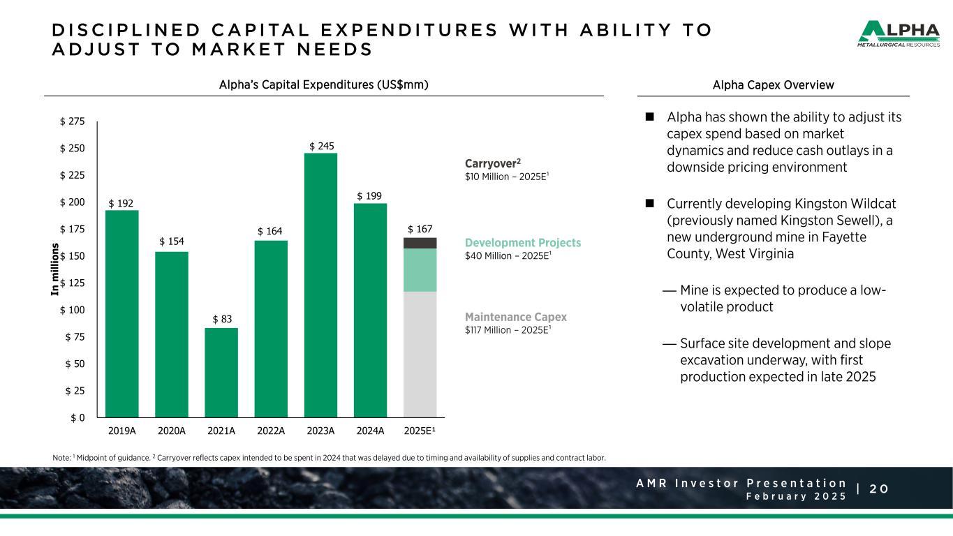 2 0A M R R a t i n g s A g e n c y P r e s e n t a t i o n J a n u a r y 2 0 2 5 |A M R I n v e s t o r F e b r D I S C I P L I N E D C A P I TA L E X P E N D I T U R E S W I T H A B I L I T Y TO A DJ U S T TO M A R K E T N E E D S Alpha’s Capital Expenditures (US$mm) Alpha Capex Overview Alpha has shown the ability to adjust its capex spend based on market dynamics and reduce cash outlays in a downside pricing environment Currently developing Kingston Wildcat (previously named Kingston Sewell), a new underground mine in Fayette County, West Virginia — Mine is expected to produce a low- volatile product — Surface site development and slope excavation underway, with first production expected in late 2025 Note: 1 Midpoint of guidance. 2 Carryover reflects capex intended to be spent in 2024 that was delayed due to timing and availability of supplies and contract labor. Carryover2 $10 Million – 2025E¹ Maintenance Capex $117 Million – 2025E¹ Development Projects $40 Million – 2025E¹ $ 192 $ 154 $ 83 $ 164 $ 245 $ 199 $ 167 $ 0 $ 25 $ 50 $ 75 $ 100 $ 125 $ 150 $ 175 $ 200 $ 225 $ 250 $ 275 2019A 2020A 2021A 2022A 2023A 2024A 2025E¹ In m ill io ns