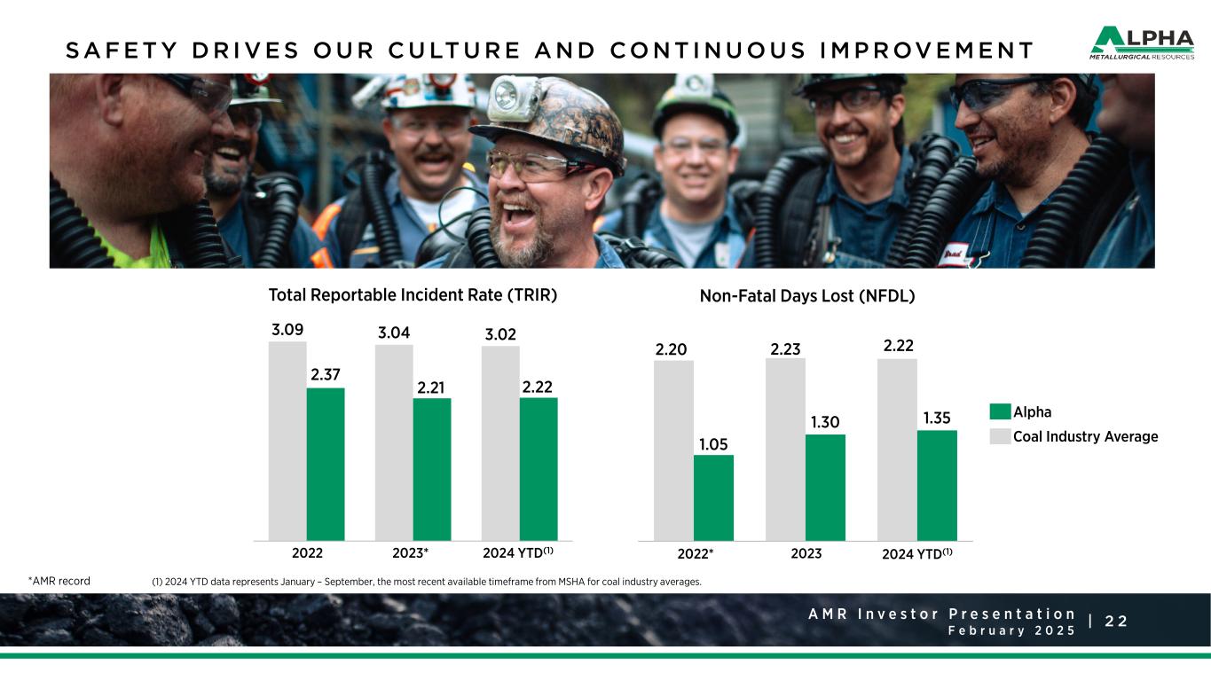 2 2A M R R a t i n g s A g e n c y P r e s e n t a t i o n J a n u a r y 2 0 2 5 |A M R I n v e s t o r F e b r 3.09 3.04 3.02 2.37 2.21 2.22 2022 2023* 2024 YTD(1) Coal Industry Average Total Reportable Incident Rate (TRIR) 2.20 2.23 2.22 1.05 1.30 1.35 2022* 2023 2024 YTD(1) Non-Fatal Days Lost (NFDL) S A F E T Y D R I V E S O U R C U LT U R E A N D CO N T I N U O U S I M P R OV E M E N T Alpha (1) 2024 YTD data represents January – September, the most recent available timeframe from MSHA for coal industry averages.*AMR record