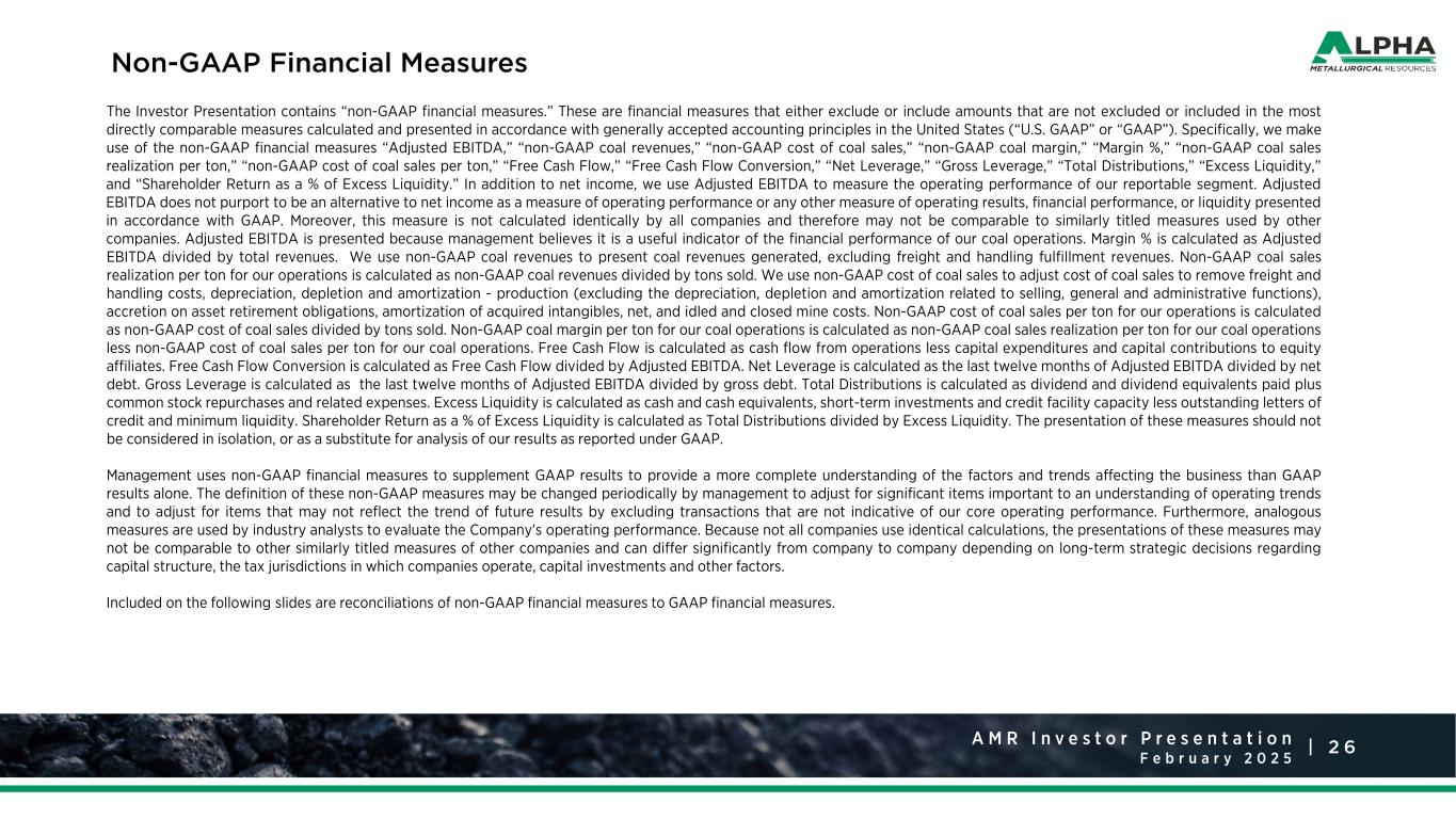 2 6A M R R a t i n g s A g e n c y P r e s e n t a t i o n J a n u a r y 2 0 2 5 |A M R I n v e s t o r F e b r Non-GAAP Financial Measures The Investor Presentation contains “non-GAAP financial measures.” These are financial measures that either exclude or include amounts that are not excluded or included in the most directly comparable measures calculated and presented in accordance with generally accepted accounting principles in the United States (“U.S. GAAP” or “GAAP”). Specifically, we make use of the non-GAAP financial measures “Adjusted EBITDA,” “non-GAAP coal revenues,” “non-GAAP cost of coal sales,” “non-GAAP coal margin,” “Margin %,” “non-GAAP coal sales realization per ton,” “non-GAAP cost of coal sales per ton,” “Free Cash Flow,” “Free Cash Flow Conversion,” “Net Leverage,” “Gross Leverage,” “Total Distributions,” “Excess Liquidity,” and “Shareholder Return as a % of Excess Liquidity.” In addition to net income, we use Adjusted EBITDA to measure the operating performance of our reportable segment. Adjusted EBITDA does not purport to be an alternative to net income as a measure of operating performance or any other measure of operating results, financial performance, or liquidity presented in accordance with GAAP. Moreover, this measure is not calculated identically by all companies and therefore may not be comparable to similarly titled measures used by other companies. Adjusted EBITDA is presented because management believes it is a useful indicator of the financial performance of our coal operations. Margin % is calculated as Adjusted EBITDA divided by total revenues. We use non-GAAP coal revenues to present coal revenues generated, excluding freight and handling fulfillment revenues. Non-GAAP coal sales realization per ton for our operations is calculated as non-GAAP coal revenues divided by tons sold. We use non-GAAP cost of coal sales to adjust cost of coal sales to remove freight and handling costs, depreciation, depletion and amortization - production (excluding the depreciation, depletion and amortization related to selling, general and administrative functions), accretion on asset retirement obligations, amortization of acquired intangibles, net, and idled and closed mine costs. Non-GAAP cost of coal sales per ton for our operations is calculated as non-GAAP cost of coal sales divided by tons sold. Non-GAAP coal margin per ton for our coal operations is calculated as non-GAAP coal sales realization per ton for our coal operations less non-GAAP cost of coal sales per ton for our coal operations. Free Cash Flow is calculated as cash flow from operations less capital expenditures and capital contributions to equity affiliates. Free Cash Flow Conversion is calculated as Free Cash Flow divided by Adjusted EBITDA. Net Leverage is calculated as the last twelve months of Adjusted EBITDA divided by net debt. Gross Leverage is calculated as the last twelve months of Adjusted EBITDA divided by gross debt. Total Distributions is calculated as dividend and dividend equivalents paid plus common stock repurchases and related expenses. Excess Liquidity is calculated as cash and cash equivalents, short-term investments and credit facility capacity less outstanding letters of credit and minimum liquidity. Shareholder Return as a % of Excess Liquidity is calculated as Total Distributions divided by Excess Liquidity. The presentation of these measures should not be considered in isolation, or as a substitute for analysis of our results as reported under GAAP. Management uses non-GAAP financial measures to supplement GAAP results to provide a more complete understanding of the factors and trends affecting the business than GAAP results alone. The definition of these non-GAAP measures may be changed periodically by management to adjust for significant items important to an understanding of operating trends and to adjust for items that may not reflect the trend of future results by excluding transactions that are not indicative of our core operating performance. Furthermore, analogous measures are used by industry analysts to evaluate the Company’s operating performance. Because not all companies use identical calculations, the presentations of these measures may not be comparable to other similarly titled measures of other companies and can differ significantly from company to company depending on long-term strategic decisions regarding capital structure, the tax jurisdictions in which companies operate, capital investments and other factors. Included on the following slides are reconciliations of non-GAAP financial measures to GAAP financial measures.
