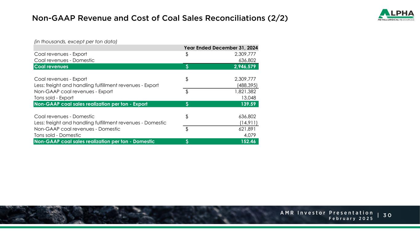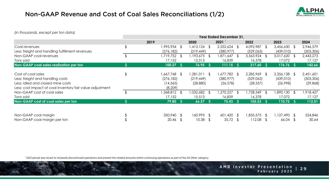 2 9A M R R a t i n g s A g e n c y P r e s e n t a t i o n J a n u a r y 2 0 2 5 |A M R I n v e s t o r F e b r Non-GAAP Revenue and Cost of Coal Sales Reconciliations (1/2) 1 2021 period was recast to reclassify discontinued operations and present the related amounts within continuing operations as part of the All Other category. (in thousands, except per ton data) 2019 2020 2021 1 2022 2023 2024 Coal revenues 1,995,934$ 1,413,124$ 2,252,624$ 4,092,987$ 3,456,630$ 2,946,579$ Less: freight and handling fulfillment revenues (276,182) (219,449) (380,977) (529,063) (439,010) (503,306) Non-GAAP coal revenues 1,719,752$ 1,193,675$ 1,871,647$ 3,563,924$ 3,017,620$ 2,443,273$ Tons sold 17,152 15,513 16,839 16,378 17,072 17,127 Non-GAAP coal sales realization per ton 100.27$ 76.95$ 111.15$ 217.60$ 176.76$ 142.66$ Cost of coal sales 1,667,768$ 1,281,011$ 1,677,782$ 2,285,969$ 2,356,138$ 2,451,601$ Less: freight and handling costs (276,182) (219,449) (380,977) (529,063) (439,010) (503,306) Less: idled and closed mine costs (14,565) (28,880) (26,578) (28,557) (26,998) (29,868) Less: cost impact of coal inventory fair value adjustment (8,209) - - - - - Non-GAAP cost of coal sales 1,368,812$ 1,032,682$ 1,270,227$ 1,728,349$ 1,890,130$ 1,918,427$ Tons sold 17,152 15,513 16,839 16,378 17,072 17,127 Non-GAAP cost of coal sales per ton 79.80$ 66.57$ 75.43$ 105.53$ 110.72$ 112.01$ Non-GAAP coal margin 350,940$ 160,993$ 601,420$ 1,835,575$ 1,127,490$ 524,846$ Non-GAAP coal margin per ton 20.46$ 10.38$ 35.72$ 112.08$ 66.04$ 30.64$ Year Ended December 31,