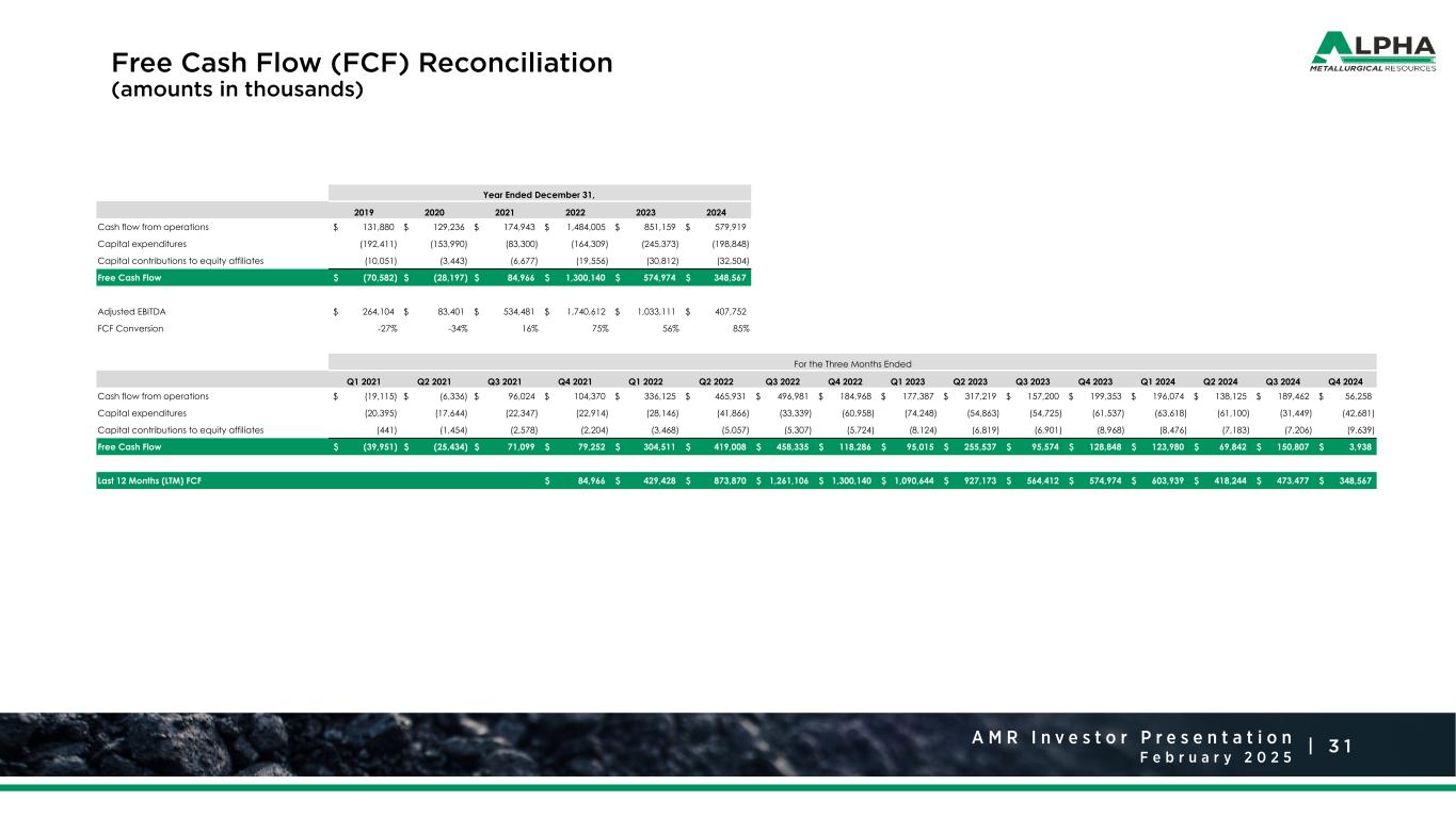 3 1A M R R a t i n g s A g e n c y P r e s e n t a t i o n J a n u a r y 2 0 2 5 |A M R I n v e s t o r F e b r Free Cash Flow (FCF) Reconciliation (amounts in thousands) 2019 2020 2021 2022 2023 2024 Cash flow from operations 131,880$ 129,236$ 174,943$ 1,484,005$ 851,159$ 579,919$ Capital expenditures (192,411) (153,990) (83,300) (164,309) (245,373) (198,848) Capital contributions to equity affiliates (10,051) (3,443) (6,677) (19,556) (30,812) (32,504) Free Cash Flow (70,582)$ (28,197)$ 84,966$ 1,300,140$ 574,974$ 348,567$ Adjusted EBITDA 264,104$ 83,401$ 534,481$ 1,740,612$ 1,033,111$ 407,752$ FCF Conversion -27% -34% 16% 75% 56% 85% Q1 2021 Q2 2021 Q3 2021 Q4 2021 Q1 2022 Q2 2022 Q3 2022 Q4 2022 Q1 2023 Q2 2023 Q3 2023 Q4 2023 Q1 2024 Q2 2024 Q3 2024 Q4 2024 Cash flow from operations (19,115)$ (6,336)$ 96,024$ 104,370$ 336,125$ 465,931$ 496,981$ 184,968$ 177,387$ 317,219$ 157,200$ 199,353$ 196,074$ 138,125$ 189,462$ 56,258$ Capital expenditures (20,395) (17,644) (22,347) (22,914) (28,146) (41,866) (33,339) (60,958) (74,248) (54,863) (54,725) (61,537) (63,618) (61,100) (31,449) (42,681) Capital contributions to equity affiliates (441) (1,454) (2,578) (2,204) (3,468) (5,057) (5,307) (5,724) (8,124) (6,819) (6,901) (8,968) (8,476) (7,183) (7,206) (9,639) Free Cash Flow (39,951)$ (25,434)$ 71,099$ 79,252$ 304,511$ 419,008$ 458,335$ 118,286$ 95,015$ 255,537$ 95,574$ 128,848$ 123,980$ 69,842$ 150,807$ 3,938$ Last 12 Months (LTM) FCF 84,966$ 429,428$ 873,870$ 1,261,106$ 1,300,140$ 1,090,644$ 927,173$ 564,412$ 574,974$ 603,939$ 418,244$ 473,477$ 348,567$ Year Ended December 31, For the Three Months Ended