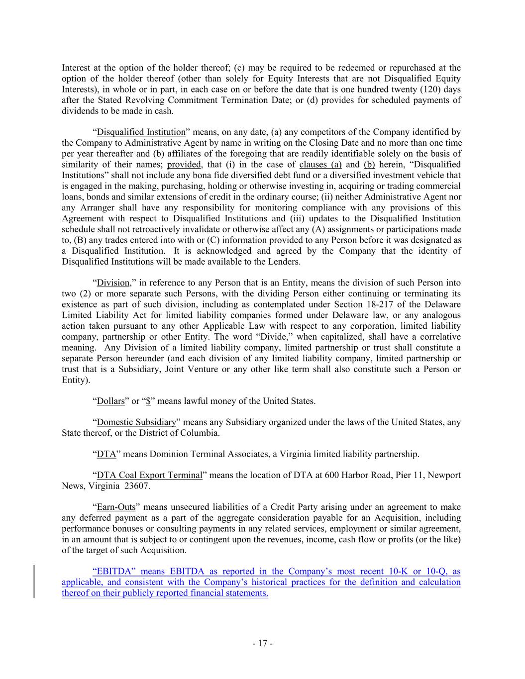 Interest at the option of the holder thereof; (c) may be required to be redeemed or repurchased at the option of the holder thereof (other than solely for Equity Interests that are not Disqualified Equity Interests), in whole or in part, in each case on or before the date that is one hundred twenty (120) days after the Stated Revolving Commitment Termination Date; or (d) provides for scheduled payments of dividends to be made in cash. “Disqualified Institution” means, on any date, (a) any competitors of the Company identified by the Company to Administrative Agent by name in writing on the Closing Date and no more than one time per year thereafter and (b) affiliates of the foregoing that are readily identifiable solely on the basis of similarity of their names; provided, that (i) in the case of clauses (a) and (b) herein, “Disqualified Institutions” shall not include any bona fide diversified debt fund or a diversified investment vehicle that is engaged in the making, purchasing, holding or otherwise investing in, acquiring or trading commercial loans, bonds and similar extensions of credit in the ordinary course; (ii) neither Administrative Agent nor any Arranger shall have any responsibility for monitoring compliance with any provisions of this Agreement with respect to Disqualified Institutions and (iii) updates to the Disqualified Institution schedule shall not retroactively invalidate or otherwise affect any (A) assignments or participations made to, (B) any trades entered into with or (C) information provided to any Person before it was designated as a Disqualified Institution. It is acknowledged and agreed by the Company that the identity of Disqualified Institutions will be made available to the Lenders. “Division,” in reference to any Person that is an Entity, means the division of such Person into two (2) or more separate such Persons, with the dividing Person either continuing or terminating its existence as part of such division, including as contemplated under Section 18-217 of the Delaware Limited Liability Act for limited liability companies formed under Delaware law, or any analogous action taken pursuant to any other Applicable Law with respect to any corporation, limited liability company, partnership or other Entity. The word “Divide,” when capitalized, shall have a correlative meaning. Any Division of a limited liability company, limited partnership or trust shall constitute a separate Person hereunder (and each division of any limited liability company, limited partnership or trust that is a Subsidiary, Joint Venture or any other like term shall also constitute such a Person or Entity). “Dollars” or “$” means lawful money of the United States. “Domestic Subsidiary” means any Subsidiary organized under the laws of the United States, any State thereof, or the District of Columbia. “DTA” means Dominion Terminal Associates, a Virginia limited liability partnership. “DTA Coal Export Terminal” means the location of DTA at 600 Harbor Road, Pier 11, Newport News, Virginia 23607. “Earn-Outs” means unsecured liabilities of a Credit Party arising under an agreement to make any deferred payment as a part of the aggregate consideration payable for an Acquisition, including performance bonuses or consulting payments in any related services, employment or similar agreement, in an amount that is subject to or contingent upon the revenues, income, cash flow or profits (or the like) of the target of such Acquisition. “EBITDA” means EBITDA as reported in the Company’s most recent 10-K or 10-Q, as applicable, and consistent with the Company’s historical practices for the definition and calculation thereof on their publicly reported financial statements. - 17 -