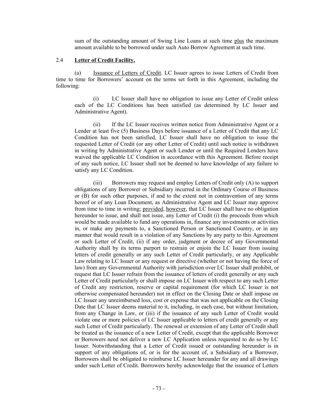 sum of the outstanding amount of Swing Line Loans at such time plus the maximum amount available to be borrowed under such Auto Borrow Agreement at such time. 2.4 Letter of Credit Facility. (a) Issuance of Letters of Credit. LC Issuer agrees to issue Letters of Credit from time to time for Borrowers’ account on the terms set forth in this Agreement, including the following: (i) LC Issuer shall have no obligation to issue any Letter of Credit unless each of the LC Conditions has been satisfied (as determined by LC Issuer and Administrative Agent). (ii) If the LC Issuer receives written notice from Administrative Agent or a Lender at least five (5) Business Days before issuance of a Letter of Credit that any LC Condition has not been satisfied, LC Issuer shall have no obligation to issue the requested Letter of Credit (or any other Letter of Credit) until such notice is withdrawn in writing by Administrative Agent or such Lender or until the Required Lenders have waived the applicable LC Condition in accordance with this Agreement. Before receipt of any such notice, LC Issuer shall not be deemed to have knowledge of any failure to satisfy any LC Condition. (iii) Borrowers may request and employ Letters of Credit only (A) to support obligations of any Borrower or Subsidiary incurred in the Ordinary Course of Business or (B) for such other purposes, if and to the extent not in contravention of any terms hereof or of any Loan Document, as Administrative Agent and LC Issuer may approve from time to time in writing; provided, however, that LC Issuer shall have no obligation hereunder to issue, and shall not issue, any Letter of Credit (i) the proceeds from which would be made available to fund any operations in, finance any investments or activities in, or make any payments to, a Sanctioned Person or Sanctioned Country, or in any manner that would result in a violation of any Sanctions by any party to this Agreement or such Letter of Credit, (ii) if any order, judgment or decree of any Governmental Authority shall by its terms purport to restrain or enjoin the LC Issuer from issuing letters of credit generally or any such Letter of Credit particularly, or any Applicable Law relating to LC Issuer or any request or directive (whether or not having the force of law) from any Governmental Authority with jurisdiction over LC Issuer shall prohibit, or request that LC Issuer refrain from the issuance of letters of credit generally or any such Letter of Credit particularly or shall impose on LC Issuer with respect to any such Letter of Credit any restriction, reserve or capital requirement (for which LC Issuer is not otherwise compensated hereunder) not in effect on the Closing Date or shall impose on LC Issuer any unreimbursed loss, cost or expense that was not applicable on the Closing Date that LC Issuer deems material to it, including, in each case, but without limitation, from any Change in Law, or (iii) if the issuance of any such Letter of Credit would violate one or more policies of LC Issuer applicable to letters of credit generally or any such Letter of Credit particularly. The renewal or extension of any Letter of Credit shall be treated as the issuance of a new Letter of Credit, except that the applicable Borrower or Borrowers need not deliver a new LC Application unless requested to do so by LC Issuer. Notwithstanding that a Letter of Credit issued or outstanding hereunder is in support of any obligations of, or is for the account of, a Subsidiary of a Borrower, Borrowers shall be obligated to reimburse LC Issuer hereunder for any and all drawings under such Letter of Credit. Borrowers hereby acknowledge that the issuance of Letters - 73 -