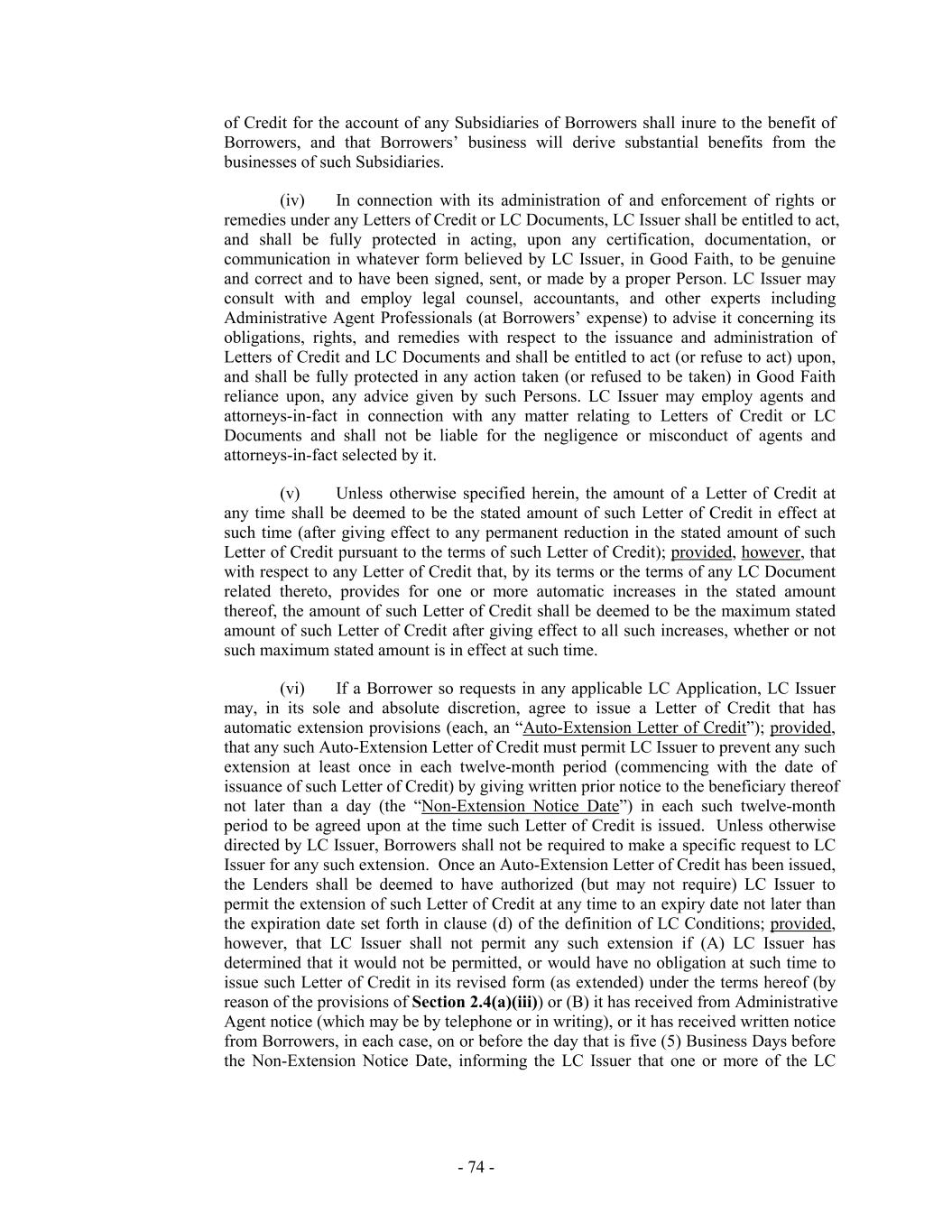 of Credit for the account of any Subsidiaries of Borrowers shall inure to the benefit of Borrowers, and that Borrowers’ business will derive substantial benefits from the businesses of such Subsidiaries. (iv) In connection with its administration of and enforcement of rights or remedies under any Letters of Credit or LC Documents, LC Issuer shall be entitled to act, and shall be fully protected in acting, upon any certification, documentation, or communication in whatever form believed by LC Issuer, in Good Faith, to be genuine and correct and to have been signed, sent, or made by a proper Person. LC Issuer may consult with and employ legal counsel, accountants, and other experts including Administrative Agent Professionals (at Borrowers’ expense) to advise it concerning its obligations, rights, and remedies with respect to the issuance and administration of Letters of Credit and LC Documents and shall be entitled to act (or refuse to act) upon, and shall be fully protected in any action taken (or refused to be taken) in Good Faith reliance upon, any advice given by such Persons. LC Issuer may employ agents and attorneys-in-fact in connection with any matter relating to Letters of Credit or LC Documents and shall not be liable for the negligence or misconduct of agents and attorneys-in-fact selected by it. (v) Unless otherwise specified herein, the amount of a Letter of Credit at any time shall be deemed to be the stated amount of such Letter of Credit in effect at such time (after giving effect to any permanent reduction in the stated amount of such Letter of Credit pursuant to the terms of such Letter of Credit); provided, however, that with respect to any Letter of Credit that, by its terms or the terms of any LC Document related thereto, provides for one or more automatic increases in the stated amount thereof, the amount of such Letter of Credit shall be deemed to be the maximum stated amount of such Letter of Credit after giving effect to all such increases, whether or not such maximum stated amount is in effect at such time. (vi) If a Borrower so requests in any applicable LC Application, LC Issuer may, in its sole and absolute discretion, agree to issue a Letter of Credit that has automatic extension provisions (each, an “Auto-Extension Letter of Credit”); provided, that any such Auto-Extension Letter of Credit must permit LC Issuer to prevent any such extension at least once in each twelve-month period (commencing with the date of issuance of such Letter of Credit) by giving written prior notice to the beneficiary thereof not later than a day (the “Non-Extension Notice Date”) in each such twelve-month period to be agreed upon at the time such Letter of Credit is issued. Unless otherwise directed by LC Issuer, Borrowers shall not be required to make a specific request to LC Issuer for any such extension. Once an Auto-Extension Letter of Credit has been issued, the Lenders shall be deemed to have authorized (but may not require) LC Issuer to permit the extension of such Letter of Credit at any time to an expiry date not later than the expiration date set forth in clause (d) of the definition of LC Conditions; provided, however, that LC Issuer shall not permit any such extension if (A) LC Issuer has determined that it would not be permitted, or would have no obligation at such time to issue such Letter of Credit in its revised form (as extended) under the terms hereof (by reason of the provisions of Section 2.4(a)(iii)) or (B) it has received from Administrative Agent notice (which may be by telephone or in writing), or it has received written notice from Borrowers, in each case, on or before the day that is five (5) Business Days before the Non-Extension Notice Date, informing the LC Issuer that one or more of the LC - 74 -