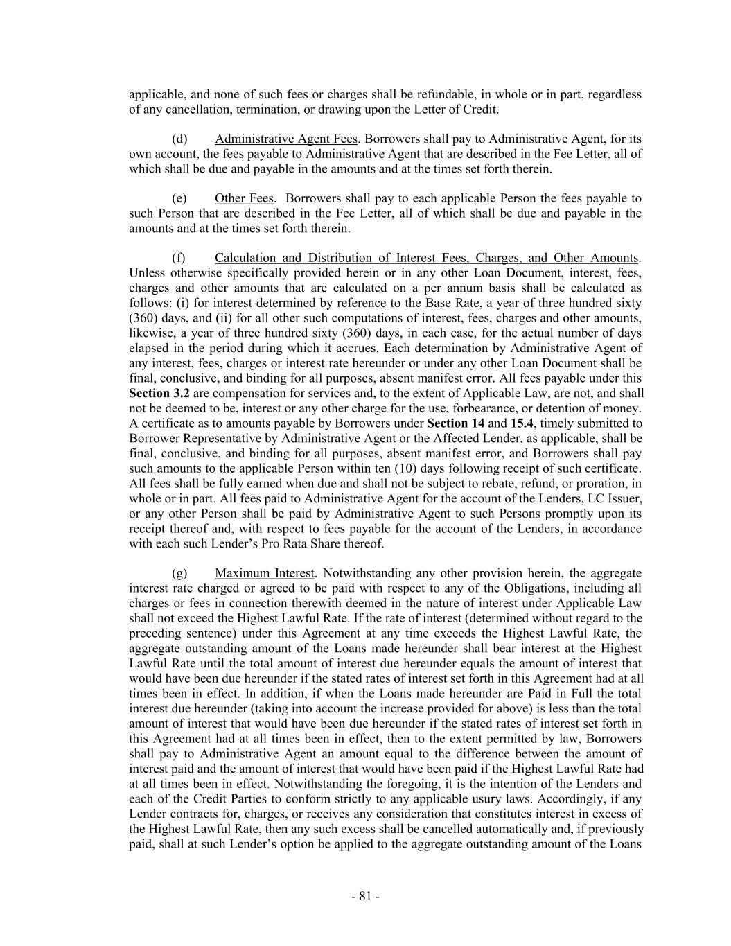 applicable, and none of such fees or charges shall be refundable, in whole or in part, regardless of any cancellation, termination, or drawing upon the Letter of Credit. (d) Administrative Agent Fees. Borrowers shall pay to Administrative Agent, for its own account, the fees payable to Administrative Agent that are described in the Fee Letter, all of which shall be due and payable in the amounts and at the times set forth therein. (e) Other Fees. Borrowers shall pay to each applicable Person the fees payable to such Person that are described in the Fee Letter, all of which shall be due and payable in the amounts and at the times set forth therein. (f) Calculation and Distribution of Interest Fees, Charges, and Other Amounts. Unless otherwise specifically provided herein or in any other Loan Document, interest, fees, charges and other amounts that are calculated on a per annum basis shall be calculated as follows: (i) for interest determined by reference to the Base Rate, a year of three hundred sixty (360) days, and (ii) for all other such computations of interest, fees, charges and other amounts, likewise, a year of three hundred sixty (360) days, in each case, for the actual number of days elapsed in the period during which it accrues. Each determination by Administrative Agent of any interest, fees, charges or interest rate hereunder or under any other Loan Document shall be final, conclusive, and binding for all purposes, absent manifest error. All fees payable under this Section 3.2 are compensation for services and, to the extent of Applicable Law, are not, and shall not be deemed to be, interest or any other charge for the use, forbearance, or detention of money. A certificate as to amounts payable by Borrowers under Section 14 and 15.4, timely submitted to Borrower Representative by Administrative Agent or the Affected Lender, as applicable, shall be final, conclusive, and binding for all purposes, absent manifest error, and Borrowers shall pay such amounts to the applicable Person within ten (10) days following receipt of such certificate. All fees shall be fully earned when due and shall not be subject to rebate, refund, or proration, in whole or in part. All fees paid to Administrative Agent for the account of the Lenders, LC Issuer, or any other Person shall be paid by Administrative Agent to such Persons promptly upon its receipt thereof and, with respect to fees payable for the account of the Lenders, in accordance with each such Lender’s Pro Rata Share thereof. (g) Maximum Interest. Notwithstanding any other provision herein, the aggregate interest rate charged or agreed to be paid with respect to any of the Obligations, including all charges or fees in connection therewith deemed in the nature of interest under Applicable Law shall not exceed the Highest Lawful Rate. If the rate of interest (determined without regard to the preceding sentence) under this Agreement at any time exceeds the Highest Lawful Rate, the aggregate outstanding amount of the Loans made hereunder shall bear interest at the Highest Lawful Rate until the total amount of interest due hereunder equals the amount of interest that would have been due hereunder if the stated rates of interest set forth in this Agreement had at all times been in effect. In addition, if when the Loans made hereunder are Paid in Full the total interest due hereunder (taking into account the increase provided for above) is less than the total amount of interest that would have been due hereunder if the stated rates of interest set forth in this Agreement had at all times been in effect, then to the extent permitted by law, Borrowers shall pay to Administrative Agent an amount equal to the difference between the amount of interest paid and the amount of interest that would have been paid if the Highest Lawful Rate had at all times been in effect. Notwithstanding the foregoing, it is the intention of the Lenders and each of the Credit Parties to conform strictly to any applicable usury laws. Accordingly, if any Lender contracts for, charges, or receives any consideration that constitutes interest in excess of the Highest Lawful Rate, then any such excess shall be cancelled automatically and, if previously paid, shall at such Lender’s option be applied to the aggregate outstanding amount of the Loans - 81 -