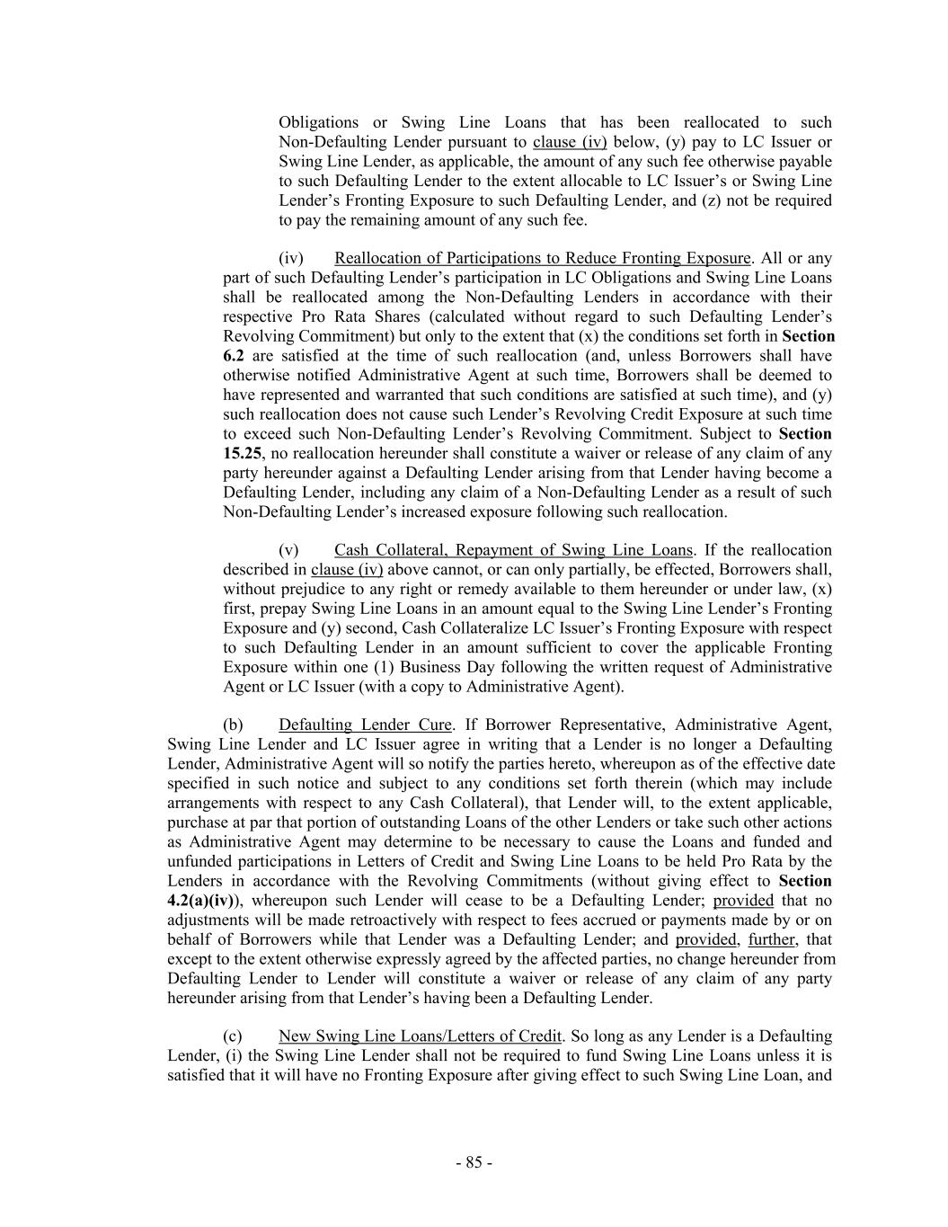 Conditions is not then satisfied, and in each such case directing LC Issuer not to permit such extension. (vii) Unless otherwise expressly set forth in any LC Document or otherwise expressly agreed in writing by the LC Issuer and Borrowers when a Letter of Credit is issued, (i) the rules of the ISP shall apply to each Letter of Credit and (ii) the rules of the Uniform Customs and Practice for Documentary Credits, as most recently published by the International Chamber of Commerce at the time of issuance shall apply to each commercial Letter of Credit. (viii) In the event of any conflict between the terms of this Agreement and the terms of any LC Document, the terms of this Agreement shall control, unless otherwise agreed by Borrower Representative, Administrative Agent and LC Issuer. (ix) Without limitation of the foregoing provisions, in the event that any Lender is at such time a Defaulting Lender, the LC Issuer shall have no obligation to issue any Letter of Credit unless LC Issuer has entered into arrangements satisfactory to LC Issuer (in its discretion) with Borrowers or such Defaulting Lender to eliminate such LC Issuer’s Fronting Exposure with respect to such Defaulting Lender (after giving effect to any Cash Collateral provided by the Defaulting Lender), including by Cash Collateralizing such Defaulting Lender’s Pro Rata Share of the outstanding amount of the LC Obligations in a manner satisfactory to LC Issuer and Administrative Agent. (b) Reimbursement; Participations. (i) On the date that LC Issuer honors any draw under a Letter of Credit (each such date, a “Reimbursement Date”), Borrowers shall reimburse LC Issuer on such date the amount paid by LC Issuer on account of such draw, together with interest from the Reimbursement Date until paid by Borrowers (at the interest rate prescribed therefor in clause (v) below). The obligation of Borrowers to reimburse LC Issuer for any draw made under a Letter of Credit is absolute, unconditional, and irrevocable, and Borrowers shall make such reimbursement without regard to any lack of validity or enforceability of such Letter of Credit or the existence of any claim, counterclaim, right of setoff, charge back, discount, defense, qualification, exception or other right Borrowers may have at any time against the beneficiary of such Letter of Credit. On each Reimbursement Date, to facilitate their foregoing reimbursement obligations, Borrowers shall be deemed to have requested a Borrowing of Base Rate Revolving Loans in an amount necessary to pay the amounts due to LC Issuer on such date (regardless of whether Borrower Representative submits a Notice of Borrowing therefor), and each Lender shall fund its Pro Rata Share of such Borrowing, without claim, counterclaim, right of setoff, charge back, discount, defense, qualification, or exception, and regardless of whether the Commitments have terminated, an Over Advance exists or any condition precedent to the making of Loans has not been satisfied. (ii) Upon the issuance of a Letter of Credit, each Lender shall be deemed to have irrevocably and unconditionally purchased from LC Issuer, without recourse or warranty, an undivided interest and participation in all LC Obligations relating to such Letter of Credit in an amount equal to such Lender’s Pro Rata Share thereof. If LC Issuer honors any draw under a Letter of Credit and Borrowers do not reimburse the amount thereof on the Reimbursement Date, Administrative Agent (at LC Issuer’s request) shall promptly notify Lenders, and each Lender shall promptly (within one (1) Business Day) - 75 -