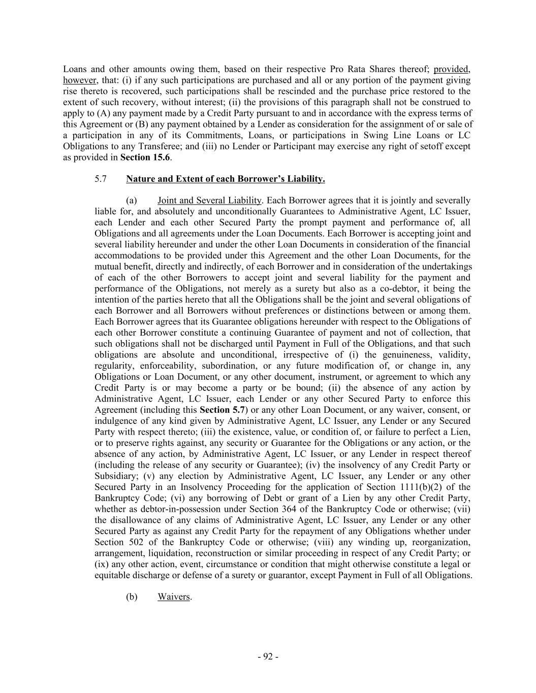 (iii) Unless otherwise directed in writing by the Required Lenders, Administrative Agent may require Lenders to honor requests by Borrowers for Over Advance Loans (in which event, and notwithstanding anything to the contrary set forth in this Agreement, Lenders shall continue to make Revolving Loans up to their Pro Rata Share of the Revolving Commitments) and to forbear from requiring Borrowers to cure an Over Advance immediately, if (A) the Over Advance does not continue for a period of more than thirty (30) consecutive days, following which no new Over Advance exists for at least thirty (30) consecutive days before another Over Advance exists, (B) the amount of the Aggregate Revolving Obligations outstanding at any time does not exceed the aggregate of the Revolving Commitments at such time, (C) the Revolving Credit Exposure of any individual Lender at any time does not exceed such individual Lender’s Revolving Commitment, and (D) the Over Advance, when aggregated with all other Over Advances then outstanding, does not exceed five percent (5%) of the aggregate Revolving Commitments. (iv) Neither the funding of any Over Advance Loan nor the continued existence of an Over Advance shall constitute any waiver by Administrative Agent or any Lender of any Default or Event of Default that may exist at the time any Over Advance Loan is made or that is caused thereby. Each Lender’s obligations under this Section 2.1(d) are absolute, unconditional, and irrevocable and are not subject to any claim, counterclaim, right of setoff, charge back, discount, defense, qualification, or exception, and each Lender shall perform such obligations, as applicable, regardless of whether the Commitments have terminated, an Over Advance exists or any condition precedent to the making of Loans has not been satisfied. (v) All Over Advance Loans shall be made as Base Rate Revolving Loans. (vi) The provisions of this Section 2.1(d) are solely for the benefit of Administrative Agent and Lenders, and in no event shall any Borrower or any other Credit Party be deemed to be a third party beneficiary of this Section 2.1(d) or be authorized or permitted to, or have any standing to, rely on or enforce any of the provisions of this Section 2.1(d). (e) Protective Advances. Following a Default or Event of Default, Administrative Agent may, in its discretion, make one or more Revolving Loans to preserve, protect, or defend any Collateral or to increase or improve the likelihood of collecting or obtaining repayment of any Obligations, in each case, if Administrative Agent determines in its discretion that doing so is necessary or desirable (a “Protective Advance”). Administrative Agent may make a Protective Advance without regard to Excess Availability or the satisfaction of any condition precedent to the making of Loans, unless (A) the Required Lenders have, by written notice to Administrative Agent, revoked Administrative Agent’s authority to do so or (B) Administrative Agent has actual knowledge that, after giving effect thereto, the aggregate outstanding principal amount of all Loans made as Protective Advances (i) would exceed five percent (5%) of the aggregate Revolving Commitments or (ii) would cause either the amount of the Aggregate Revolving Obligations outstanding to exceed the aggregate amount of the Revolving Commitments at such time or any individual Lender’s Revolving Credit Exposure to exceed such individual Lender’s Revolving Commitment at such time. If the terms of the foregoing clauses (A) and (B) above are not applicable, Administrative Agent’s determination that funding of a Protective Advance is appropriate shall be conclusive. Each Lender shall participate on a Pro Rata basis in each Protective Advance so long as by doing so such Lender’s Revolving Credit Exposure would not exceed such Lender’s Revolving Commitment at such time The provisions of this Section 2.1(e) - 68 -