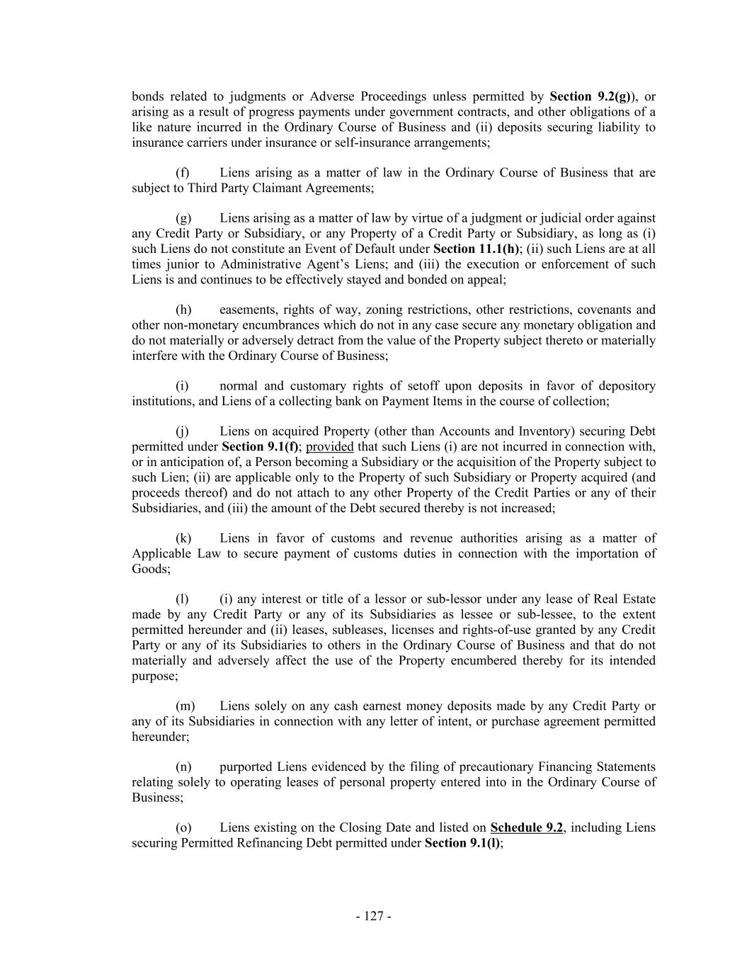Table of Contents SECTION 1. DEFINITIONS; RULES OF CONSTRUCTION - 1 - 1.1 Definitions - 1 - 1.2 Accounting Terms - 5862 - 1.3 Uniform Commercial Code - 5863 - 1.4 Rules of Construction - 5963 - SECTION 2. THE CREDIT FACILITIES - 6065 - 2.1 Revolving Commitment. - 6065 - 2.2 [Reserved]. - 6368 - 2.3 Swing Line Loans; Settlement. - 6368 - 2.4 Letter of Credit Facility. - 6671 - SECTION 3. INTEREST, FEES, AND CHARGES - 7175 - 3.1 Interest - 7175 - 3.2 Fees. - 7377 - SECTION 4. LOAN ADMINISTRATION - 7579 - 4.1 Manner of Borrowing and Funding Revolving Loans. - 7579 - 4.2 Defaulting Lender. - 7681 - 4.3 Borrower Representative - 7983 - 4.4 One Obligation - 7984 - 4.5 Effect of Termination - 7984 - 4.6 Cash Collateral - 8084 - 4.7 Borrowing Base and Reserves - 8085 - SECTION 5. PAYMENTS - 8185 - 5.1 General Payment Provisions - 8185 - 5.2 Repayment of Revolving Loans. - 8186 - 5.3 [Reserved] - 8287 - 5.4 Payment of Other Obligations - 8287 - 5.5 Post-Default Allocation of Payments. - 8287 - 5.6 Sharing of Payments - 8489 - 5.7 Nature and Extent of each Borrower’s Liability. - 8589 - SECTION 6. CONDITIONS PRECEDENT - 8893 - 6.1 Conditions Precedent to Initial Loans - 8993 - 6.2 Conditions Precedent to All Extensions of Credit - 9196 - SECTION 7. REPRESENTATIONS AND WARRANTIES - 9297 - 7.1 Organization and Qualification - 9297 - 7.2 Power and Authority - 9397 - 7.3 Enforceability - 9398 - 7.4 Capital Structure - 9398 - 7.5 Title to Properties; Priority of Liens - 9498 - 7.6 Licenses and Permits - 9498 - 7.7 Real Estate - 9499 - 7.8 Casualties; Taking of Properties; etc - 9499 - - i -