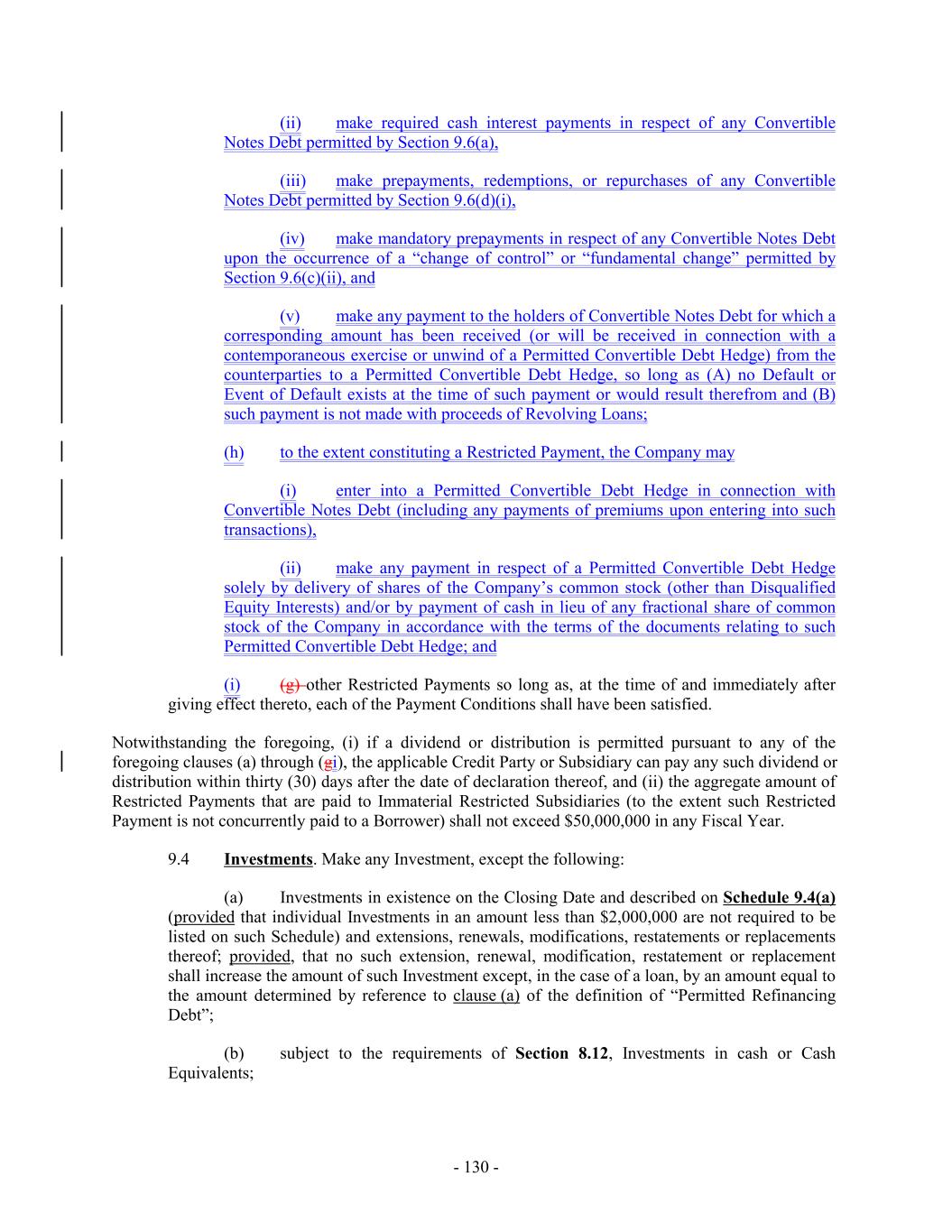 (h) Administrative Agent and the Senior Notes Agent shall have entered into the Approved Intercreditor Agreement, and Credit Parties shall acknowledge such Approved Intercreditor Agreement, as of the Permitted Bond Transaction Effective Date; (i) the Senior Notes Debt shall be secured by first priority Liens on the Term Priority Collateral and second priority Liens on ABL Priority Collateral; (j) Credit Parties shall not have consummated a Permitted Convertible Debt Transaction on or before the proposed effective date of the Permitted Bond Transaction; and (k) the Senior Notes Debt shall have no amortization and no scheduled principal payments prior to its stated maturity date. “Permitted Bond Transaction Effective Date” means, subject to satisfaction of the conditions set forth in the definition of Permitted Bond Transaction, the date on which the Permitted Bond Transaction is consummated. “Permitted Convertible Debt Hedge” means one or more call or capped call options, bond hedge overlays, call spreads, or other substantively equivalent derivative transaction relating to the Company’s common stock (or other securities or property following a merger event or other change of the Equity Interests of the Company) entered into by the Company in connection with a Permitted Convertible Debt Transaction on customary terms for hedging and derivative transactions of such type so long as the form documentation related to such transaction is in form and substance reasonably satisfactory to Administrative Agent. “Permitted Convertible Debt Transaction” means the issuance of senior unsecured convertible notes pursuant to an indenture entered into by Credit Parties after the First Amendment Date, which notes are convertible into a fixed number of shares of common stock of the Company (or other securities or property following a merger event or other change of the Equity Interests of the Company, or other number of shares of common stock of the Company resulting from customary anti-dilution, value-transfer protection, make-whole fundamental change, price protection or similar conversion rate adjustments) other than Disqualified Equity Interests, and cash in lieu of fractional shares of common stock of the Company, so long as each of the following conditions is satisfied prior to, or upon such transaction being consummated, as determined by Administrative Agent in its reasonable discretion: (a) Administrative Agent shall have received at least thirty (30) days’ written notice of such transaction prior to consummation thereof by the Credit Parties party thereto; (b) the principal amount of the Debt incurred in connection with such transaction shall not exceed $500,000,000 in the aggregate; (c) [reserved]; (d) no Default or Event of Default shall exist or result therefrom; (e) [reserved]; (f) the stated maturity date of the Debt incurred in connection with such transaction shall be no less than five (5) years after the consummation thereof; (g) the Credit Parties shall provide to Administrative Agent drafts of the documentation (including a draft of any offering memorandum, indenture, and form of note) with respect to such - 48 -