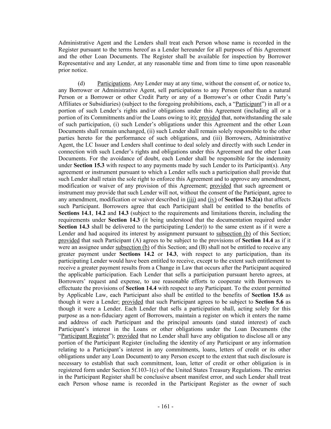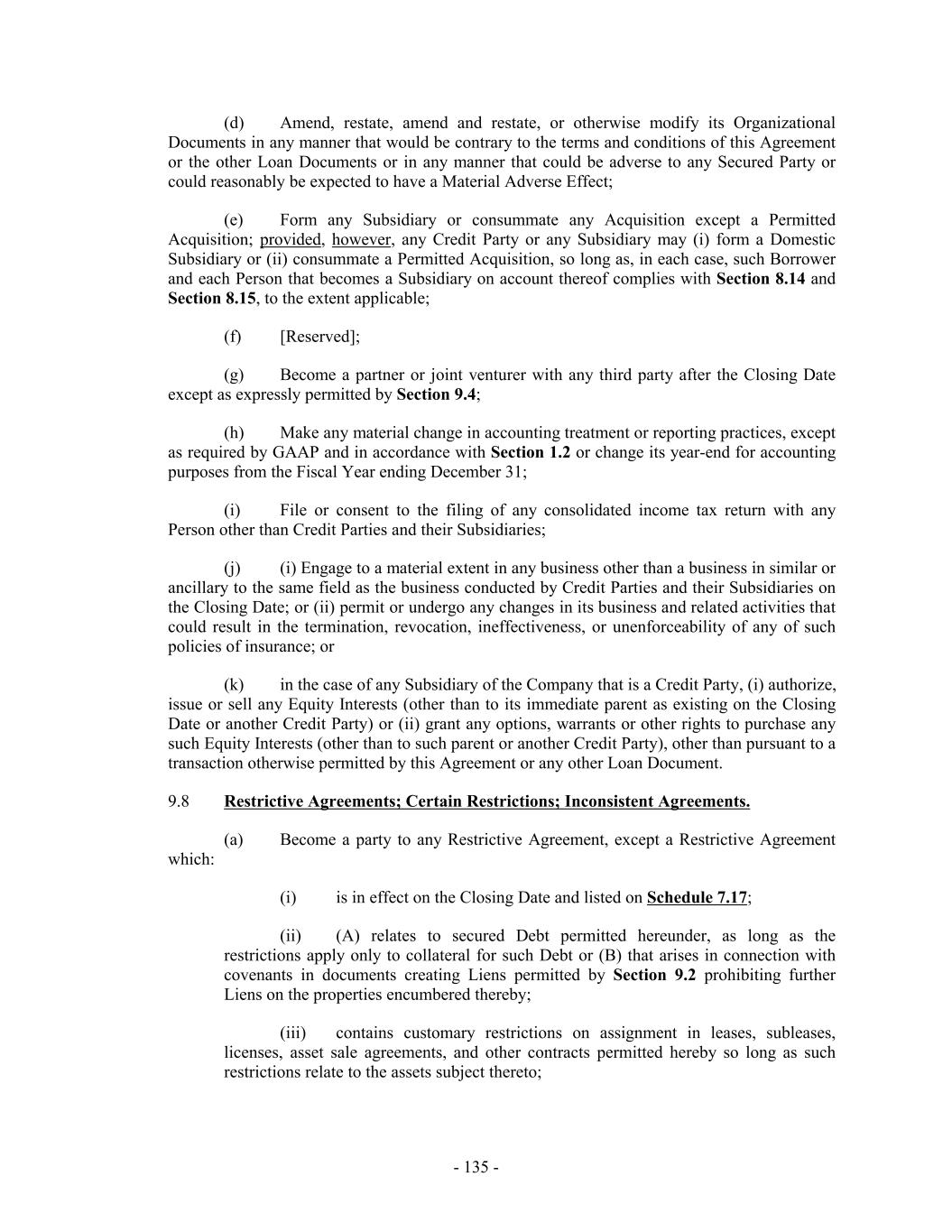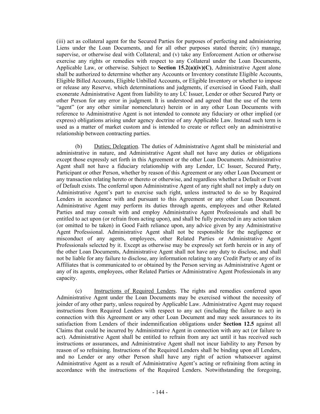 9.9 Affiliate Transactions - 126132 - 9.10 Plans - 127133 - 9.11 Sales and Leasebacks - 127134 - 9.12 Certain Agreements - 128134 - 9.13 Disqualified Equity Interests - 128134 - SECTION 10. FINANCIAL COVENANTS - 128134 - 10.1 Financial Covenants - 128134 - SECTION 11. EVENTS OF DEFAULT; REMEDIES UPON DEFAULT - 128134 - 11.1 Events of Default - 128134 - 11.2 Remedies upon Default. - 131137 - 11.3 License - 132138 - 11.4 Receiver - 132139 - 11.5 Deposits; Insurance - 132139 - 11.6 Remedies Cumulative - 132139 - SECTION 12. ADMINISTRATIVE AGENT - 133139 - 12.1 Appointment, Authority, and Duties of Administrative Agent; Professionals. - 133139 - 12.2 Guarantors and Collateral; Intercreditor AgreementsAgreement; and Field Examination Reports. - 134141 - 12.3 Reliance By Administrative Agent - 136143 - 12.4 Action Upon Default - 136144 - 12.5 Indemnification of Administrative Agent Indemnitees - 136144 - 12.6 Limitation on Responsibilities of Administrative Agent - 137144 - 12.7 Resignation; Successor Administrative Agent - 137145 - 12.8 Separate Collateral Agent - 138146 - 12.9 Due Diligence and Non-Reliance - 138146 - 12.10 Remittance of Payments. - 139146 - 12.11 Administrative Agent in its Individual Capacity - 143150 - 12.12 Administrative Agent Titles - 143151 - 12.13 Bank Product Providers - 143151 - 12.14 No Third Party Beneficiaries - 144152 - 12.15 Certifications From Lenders and Participants; PATRIOT Act; No Reliance. - 144152 - 12.16 Bankruptcy - 145152 - SECTION 13. ASSIGNMENTS AND PARTICIPATIONS - 146153 - 13.1 Successors and Assigns. - 146153 - SECTION 14. YIELD PROTECTION - 150157 - 14.1 Making or Maintaining Term SOFR Loans - 150157 - 14.2 Increased Costs. - 154161 - 14.3 Taxes. - 155162 - 14.4 Mitigation Obligations; Designation of a Different Lending Office. - 158166 - SECTION 15. MISCELLANEOUS - 159167 - 15.1 Notices. - 159167 - 15.2 Amendments. - 161169 - 15.3 Indemnity; Expenses - 164172 - 15.4 Reimbursement Obligations - 165173 - 15.5 Performance of Credit Parties’ Obligations - 165173 - - iii -