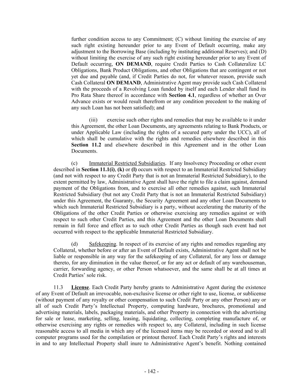 be disposed of, or to obtain or, if not required by Applicable Law, to fail to obtain consents of any Governmental Authority or other third party for the collection or disposition of Collateral to be collected or disposed of; (b) to fail to exercise collection remedies against Account Debtors, secondary obligors or other Persons obligated on Collateral or to remove Liens on or any adverse claims against, Collateral; (c) to exercise collection remedies against Account Debtors and other Persons obligated on Collateral directly or through the use of collection agencies and other collection specialists; (d) to advertise dispositions of Collateral through publications or media of general circulation, whether or not the Collateral is of a specialized nature; (e) to contact other Persons, whether or not in the same business as any Credit Party, for expressions of interest in acquiring all or any portion of the Collateral; (f) to hire one or more professional auctioneers to assist in the disposition of Collateral, whether or not the Collateral is of a specialized nature; (g) to dispose of Collateral by utilizing Internet sites that provide for the auction of assets of the types included in the Collateral or that have the reasonable capability of doing so or that match buyers and sellers of assets; (h) to dispose of assets in wholesale rather than retail markets; (i) to disclaim disposition and other warranties; (j) to purchase, at Credit Parties’ expense, insurance or credit enhancements to insure Administrative Agent against risks of loss, collection, or disposition of Collateral or to provide to Administrative Agent and the other Secured Parties a guaranteed return from the collection or disposition of Collateral; or (k) to obtain the services of other brokers, investment bankers, consultants, and other professionals to assist Administrative Agent in the collection or disposition of any of the Collateral. Each Credit Party further agrees that any sale of Collateral to a Licensor pursuant to the terms of a License is sufficient to constitute a commercially reasonable sale (including as to method, terms, manner, and time). Each Credit Party acknowledges that the purpose of this Section is to provide non-exhaustive indications of what actions or omissions by Administrative Agent would not be commercially unreasonable in the exercise by Administrative Agent of rights and remedies against the Collateral and that other actions or omissions by Administrative Agent shall not be deemed to be commercially unreasonable solely on account of not being expressly indicated in this Section. Without limitation of the foregoing, nothing contained in this Section shall be construed to grant any rights to any Credit Party or to impose any duties on Administrative Agent that would not have been granted or imposed by this Agreement, any other Loan Document, any agreement related to Bank Products, or by Applicable Law in the absence of this Section. Section 17. Miscellaneous; Governing Law; Submission to Jurisdiction. All terms of Section 15 of the Credit Agreement (Miscellaneous), as such Section 15 is in effect on the Closing Date, and as it may be modified or amended from time to time hereafter in accordance with Section 15.2 thereof, are herewith incorporated by reference into this Agreement and made an integral part hereof, as fully and completely as if set forth verbatim herein, with specific respect to this Agreement, such that each reference therein to “this Agreement” (and words of similar import) in said Section 15 shall mean and refer, for purposes hereof, to this Agreement, mutatis mutandis, unless and except to the extent otherwise expressly provided herein. THIS AGREEMENT, UNLESS OTHERWISE SPECIFIED BY THE TERMS HEREOF OR UNLESS THE LAWS OF ANOTHER JURISDICTION MAY, BY REASON OF MANDATORY PROVISIONS OF SUCH LAW, GOVERN THE PERFECTION, PRIORITY, OR ENFORCEMENT OF SECURITY INTERESTS IN ANY COLLATERAL, SHALL BE GOVERNED BY THE LAWS OF THE JURISDICTION STATE, WITHOUT GIVING EFFECT TO ANY CONFLICT OF LAW PRINCIPLES OR OTHER RULE OF LAW THAT WOULD CAUSE THE APPLICATION OF THE LAW OF ANY JURISDICTION OTHER THAN THE LAW OF THE JURISDICTION STATE (BUT GIVING EFFECT TO FEDERAL LAWS RELATING TO NATIONAL BANKS). EACH CREDIT PARTY HEREBY CONSENTS TO THE NON-EXCLUSIVE JURISDICTION OF THE COURTS OF THE JURISDICTION STATE AND THE UNITED STATES DISTRICT COURT FOR EACH DISTRICT OF THE JURISDICTION STATE, IN RESPECT OF ANY PROCEEDING, DISPUTE, OR ADVERSE PROCEEDING BASED ON, OR ARISING OUT OF, UNDER, OR IN CONNECTION WITH THIS AGREEMENT, OR ANY OF THE OTHER LOAN DOCUMENTS, OR ANY COURSE OF CONDUCT, COURSE OF DEALING, STATEMENTS - 15 -