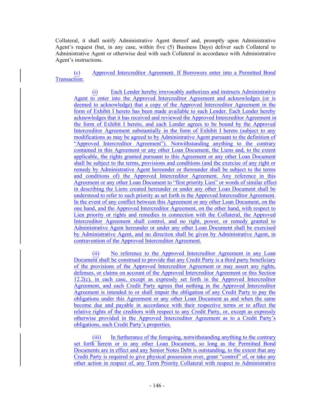 - 52 - requested by the Term Agent in writing at the expense of the Grantors (including amending any outstanding control agreements) to enable the Term Agent to obtain a first priority security interest in the Collateral. Without limiting the foregoing, the Term Agent agrees that no ABL Claimholder will have any duty or obligation first to marshal or realize upon the ABL Priority Collateral, or to sell, dispose of or otherwise realize upon all or any portion of the ABL Priority Collateral, in any manner that would maximize the return to the Term Claimholders, notwithstanding that the order and timing of any such realization, sale, disposition or liquidation may affect the amount of proceeds actually received by the Term Claimholders from such realization, sale, disposition or liquidation. (e) Upon Payment in Full of Term Priority Debt, the Term Agent shall (unless otherwise prohibited by applicable law, unless any other Person has made a demand therefor and is lawfully entitled thereto, or unless a court of competent jurisdiction otherwise directs and subject in all events to the receipt of customary indemnification of all liabilities arising therefrom) deliver the remaining tangible Pledged Collateral in its possession or control (or in the possession or control of its agents or bailees), if any, together with any necessary endorsements, first, to the ABL Agent, if any ABL Debt (or commitments to extend ABL Debt) remains outstanding as confirmed to the Term Agent in writing by the ABL Agent, and, if (x) the ABL Agent confirms that no ABL Debt (or commitments to extend ABL Debt) is outstanding and (y) the Term Agent confirms that no Term Debt (or commitments to extend Term Debt) is outstanding, second, to the Company. At such time, the Term Agent further agrees to take all other action reasonably requested by the ABL Agent in writing at the expense of the Grantors (including amending any outstanding control agreements) to enable the ABL Agent to obtain a first priority security interest in the Collateral. Without limiting the foregoing, the ABL Agent agrees that no Term Claimholder will have any duty or obligation first to marshal or realize upon the Term Priority Collateral, or to sell, dispose of or otherwise realize upon all or any portion of the Term Priority Collateral, in any manner that would maximize the return to the ABL Claimholders, notwithstanding that the order and timing of any such realization, sale, disposition or liquidation may affect the amount of proceeds actually received by the ABL Claimholders from such realization, sale, disposition or liquidation. (f) Notwithstanding anything to the contrary contained in this Agreement, any obligation of either Agent to make any delivery of Pledged Collateral to the other Agent under this Section 5 is subject to such Agent’s compliance with any (i) order of any court of competent jurisdiction with respect to such Pledged Collateral or (ii) automatic stay imposed in connection with any Insolvency Proceeding. 5.5. When Payment in Full of ABL Priority Debt or Payment in Full of Term Priority Debt Deemed to Not Have Occurred. (a) If any of the ABL Borrowers enter into any Refinancing of the ABL Debt that is intended to be secured by the ABL Priority Collateral on a first priority basis in accordance with the terms of this Agreement and the Indenture (as in effect on the date hereof), then a Payment in Full of ABL Priority Debt shall be deemed not to have occurred for all purposes of this Agreement, and the obligations under such Refinancing of such ABL Debt shall be treated as ABL Debt for all purposes of this Agreement, including for purposes of the Lien priorities and rights in respect of Collateral set forth herein, and the ABL Agent under the ABL Documents effecting such Refinancing shall be the ABL Agent for all purposes of this Agreement, so long as the ABL Agent under such ABL Documents agrees (in a writing addressed to the Term Agent) to be bound by the terms of this Agreement. (b) If the Company enters into any Refinancing of the Term Debt that is intended to be secured by the Term Priority Collateral on a first priority basis in accordance with the terms of this Agreement and the Initial ABL Credit Agreement (as in effect on the date hereof), then a Payment in Full of Term Priority Debt shall be deemed not to have occurred for all purposes of this Agreement, and the