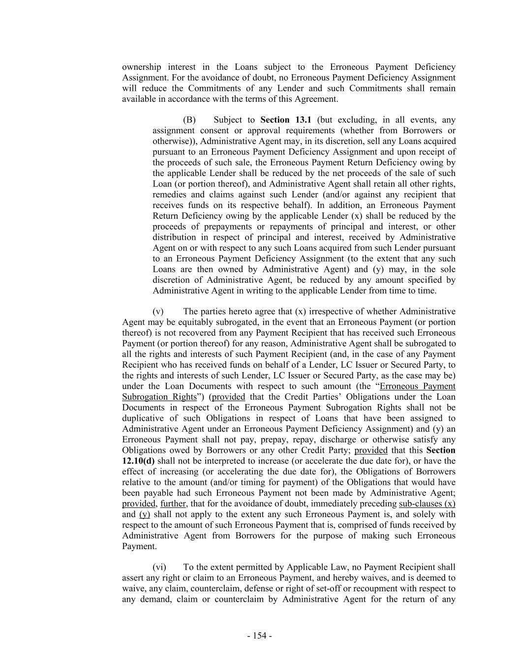 Administrator’s Website on the immediately succeeding U.S. Government Securities Business Day; provided if the published rate is subsequently corrected and provided by the SOFR Administrator or on the SOFR Administrator’s Website within the longer of one hour of the time when such rate is first published and the republication cut-off time for SOFR, if any, as specified by the SOFR Administrator in the SOFR benchmark methodology then the secured overnight financing rate for such Business Day will be subject to those corrections. “SOFR Adjustment” means 0.10% (10 basis points). “SOFR Administrator” means the Federal Reserve Bank of New York (or a successor administrator of the secured overnight financing rate). “SOFR Administrator’s Website” means the website of the Federal Reserve Bank of New York, currently at http://www.newyorkfed.org, or any successor source for the secured overnight financing rate identified as such by the SOFR Administrator from time to time. “Sold Receivables” means those Accounts originated by Borrowers or any Subsidiary of Borrowers sold or assigned to a Permitted Receivables Purchaser pursuant to a Permitted Receivables Transaction. “Solvent” means, as to any Person, that such Person (a) owns Property whose fair salable value is greater than the amount required to pay all of its Debts (including contingent, subordinated, un-matured, and unliquidated liabilities); (b) owns Property whose present fair salable value is greater than the probable total liabilities (including contingent, subordinated, un-matured, and unliquidated liabilities) of such Person as they become absolute and matured; (c) is able to pay all of its Debts as they mature; (d) has capital that is not unreasonably small for its business and is sufficient to carry on its business and transactions and all business and transactions in which it is about to engage; (e) is not “insolvent” within the meaning of Section 101(32) of the Bankruptcy Code; and (f) has not incurred (by way of assumption or otherwise) any obligations or liabilities (contingent or otherwise) under any Loan Documents, or made any conveyance in connection therewith, with actual intent to hinder, delay or defraud either present or future creditors of such Person or any of its Affiliates. For purposes of this definition, “fair salable value” means the amount that could be obtained for assets within a reasonable time, either through collection or through sale under ordinary selling conditions by a capable and diligent seller to an interested buyer who is willing (but under no compulsion) to purchase. “Specified Credit Party” means any Credit Party that is, at the time on which the Guarantee (or grant of Lien, as applicable) becomes effective with respect to a Swap Obligation, a corporation, partnership, proprietorship, organization, trust or other Entity that would not be an “eligible contract participant” under the Commodity Exchange Act at such time but for the effect of Section 5.7(f). “Specified Event of Default” means any of the following: (a) an Event of Default under Section 11.1(a); (b) a Bankruptcy Event of Default, or (c) an Event of Default under Section 10. “State Settlement Accounts” means Deposit Accounts and/or Securities Accounts required in connection with any settlements in effect on the date hereof that have been approved by Borrowers and any state or federal environmental regulatory agencies with respect to ongoing regulatory compliance obligations settled in connection with the Plan of Reorganization. “Stated Revolving Commitment Termination Date” means October 27May 4, 20272029. - 59 -