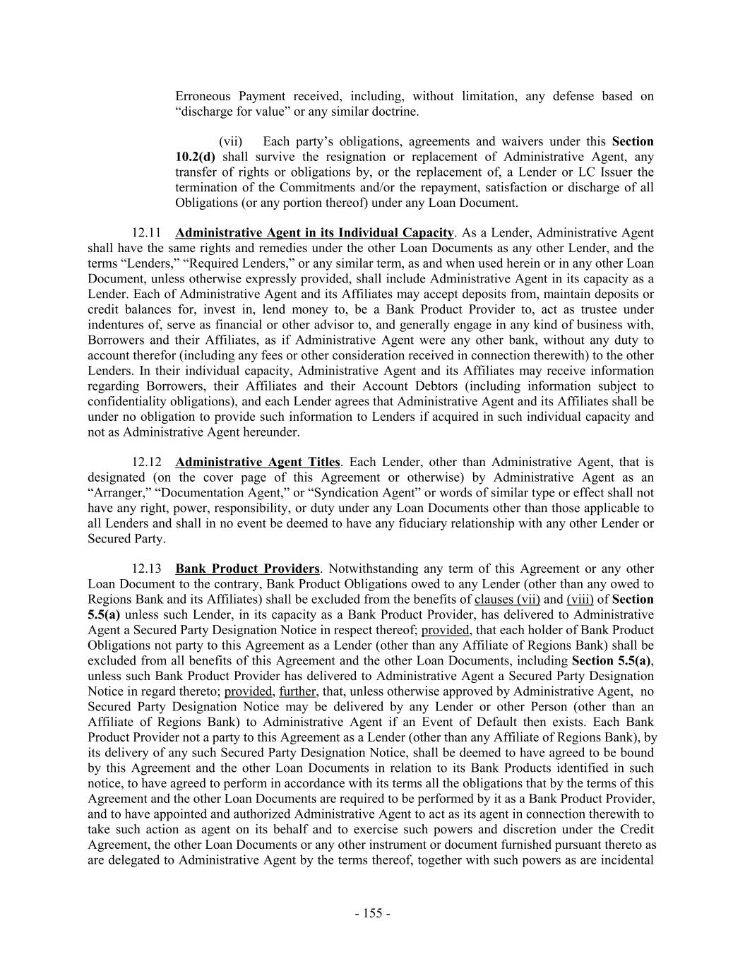 “Auto-Extension Letter of Credit” has the meaning specified in Section 2.4(a)(vi). “Available Tenor” means, as of any date of determination and with respect to the then-current Benchmark, as applicable, any tenor for such Benchmark or payment period for interest calculated with reference to such Benchmark, as applicable, that is or may be used for determining the length of an Interest Period pursuant to this Agreement as of such date. “Average Excess Availability” means, for any tested period, Excess Availability for each day of such period, divided by the number of days in such period. “Bail-In Action” means the exercise of any Write-Down and Conversion Powers by the applicable Resolution Authority in respect of the applicable Resolution Authority. “Bail-In Legislation” means (a) with respect to any EEA Member Country implementing Article 55 of Directive 2014/59/EU of the European Parliament and of the Council of the European Union, the implementing law, regulation rule or requirement for such EEA Member Country from time to time that is described in the EU Bail-In Legislation Schedule and (b) with respect to the United Kingdom, Part I of the United Kingdom Banking Act 2009 (as amended from time to time) and any other law, regulation or rule applicable in the United Kingdom relating to the resolution of unsound or failing banks, investment firms or other financial institutions or their affiliates (other than through liquidation, administration or other insolvency proceedings). “Bank Product Agreement” means any agreement between one or more Credit Parties and a Bank Product Provider evidencing the making available of any Bank Product by such Bank Product Provider to such Credit Party. The foregoing includes, without limitation, Swap Agreements. “Bank Product Obligations” means, without duplication, (a) all Debts, liabilities and other obligations of any Credit Party to any Bank Product Provider arising under, pursuant to or in connection with Bank Products, and (b) without duplication, all amounts that Administrative Agent or any Lender is obligated to pay to a Bank Product Provider as a result of Administrative Agent or such Lender purchasing participations from, or executing guarantees or indemnities or reimbursement obligations to, a Bank Product Provider with respect to any Bank Products provided by such Bank Product Provider to a Credit Party or any of its Subsidiaries. “Bank Product Provider” means (a) any of Regions Bank and its Affiliates, and (b) any other Person that (i) at the time it enters into a Bank Product Agreement, is a Lender or an Affiliate of a Lender, or (ii) in the case of a Bank Product Agreement in effect on or prior to the Closing Date, is, as of the Closing Date or becomes, within thirty (30) days thereafter, a Lender or an Affiliate of a Lender. For purposes hereof, the term “Lender” shall be deemed to include Administrative Agent. “Bank Product Reserve” means an amount determined from time to time by Administrative Agent in its Reasonable Credit Judgment as a Reserve for Bank Product Obligations. “Bank Products” means all bank, banking, financial, and other similar or related products, services, and facilities offered or provided by any Bank Product Provider to any Credit Party, including (a) merchant card services, credit or stored value cards and corporate purchasing cards; (b) cash management, treasury, and related products and services, including depository and checking services, Deposit Accounts (whether operating, money market, investment, collections, payroll, trust, disbursement, or other Deposit Accounts), Securities Accounts, automated clearinghouse (“ACH”) transfers of funds and any other ACH services, remote deposit capture, lockboxes, account reconciliation and information reporting, controlled disbursements, wire and other electronic funds transfers, e-payable, - 6 -