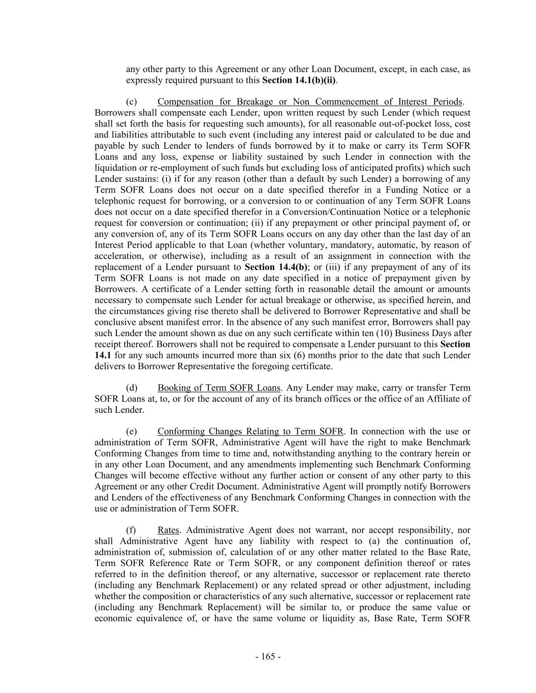 conflict with any such treaty, governmental rule, regulation, guideline or order not having the force of law even though the failure to comply therewith would not be unlawful), or (ii) any successor administrator of the published screen rate for such Benchmark or a Governmental Authority having jurisdiction over Administrative Agent or the administrator of such Benchmark has made a public statement establishing a specific date (whether expressly or by virtue of such public statement) after which an Available Tenor of such Benchmark or the published screen rate for such Benchmark shall or will no longer be representative or made available, or used for determining the interest rate of loans, or shall or will otherwise cease, provided that, at the time of such statement, there is no successor administrator that is satisfactory to Administrative Agent, that will continue to provide such representative interest periods of such Benchmark after such specific date, or (iii) has become impracticable, as a result of contingencies occurring after the date hereof which materially and adversely affect the ability of a Lender to make, maintain or continue its Loans at the then-current Benchmark (including, without limitation, because the published screen rate for such Benchmark in any relevant tenor is not available or published on a current basis and such circumstances are unlikely to be temporary) or (iv) the then-current Benchmark (including any related mathematical or other adjustments thereto) will not adequately and fairly reflect the cost to such Lenders of making, funding or maintaining its Loans at the then-current Benchmark. For the avoidance of doubt, a “Benchmark Illegality/Impracticability Event” will be deemed to have occurred with respect to any Benchmark if a public statement or publication of information set forth above has occurred with respect to each then-current Available Tenor of such Benchmark (or the published component used in the calculation thereof). “Benchmark Replacement” means the first available alternative set forth in the order below for any payment period for interest calculated that can be determined by Administrative Agent, in each case, without any amendment to, or further action or consent of any other party to, this Agreement or any other Credit Document: (x) the sum of: (i) Daily Simple SOFR and (ii) the related Benchmark Replacement Adjustment; and (y) the sum of: (i) the alternate benchmark rate that has been selected by Administrative Agent and Borrowers giving due consideration to (A) any selection or recommendation of a replacement benchmark rate or the mechanism for determining such a rate by the Relevant Governmental Body or (B) any evolving or then-prevailing market convention for determining a benchmark rate as a replacement to the then-current Benchmark for Dollar-denominated syndicated credit facilities and (ii) the related Benchmark Replacement Adjustment. “Benchmark Replacement Adjustment” means, with respect to any replacement of the then-current Benchmark with an Unadjusted Benchmark Replacement, the spread adjustment, or method for calculating or determining such spread adjustment, (which may be a positive or negative value or zero) that has been selected by Administrative Agent and Borrowers giving due consideration to (a) any selection or recommendation of a spread adjustment, or method for calculating or determining such spread adjustment, for the replacement of such Benchmark with the applicable Unadjusted Benchmark Replacement by the Relevant Governmental Body or (b) any evolving or then-prevailing market convention for determining a spread adjustment, or method for calculating or determining such spread adjustment, for the replacement of such Benchmark with the applicable Unadjusted Benchmark Replacement for Dollar-denominated syndicated credit facilities. “Benchmark Replacement Date” has the meaning specified in Section 14.1(b)(ii). - 8 -