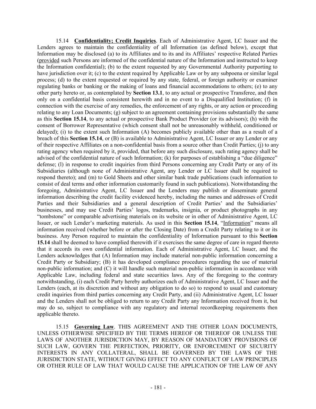 15.6 Setoff - 166173 - 15.7 Independence of Covenants; Severability - 166174 - 15.8 Cumulative Effect; Conflict of Terms - 166174 - 15.9 Counterparts - 167174 - 15.10 Fax or Other Transmission - 167174 - 15.11 Entire Agreement - 167175 - 15.12 Relationship with Lenders - 167175 - 15.13 No Advisory or Fiduciary Responsibility - 167175 - 15.14 Confidentiality; Credit Inquiries - 168176 - 15.15 Governing Law - 169177 - 15.16 Submission to Jurisdiction - 169177 - 15.17 Waivers; Limitation on Damages; Limitation on Liability. - 169177 - 15.18 Limitation on Liability; Presumptions - 171179 - 15.19 PATRIOT Act Notice, etc - 171179 - 15.20 Powers - 171179 - 15.21 No Tax Advice - 172179 - 15.22 Judgment Currency - 172179 - 15.23 Survival of Representations and Warranties, etc - 172180 - 15.24 Revival and Reinstatement of Obligations - 172180 - 15.25 Acknowledgement of and Consent to Bail-In of Affected Financial Institutions - 173180 - 15.26 Certain ERISA Matters - 173181 - 15.27 Time of Essence - 174182 - 15.28 Section Headings - 174182 - 15.29 Qualified Financial Contracts - 174182 - - iv -