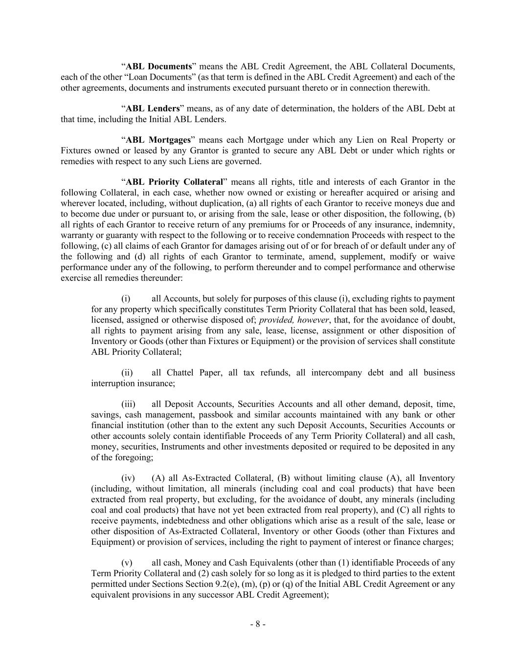 - 19 - “Priority Claimholders” means, with respect to the ABL Priority Collateral, the ABL Claimholders, and with respect to the Term Priority Collateral, the Term Claimholders. “Priority Collateral” means, with respect to the ABL Debt, all ABL Priority Collateral, and with respect to the Term Debt, all Term Priority Collateral. “Priority Debt” means, with respect to the ABL Priority Collateral, the ABL Debt, and with respect to the Term Priority Collateral, the Term Debt. “Qualified Cash” means unrestricted cash of each Grantor that is free and clear of all Liens other than the ABL Agent’s valid, perfected and first-priority Lien and any Lien in favor of the Initial Term Agent (or any then controlling Term Agent), and which cash is maintained in U.S. deposit accounts with (i) the ABL Agent and subject to a control agreement in favor of the ABL Agent, or (ii) other ABL Lenders, subject to a “blocked” control agreement in favor of the ABL Agent. “Real Property” shall mean, collectively, all right, title and interest (including any leasehold estate) in and to any and all parcels of or interests in real property owned, leased or operated by any Person, whether by lease, license or other means, together with, in each case, all improvements, fixtures, easements, hereditaments, permits and appurtenances relating thereto. “Receivables” means all of the following now owned or hereafter arising or acquired assets of any Grantor: (i) all Accounts constituting ABL Priority Collateral pursuant to clause (i) of the definition of ABL Priority Collateral; (ii) all amounts at any time payable to any Grantor in respect of the sale or other Disposition of any such Accounts; (iii) all interest, fees, late charges, penalties, collection fees and other amounts due or to become due or otherwise payable in connection with any such Accounts; (iv) all payment intangibles other than payment intangibles that constitute the identifiable proceeds of Term Priority Collateral or are otherwise excluded from being ABL Priority Collateral pursuant to clause (i) of the definition thereof; (v) all other contract rights, chattel paper, instruments or other forms of rights to payment, in each case arising from the sale, lease or other Disposition of As-Extracted Collateral, Inventory, the licensing of Inventory and the rendition of services or otherwise related to any Accounts described in clause (i) above or As-Extracted Collateral or Inventory of a Grantor (including, choses in action, causes of action or other rights and claims against carriers or shippers, rights to indemnification and identifiable proceeds thereof, and casualty or similar types of insurance, in each case relating to ABL Priority Collateral, and identifiable proceeds thereof); and (vi) all other rights to payment in which any Grantor has an interest, whether evidenced by promissory notes or otherwise, and whether consisting of Accounts, instruments, general intangibles or other rights to payment, in each case in this clause (vi) arising out of, relating to, derivative of or constituting proceeds of the assets included in the definition of ABL Priority Collateral or in the preceding clauses (i) through (v) of this definition. “Recovery” has the meaning set forth in Section 6.8. “Refinance” means, in respect of any indebtedness or any commitment to extend credit (and the documents governing such indebtedness or commitment to extend credit), to refinance, amend and restate, extend, renew, supplement, restructure, replace, refund or repay, or to issue other indebtedness or commitment to extend credit in exchange or replacement for such indebtedness, in whole or in part, whether with the same or different lenders, arrangers, or agents. “Refinanced” and “Refinancing” shall have correlative meanings. “Related Mining Assets” means (i) Coal washing and processing facilities, (ii) Coal loading and shipping facilities, including without limitation, if owned, barges and railcars, and (iii) computer and control systems utilized for operation or management of any of the foregoing.