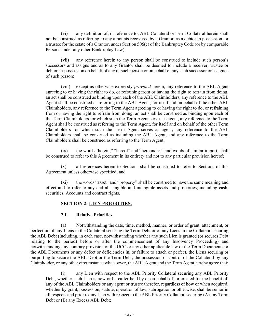 - 27 - (vi) any definition of, or reference to, ABL Collateral or Term Collateral herein shall not be construed as referring to any amounts recovered by a Grantor, as a debtor in possession, or a trustee for the estate of a Grantor, under Section 506(c) of the Bankruptcy Code (or by comparable Persons under any other Bankruptcy Law); (vii) any reference herein to any person shall be construed to include such person’s successors and assigns and as to any Grantor shall be deemed to include a receiver, trustee or debtor-in-possession on behalf of any of such person or on behalf of any such successor or assignee of such person; (viii) except as otherwise expressly provided herein, any reference to the ABL Agent agreeing to or having the right to do, or refraining from or having the right to refrain from doing, an act shall be construed as binding upon each of the ABL Claimholders, any reference to the ABL Agent shall be construed as referring to the ABL Agent, for itself and on behalf of the other ABL Claimholders, any reference to the Term Agent agreeing to or having the right to do, or refraining from or having the right to refrain from doing, an act shall be construed as binding upon each of the Term Claimholders for which such the Term Agent serves as agent, any reference to the Term Agent shall be construed as referring to the Term Agent, for itself and on behalf of the other Term Claimholders for which such the Term Agent serves as agent, any reference to the ABL Claimholders shall be construed as including the ABL Agent, and any reference to the Term Claimholders shall be construed as referring to the Term Agent; (ix) the words “herein,” “hereof” and “hereunder,” and words of similar import, shall be construed to refer to this Agreement in its entirety and not to any particular provision hereof; (x) all references herein to Sections shall be construed to refer to Sections of this Agreement unless otherwise specified; and (xi) the words “asset” and “property” shall be construed to have the same meaning and effect and to refer to any and all tangible and intangible assets and properties, including cash, securities, Accounts and contract rights. SECTION 2. LIEN PRIORITIES. 2.1. Relative Priorities. (a) Notwithstanding the date, time, method, manner, or order of grant, attachment, or perfection of any Liens in the Collateral securing the Term Debt or of any Liens in the Collateral securing the ABL Debt (including, in each case, notwithstanding whether any such Lien is granted (or secures Debt relating to the period) before or after the commencement of any Insolvency Proceeding) and notwithstanding any contrary provision of the UCC or any other applicable law or the Term Documents or the ABL Documents or any defect or deficiencies in, or failure to attach or perfect, the Liens securing or purporting to secure the ABL Debt or the Term Debt, the possession or control of the Collateral by any Claimholder, or any other circumstance whatsoever, the ABL Agent and the Term Agent hereby agree that: (i) any Lien with respect to the ABL Priority Collateral securing any ABL Priority Debt, whether such Lien is now or hereafter held by or on behalf of, or created for the benefit of, any of the ABL Claimholders or any agent or trustee therefor, regardless of how or when acquired, whether by grant, possession, statute, operation of law, subrogation or otherwise, shall be senior in all respects and prior to any Lien with respect to the ABL Priority Collateral securing (A) any Term Debt or (B) any Excess ABL Debt;