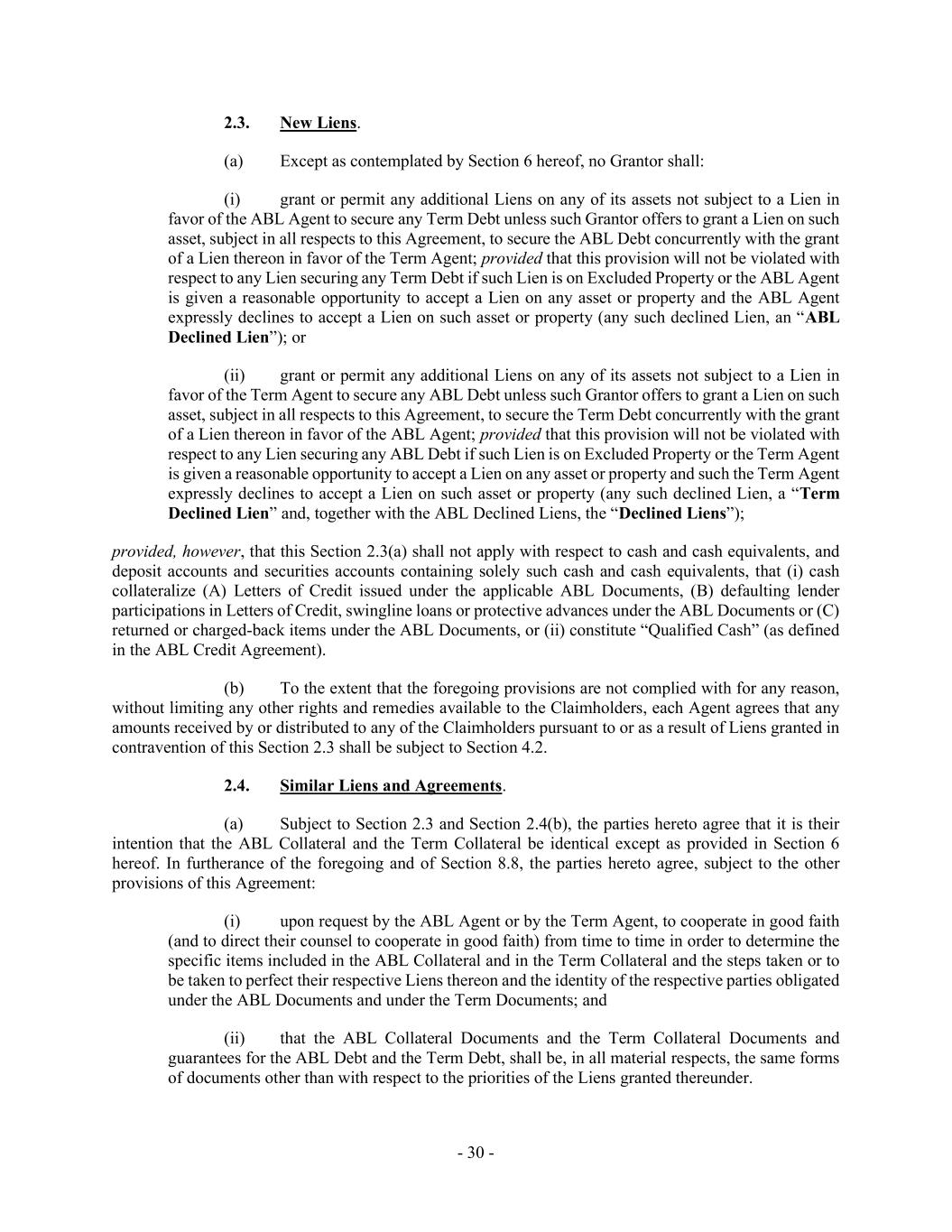 - 30 - 2.3. New Liens. (a) Except as contemplated by Section 6 hereof, no Grantor shall: (i) grant or permit any additional Liens on any of its assets not subject to a Lien in favor of the ABL Agent to secure any Term Debt unless such Grantor offers to grant a Lien on such asset, subject in all respects to this Agreement, to secure the ABL Debt concurrently with the grant of a Lien thereon in favor of the Term Agent; provided that this provision will not be violated with respect to any Lien securing any Term Debt if such Lien is on Excluded Property or the ABL Agent is given a reasonable opportunity to accept a Lien on any asset or property and the ABL Agent expressly declines to accept a Lien on such asset or property (any such declined Lien, an “ABL Declined Lien”); or (ii) grant or permit any additional Liens on any of its assets not subject to a Lien in favor of the Term Agent to secure any ABL Debt unless such Grantor offers to grant a Lien on such asset, subject in all respects to this Agreement, to secure the Term Debt concurrently with the grant of a Lien thereon in favor of the ABL Agent; provided that this provision will not be violated with respect to any Lien securing any ABL Debt if such Lien is on Excluded Property or the Term Agent is given a reasonable opportunity to accept a Lien on any asset or property and such the Term Agent expressly declines to accept a Lien on such asset or property (any such declined Lien, a “Term Declined Lien” and, together with the ABL Declined Liens, the “Declined Liens”); provided, however, that this Section 2.3(a) shall not apply with respect to cash and cash equivalents, and deposit accounts and securities accounts containing solely such cash and cash equivalents, that (i) cash collateralize (A) Letters of Credit issued under the applicable ABL Documents, (B) defaulting lender participations in Letters of Credit, swingline loans or protective advances under the ABL Documents or (C) returned or charged-back items under the ABL Documents, or (ii) constitute “Qualified Cash” (as defined in the ABL Credit Agreement). (b) To the extent that the foregoing provisions are not complied with for any reason, without limiting any other rights and remedies available to the Claimholders, each Agent agrees that any amounts received by or distributed to any of the Claimholders pursuant to or as a result of Liens granted in contravention of this Section 2.3 shall be subject to Section 4.2. 2.4. Similar Liens and Agreements. (a) Subject to Section 2.3 and Section 2.4(b), the parties hereto agree that it is their intention that the ABL Collateral and the Term Collateral be identical except as provided in Section 6 hereof. In furtherance of the foregoing and of Section 8.8, the parties hereto agree, subject to the other provisions of this Agreement: (i) upon request by the ABL Agent or by the Term Agent, to cooperate in good faith (and to direct their counsel to cooperate in good faith) from time to time in order to determine the specific items included in the ABL Collateral and in the Term Collateral and the steps taken or to be taken to perfect their respective Liens thereon and the identity of the respective parties obligated under the ABL Documents and under the Term Documents; and (ii) that the ABL Collateral Documents and the Term Collateral Documents and guarantees for the ABL Debt and the Term Debt, shall be, in all material respects, the same forms of documents other than with respect to the priorities of the Liens granted thereunder.