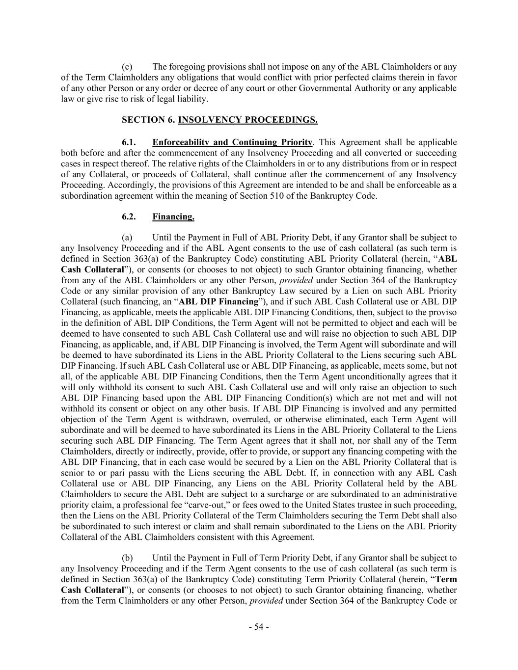 - 54 - (c) The foregoing provisions shall not impose on any of the ABL Claimholders or any of the Term Claimholders any obligations that would conflict with prior perfected claims therein in favor of any other Person or any order or decree of any court or other Governmental Authority or any applicable law or give rise to risk of legal liability. SECTION 6. INSOLVENCY PROCEEDINGS. 6.1. Enforceability and Continuing Priority. This Agreement shall be applicable both before and after the commencement of any Insolvency Proceeding and all converted or succeeding cases in respect thereof. The relative rights of the Claimholders in or to any distributions from or in respect of any Collateral, or proceeds of Collateral, shall continue after the commencement of any Insolvency Proceeding. Accordingly, the provisions of this Agreement are intended to be and shall be enforceable as a subordination agreement within the meaning of Section 510 of the Bankruptcy Code. 6.2. Financing. (a) Until the Payment in Full of ABL Priority Debt, if any Grantor shall be subject to any Insolvency Proceeding and if the ABL Agent consents to the use of cash collateral (as such term is defined in Section 363(a) of the Bankruptcy Code) constituting ABL Priority Collateral (herein, “ABL Cash Collateral”), or consents (or chooses to not object) to such Grantor obtaining financing, whether from any of the ABL Claimholders or any other Person, provided under Section 364 of the Bankruptcy Code or any similar provision of any other Bankruptcy Law secured by a Lien on such ABL Priority Collateral (such financing, an “ABL DIP Financing”), and if such ABL Cash Collateral use or ABL DIP Financing, as applicable, meets the applicable ABL DIP Financing Conditions, then, subject to the proviso in the definition of ABL DIP Conditions, the Term Agent will not be permitted to object and each will be deemed to have consented to such ABL Cash Collateral use and will raise no objection to such ABL DIP Financing, as applicable, and, if ABL DIP Financing is involved, the Term Agent will subordinate and will be deemed to have subordinated its Liens in the ABL Priority Collateral to the Liens securing such ABL DIP Financing. If such ABL Cash Collateral use or ABL DIP Financing, as applicable, meets some, but not all, of the applicable ABL DIP Financing Conditions, then the Term Agent unconditionally agrees that it will only withhold its consent to such ABL Cash Collateral use and will only raise an objection to such ABL DIP Financing based upon the ABL DIP Financing Condition(s) which are not met and will not withhold its consent or object on any other basis. If ABL DIP Financing is involved and any permitted objection of the Term Agent is withdrawn, overruled, or otherwise eliminated, each Term Agent will subordinate and will be deemed to have subordinated its Liens in the ABL Priority Collateral to the Liens securing such ABL DIP Financing. The Term Agent agrees that it shall not, nor shall any of the Term Claimholders, directly or indirectly, provide, offer to provide, or support any financing competing with the ABL DIP Financing, that in each case would be secured by a Lien on the ABL Priority Collateral that is senior to or pari passu with the Liens securing the ABL Debt. If, in connection with any ABL Cash Collateral use or ABL DIP Financing, any Liens on the ABL Priority Collateral held by the ABL Claimholders to secure the ABL Debt are subject to a surcharge or are subordinated to an administrative priority claim, a professional fee “carve-out,” or fees owed to the United States trustee in such proceeding, then the Liens on the ABL Priority Collateral of the Term Claimholders securing the Term Debt shall also be subordinated to such interest or claim and shall remain subordinated to the Liens on the ABL Priority Collateral of the ABL Claimholders consistent with this Agreement. (b) Until the Payment in Full of Term Priority Debt, if any Grantor shall be subject to any Insolvency Proceeding and if the Term Agent consents to the use of cash collateral (as such term is defined in Section 363(a) of the Bankruptcy Code) constituting Term Priority Collateral (herein, “Term Cash Collateral”), or consents (or chooses to not object) to such Grantor obtaining financing, whether from the Term Claimholders or any other Person, provided under Section 364 of the Bankruptcy Code or