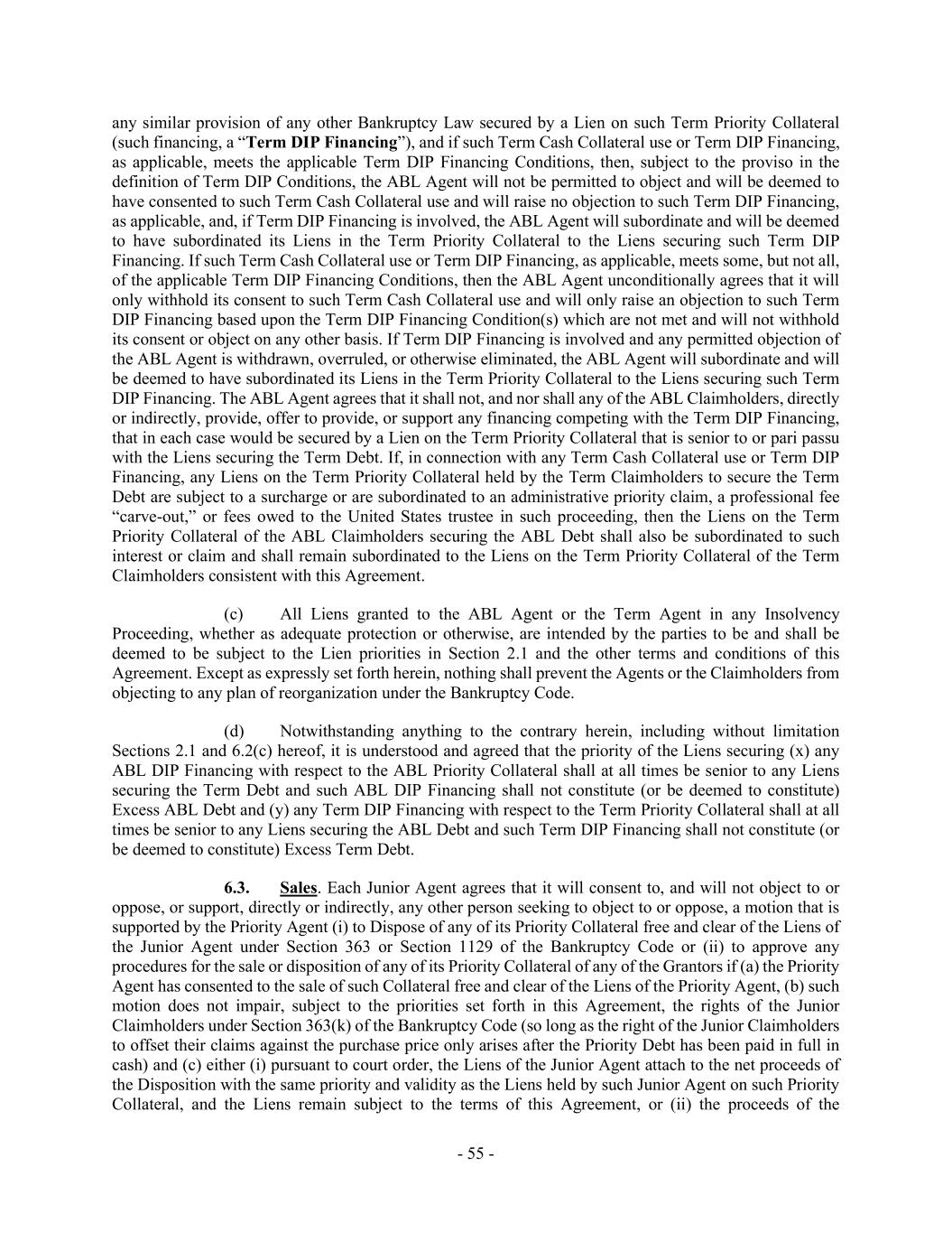 - 55 - any similar provision of any other Bankruptcy Law secured by a Lien on such Term Priority Collateral (such financing, a “Term DIP Financing”), and if such Term Cash Collateral use or Term DIP Financing, as applicable, meets the applicable Term DIP Financing Conditions, then, subject to the proviso in the definition of Term DIP Conditions, the ABL Agent will not be permitted to object and will be deemed to have consented to such Term Cash Collateral use and will raise no objection to such Term DIP Financing, as applicable, and, if Term DIP Financing is involved, the ABL Agent will subordinate and will be deemed to have subordinated its Liens in the Term Priority Collateral to the Liens securing such Term DIP Financing. If such Term Cash Collateral use or Term DIP Financing, as applicable, meets some, but not all, of the applicable Term DIP Financing Conditions, then the ABL Agent unconditionally agrees that it will only withhold its consent to such Term Cash Collateral use and will only raise an objection to such Term DIP Financing based upon the Term DIP Financing Condition(s) which are not met and will not withhold its consent or object on any other basis. If Term DIP Financing is involved and any permitted objection of the ABL Agent is withdrawn, overruled, or otherwise eliminated, the ABL Agent will subordinate and will be deemed to have subordinated its Liens in the Term Priority Collateral to the Liens securing such Term DIP Financing. The ABL Agent agrees that it shall not, and nor shall any of the ABL Claimholders, directly or indirectly, provide, offer to provide, or support any financing competing with the Term DIP Financing, that in each case would be secured by a Lien on the Term Priority Collateral that is senior to or pari passu with the Liens securing the Term Debt. If, in connection with any Term Cash Collateral use or Term DIP Financing, any Liens on the Term Priority Collateral held by the Term Claimholders to secure the Term Debt are subject to a surcharge or are subordinated to an administrative priority claim, a professional fee “carve-out,” or fees owed to the United States trustee in such proceeding, then the Liens on the Term Priority Collateral of the ABL Claimholders securing the ABL Debt shall also be subordinated to such interest or claim and shall remain subordinated to the Liens on the Term Priority Collateral of the Term Claimholders consistent with this Agreement. (c) All Liens granted to the ABL Agent or the Term Agent in any Insolvency Proceeding, whether as adequate protection or otherwise, are intended by the parties to be and shall be deemed to be subject to the Lien priorities in Section 2.1 and the other terms and conditions of this Agreement. Except as expressly set forth herein, nothing shall prevent the Agents or the Claimholders from objecting to any plan of reorganization under the Bankruptcy Code. (d) Notwithstanding anything to the contrary herein, including without limitation Sections 2.1 and 6.2(c) hereof, it is understood and agreed that the priority of the Liens securing (x) any ABL DIP Financing with respect to the ABL Priority Collateral shall at all times be senior to any Liens securing the Term Debt and such ABL DIP Financing shall not constitute (or be deemed to constitute) Excess ABL Debt and (y) any Term DIP Financing with respect to the Term Priority Collateral shall at all times be senior to any Liens securing the ABL Debt and such Term DIP Financing shall not constitute (or be deemed to constitute) Excess Term Debt. 6.3. Sales. Each Junior Agent agrees that it will consent to, and will not object to or oppose, or support, directly or indirectly, any other person seeking to object to or oppose, a motion that is supported by the Priority Agent (i) to Dispose of any of its Priority Collateral free and clear of the Liens of the Junior Agent under Section 363 or Section 1129 of the Bankruptcy Code or (ii) to approve any procedures for the sale or disposition of any of its Priority Collateral of any of the Grantors if (a) the Priority Agent has consented to the sale of such Collateral free and clear of the Liens of the Priority Agent, (b) such motion does not impair, subject to the priorities set forth in this Agreement, the rights of the Junior Claimholders under Section 363(k) of the Bankruptcy Code (so long as the right of the Junior Claimholders to offset their claims against the purchase price only arises after the Priority Debt has been paid in full in cash) and (c) either (i) pursuant to court order, the Liens of the Junior Agent attach to the net proceeds of the Disposition with the same priority and validity as the Liens held by such Junior Agent on such Priority Collateral, and the Liens remain subject to the terms of this Agreement, or (ii) the proceeds of the