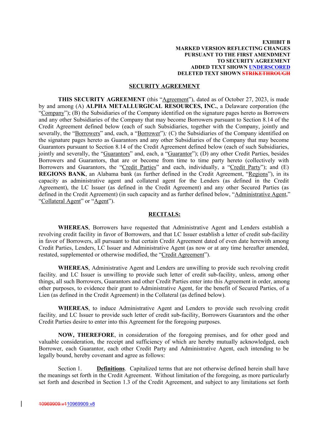 EXHIBIT B MARKED VERSION REFLECTING CHANGES PURSUANT TO THE FIRST AMENDMENT TO SECURITY AGREEMENT ADDED TEXT SHOWN UNDERSCORED DELETED TEXT SHOWN STRIKETHROUGH SECURITY AGREEMENT THIS SECURITY AGREEMENT (this “Agreement”), dated as of October 27, 2023, is made by and among (A) ALPHA METALLURGICAL RESOURCES, INC., a Delaware corporation (the “Company”); (B) the Subsidiaries of the Company identified on the signature pages hereto as Borrowers and any other Subsidiaries of the Company that may become Borrowers pursuant to Section 8.14 of the Credit Agreement defined below (each of such Subsidiaries, together with the Company, jointly and severally, the “Borrowers” and, each, a “Borrower”); (C) the Subsidiaries of the Company identified on the signature pages hereto as Guarantors and any other Subsidiaries of the Company that may become Guarantors pursuant to Section 8.14 of the Credit Agreement defined below (each of such Subsidiaries, jointly and severally, the “Guarantors” and, each, a “Guarantor”); (D) any other Credit Parties, besides Borrowers and Guarantors, that are or become from time to time party hereto (collectively with Borrowers and Guarantors, the “Credit Parties” and each, individually, a “Credit Party”); and (E) REGIONS BANK, an Alabama bank (as further defined in the Credit Agreement, “Regions”), in its capacity as administrative agent and collateral agent for the Lenders (as defined in the Credit Agreement), the LC Issuer (as defined in the Credit Agreement) and any other Secured Parties (as defined in the Credit Agreement) (in such capacity and as further defined below, “Administrative Agent,” “Collateral Agent” or “Agent”). RECITALS: WHEREAS, Borrowers have requested that Administrative Agent and Lenders establish a revolving credit facility in favor of Borrowers, and that LC Issuer establish a letter of credit sub-facility in favor of Borrowers, all pursuant to that certain Credit Agreement dated of even date herewith among Credit Parties, Lenders, LC Issuer and Administrative Agent (as now or at any time hereafter amended, restated, supplemented or otherwise modified, the “Credit Agreement”). WHEREAS, Administrative Agent and Lenders are unwilling to provide such revolving credit facility, and LC Issuer is unwilling to provide such letter of credit sub-facility, unless, among other things, all such Borrowers, Guarantors and other Credit Parties enter into this Agreement in order, among other purposes, to evidence their grant to Administrative Agent, for the benefit of Secured Parties, of a Lien (as defined in the Credit Agreement) in the Collateral (as defined below). WHEREAS, to induce Administrative Agent and Lenders to provide such revolving credit facility, and LC Issuer to provide such letter of credit sub-facility, Borrowers Guarantors and the other Credit Parties desire to enter into this Agreement for the foregoing purposes. NOW, THEREFORE, in consideration of the foregoing premises, and for other good and valuable consideration, the receipt and sufficiency of which are hereby mutually acknowledged, each Borrower, each Guarantor, each other Credit Party and Administrative Agent, each intending to be legally bound, hereby covenant and agree as follows: Section 1. Definitions. Capitalized terms that are not otherwise defined herein shall have the meanings set forth in the Credit Agreement. Without limitation of the foregoing, as more particularly set forth and described in Section 1.3 of the Credit Agreement, and subject to any limitations set forth 10969909.v110969909.v8