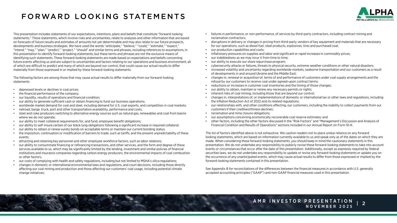 2 4A M R R a t i n g s A g e n c y P r e s e n t a t i o n J a n u a r y 2 0 2 5 |A M R I N V E S T O R P R E S E N T A T I O N N O V E M B E R 1 Based on committed and priced coal shipments as of October 29, 2025. Committed percentage based on the midpoint of shipment guidance range. 2 Actual average per-ton realizations on committed and priced tons recognized in future periods may vary based on actual freight expense in future periods relative to assumed freight expense embedded in projected average per-ton realizations. 3 Includes estimates of future coal shipments based upon contract terms and anticipated delivery schedules. Actual coal shipments may vary from these estimates. 4 Note: The Company is unable to present a quantitative reconciliation of its forward-looking non-GAAP cost of coal sales per ton sold financial measures to the most directly comparable GAAP measures without unreasonable efforts due to the inherent difficulty in forecasting and quantifying with reasonable accuracy significant items required for the reconciliation. The most directly comparable GAAP measure, GAAP cost of sales, is not accessible without unreasonable efforts on a forward-looking basis. The reconciling items include freight and handling costs, which are a component of GAAP cost of sales. Management is unable to predict without unreasonable efforts freight and handling costs due to uncertainty as to the end market and FOB point for uncommitted sales volumes and the final shipping point for export shipments. These amounts have varied historically and may continue to vary significantly from quarter to quarter and material changes to these items could have a significant effect on our future GAAP results. 5 Excludes expenses related to non-cash stock compensation and non-recurring expenses. 6 Includes contributions to fund normal operations at our DTA export facility and expected capital investments related to the facility upgrades. G U I DA N C E A S O F N OV E M B E R 6 , 2 0 2 5 Shipments (million tons) Low High Metallurgical 13.8 14.8 Non-Metallurgical Byproduct 0.8 1.2 Met Segment - Total Shipments 14.6 16.0 Committed / Priced Volumes 1, 2, 3 % Committed Average Price ($/ton) Metallurgical - Domestic $152.25 Metallurgical - Export $110.84 Metallurgical Total 85% $122.57 Non-Metallurgical Byproduct 100% $80.27 Met Segment 87% $118.97 Cost per ton ($/ton) 4 Low High Met Segment $101.00 $107.00 Other Items (US$ millions, except taxes) Low High SG&A 5 $48 $54 Idle Operations Expense $21 $29 Net Cash Interest Income $6 $12 DD&A $165 $185 Capital Expenditures $130 $150 Capital Contributions to Equity Affiliates 6 $35 $41 Cash Tax Rate 0% 5%