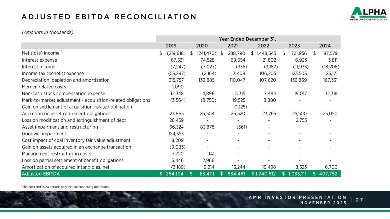 1 9A M R R a t i n g s A g e n c y P r e s e n t a t i o n J a n u a r y 2 0 2 5 |A M R I N V E S T O R P R E S E N T A T I O N N O V E M B E R $(71) $(28) $85 $1,300 $575 $349 2019 2020 2021 2022 2023 2024 $264 $83 $534 $1,741 $1,033 $408 2019 2020 2021 2022 2023 2024 17.2 15.5 16.8 16.4 17.1 17.1 2019 2020 2021 2022 2023 2024 H I S TO R I C A L F I N A N C I A L S U M M A RY Tons Sold (Million Tons) Revenue (US$bn) Adj. EBITDA (US$mm)2 Free Cash Flow (US$mm)4 Avg. Realized Price (US$/ton)1 Note: 2019 excludes discontinued operations. 1 Represents Non-GAAP coal sales realization per ton. Refer to Appendix for a reconciliation of this non-GAAP financial measure. 2 This is a non-GAAP financial measure. A reconciliation of Net Income to Adjusted EBITDA is included in Appendix. 3 Represents Adjusted EBITDA divided by Total Revenues. Refer to Appendix for a reconciliation of this non-GAAP financial measure. 4 Represents Free Cash Flow. Refer to Appendix for a reconciliation of this non-GAAP financial measure. 5 Represents Free Cash Flow Conversion. Refer to Appendix for a reconciliation of this non-GAAP financial measure. Margin (%)3 FCF Conversion (%)5 $2.0 $1.4 $2.3 $4.1 $3.5 $2.9 2019 2020 2021 2022 2023 2024 $77 $111 $177 $143 13% 6% 24% 42% 30% 14% 16% 75% 56% 85%(27)% (34)% $218$100