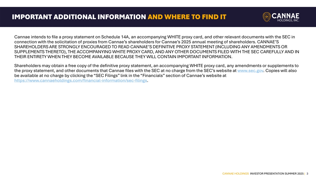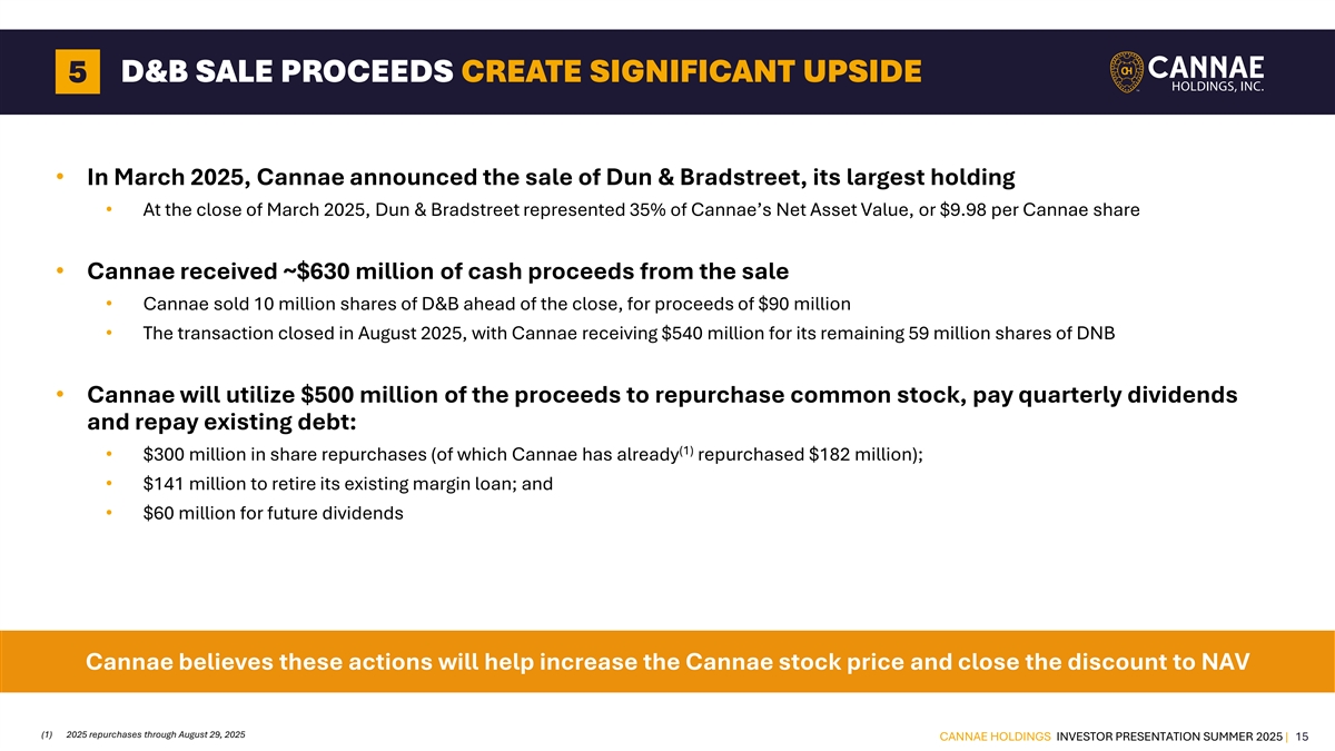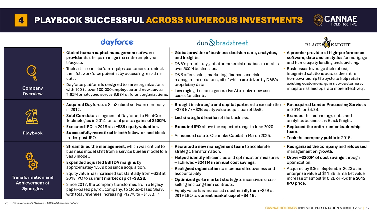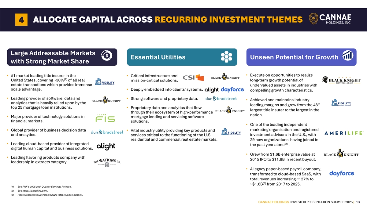 FORWARD-LOOKING STATEMENTS This communication contains forward-looking statements that involve a number of risks and uncertainties. Statements that are not historical facts, including statements regarding our expectations, hopes, beliefs, plans, intentions, or strategies regarding the future are forward-looking statements. Forward-looking statements are based on management’s beliefs, as well as assumptions made by, and information currently available to, management, including statements about our buyback program, the impact of our actions on shareholder value and net asset value, and our ability to implement our plans. Because such statements are based on expectations as to future financial and operating results and are not statements of fact, actual results may differ materially from those projected. Except as required by applicable law, we undertake no obligation to update any forward-looking statements, whether as a result of new information, future events or otherwise. The risks and uncertainties that forward-looking statements are subject to include, but are not limited to: risks associated with our capital allocation strategy; risks associated with the use of proceeds received as a result of the D&B transaction; risks associated with our ability to successfully operate businesses outside our traditional areas of focus; changes in general economic, business and political conditions, including among others, consumer spending, business investment, government spending, the volatility and strength of the capital markets, investor and consumer confidence, foreign currency exchange rates, commodity prices, inflation levels, changes in trade policy, tariffs on goods, and supply chain disruptions; risks associated with the Investment Company Act of 1940; risks associated with our potential inability to find suitable acquisition candidates, acquisitions in lines of business that will not necessarily be limited to our traditional areas of focus, or difficulties in integrating acquisitions; significant competition that our operating subsidiaries face; risks related to the externalization of certain of our management functions to an external manager, and risks associated with being the subject of a proxy contest. This presentation should be read in conjunction with the risks detailed in the “Statement Regarding Forward-Looking Information,” “Risk Factors” and other sections of the Cannae Holdings, Inc.’s (“Cannae”) Forms 10-Q, 10-K and other filings with the Securities and Exchange Commission (the “SEC”). Statements and case studies contained herein relate to (i) Fidelity National Financial, Inc. (“FNF”), (ii) Fidelity National Information Services, Inc. (“FIS”), (iii) Alight, Inc. (“ALIT”) (iv) Paysafe Limited (“PSFE”), (v) Dayforce, Inc. (“DAY”), (vi) Dun & Bradstreet Holdings, Inc. (“DNB”), (vii) System1, Inc. (“SST”), (viii) F&G Annuities & Life, Inc. (“F&G” or “FG”), and/or (ix) Black Knight Football Club US, LP (“BKFC”, or “Black Knight Football”), and/or (x) the historical performance of certain securities noted throughout this document as some of these securities are no longer available for purchase. An investment in Cannae is not an investment in any of these securities. The historical stock price performance of these securities is not necessarily indicative of future performance of Cannae. Past stock price performance and rate of return of common stock of Cannae may not be indicative of future performance. CANNAE HOLDINGS INVESTOR PRESENTATION SUMMER 2025 | 2