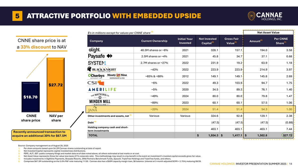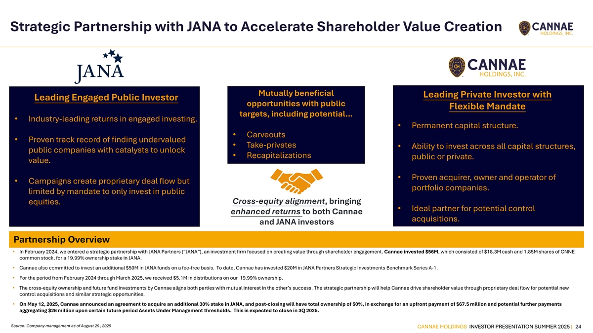 Strategic Partnership with JANA to Accelerate Shareholder Value Creation Mutually beneficial Leading Private Investor with Leading Engaged Public Investor opportunities with public Flexible Mandate targets, including potential… • Industry-leading returns in engaged investing. • Permanent capital structure. • Carveouts • Proven track record of finding undervalued • Take-privates • Ability to invest across all capital structures, public companies with catalysts to unlock • Recapitalizations public or private. value. • Proven acquirer, owner and operator of • Campaigns create proprietary deal flow but portfolio companies. limited by mandate to only invest in public Cross-equity alignment, bringing equities. • Ideal partner for potential control enhanced returns to both Cannae acquisitions. and JANA investors Partnership Overview • In February 2024, we entered a strategic partnership with JANA Partners (“JANA”), an investment firm focused on creating value through shareholder engagement. Cannae invested $56M, which consisted of $18.3M cash and 1.85M shares of CNNE common stock, for a 19.99% ownership stake in JANA. • Cannae also committed to invest an additional $50M in JANA funds on a fee-free basis. To date, Cannae has invested $20M in JANA Partners Strategic Investments Benchmark Series A-1. • For the period from February 2024 through March 2025, we received $5.1M in distributions on our 19.99% ownership. • The cross-equity ownership and future fund investments by Cannae aligns both parties with mutual interest in the other’s success. The strategic partnership will help Cannae drive shareholder value through proprietary deal flow for potential new control acquisitions and similar strategic opportunities. • On May 12, 2025, Cannae announced an agreement to acquire an additional 30% stake in JANA, and post-closing will have total ownership of 50%, in exchange for an upfront payment of $67.5 million and potential further payments aggregating $26 million upon certain future period Assets Under Management thresholds. This is expected to close in 3Q 2025. Source: Company management as of August 29 , 2025 CANNAE HOLDINGS INVESTOR PRESENTATION SUMMER 2025 | 24