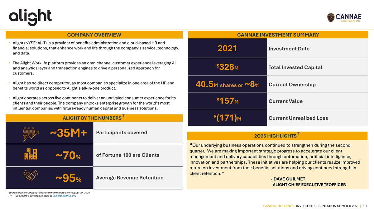 COMPANY OVERVIEW CANNAE INVESTMENT SUMMARY • Alight (NYSE: ALIT) is a provider of benefits administration and cloud-based HR and financial solutions, that enhance work and life through the company’s service, technology, Investment Date 2021 and data. • The Alight Worklife platform provides an omnichannel customer experience leveraging AI $ Total Invested Capital and analytics layer and transaction engines to drive a personalized approach for 328M customers. • Alight has no direct competitor, as most companies specialize in one area of the HR and Current Ownership 40.5M shares or ~8% benefits world as opposed to Alight’s all-in-one product. • Alight operates across five continents to deliver an unrivaled consumer experience for its $ Current Value 157M clients and their people. The company unlocks enterprise growth for the world’s most influential companies with future-ready human capital and business solutions. (1) $ ALIGHT BY THE NUMBERS Current Unrealized Loss (171)M Participants covered (1) ~35M+ 2Q25 HIGHLIGHTS “Our underlying business operations continued to strengthen during the second quarter. We are making important strategic progress to accelerate our client of Fortune 100 are Clients management and delivery capabilities through automation, artificial intelligence, ~70% innovation and partnerships. These initiatives are helping our clients realize improved return on investment from their benefits solutions and driving continued strength in client retention.” Average Revenue Retention - DAVE GUILMET ~95% ALIGHT CHIEF EXECUTIVE TEOFFICER Source: Public company filings and market data as of August 29, 2025 (1) See Alight’s earnings release at investor.alight.com. CANNAE HOLDINGS INVESTOR PRESENTATION SUMMER 2025 | 19