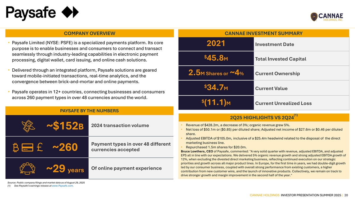 COMPANY OVERVIEW CANNAE INVESTMENT SUMMARY • Paysafe Limited (NYSE: PSFE) is a specialized payments platform. Its core 2021 Investment Date purpose is to enable businesses and consumers to connect and transact seamlessly through industry-leading capabilities in electronic payment $ 45.8M Total Invested Capital processing, digital wallet, card issuing, and online cash solutions. • Delivered through an integrated platform, Paysafe solutions are geared 2.5M Shares or ~4% Current Ownership toward mobile-initiated transactions, real-time analytics, and the convergence between brick-and-mortar and online payments. $ 34.7M Current Value • Paysafe operates in 12+ countries, connecting businesses and consumers across 260 payment types in over 48 currencies around the world. $ (11.1)M Current Unrealized Loss PAYSAFE BY THE NUMBERS (1) 2Q25 HIGHLIGHTS VS 2Q24 • Revenue of $428.2m, a decrease of 3%; organic revenue grew 5%. 2024 transaction volume ~$152B • Net loss of $50.1m or ($0.85) per diluted share; Adjusted net income of $27.6m or $0.46 per diluted share. • Adjusted EBITDA of $105.0m, inclusive of a $25.4m headwind related to the disposal of the direct marketing business line. Payment types in over 48 different • Repurchased 1.5m shares for $20.0m. ~260 currencies accepted Bruce Lowthers, CEO of Paysafe, commented: A very solid quarter with revenue, adjusted EBITDA, and adjusted EPS all in line with our expectations. We delivered 5% organic revenue growth and strong adjusted EBITDA growth of 12%, when excluding the divested direct marketing business, reflecting continued execution on our strategic priorities and growth across all major product lines. In Europe, for the first time in years, we had double-digit growth led by our consumer business, coupled with overall strong performance from existing customers, a higher Of online payment experience ~29 years contribution from new customer wins, and the launch of innovative products. Collectively, we remain on track to drive stronger growth and margin improvement in the second half of the year. Source: Public company filings and market data as of August 29, 2025 (1) See Paysafe’s earnings release at www.Paysafe.com. CANNAE HOLDINGS INVESTOR PRESENTATION SUMMER 2025 | 20