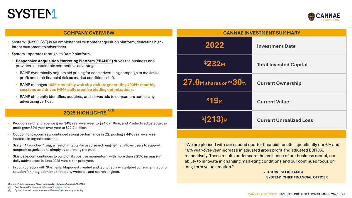 COMPANY OVERVIEW CANNAE INVESTMENT SUMMARY • System1 (NYSE: SST) is an omnichannel customer acquisition platform, delivering high- 2022 Investment Date intent customers to advertisers. • System1 operates through its RAMP platform. • Responsive Acquisition Marketing Platform (“RAMP”) drives the business and $ 232M Total Invested Capital provides a sustainable competitive advantage. • RAMP dynamically adjusts bid pricing for each advertising campaign to maximize profit and limit financial risk as market conditions shift. 27.0M shares or ~30% Current Ownership • RAMP manages 108M+ monthly web site visitors generating 490M+ monthly sessions and drives 94M+ daily creative bidding optimizations. • RAMP efficiently identifies, acquires, and serves ads to consumers across any $ advertising vertical. 19M Current Value (1)(2) 2Q25 HIGHLIGHTS $ (213)M Current Unrealized Loss • Products segment revenue grew 34% year-over-year to $24.0 million, and Products adjusted gross profit grew 32% year-over-year to $22.7 million. • CouponFollow.com saw continued strong performance in Q2, posting a 44% year-over-year increase in organic sessions. “We are pleased with our second quarter financial results, specifically our 6% and • System1 launched 1.org, a free charitable-focused search engine that allows users to support nonprofit organizations simply by searching the web. 18% year-over-year increase in adjusted gross profit and adjusted EBITDA, respectively. These results underscore the resilience of our business model, our • Startpage.com continues to build on its positive momentum, with more than a 25% increase in daily active users in June 2025 versus the prior year. ability to innovate in changing marketing conditions and our continued focus on long-term value creation.” • In collaboration with Startpage, Mapquest created and launched a white-label consumer mapping solution for integration into third party websites and search engines. - TRIDIVESH KIDAMBI SYSTEM1 CHIEF FINANCIAL OFFICER Source: Public company filings and market data as of August 29, 2025 (1) See System1’s earnings release at ir.system1.com. (2) System1 results are included in Cannae’s on a one-quarter lag. CANNAE HOLDINGS INVESTOR PRESENTATION SUMMER 2025 | 21