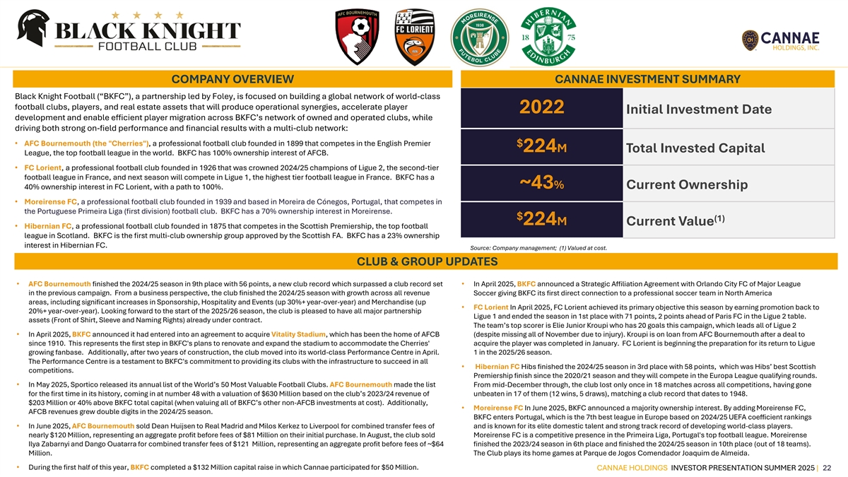 COMPANY OVERVIEW CANNAE INVESTMENT SUMMARY Black Knight Football (“BKFC”), a partnership led by Foley, is focused on building a global network of world-class football clubs, players, and real estate assets that will produce operational synergies, accelerate player 2022 Initial Investment Date development and enable efficient player migration across BKFC’s network of owned and operated clubs, while driving both strong on-field performance and financial results with a multi-club network: • AFC Bournemouth (the Cherries ), a professional football club founded in 1899 that competes in the English Premier $ 224M Total Invested Capital League, the top football league in the world. BKFC has 100% ownership interest of AFCB. • FC Lorient, a professional football club founded in 1926 that was crowned 2024/25 champions of Ligue 2, the second-tier football league in France, and next season will compete in Ligue 1, the highest tier football league in France. BKFC has a ~43% Current Ownership 40% ownership interest in FC Lorient, with a path to 100%. • Moreirense FC, a professional football club founded in 1939 and based in Moreira de Cónegos, Portugal, that competes in the Portuguese Primeira Liga (first division) football club. BKFC has a 70% ownership interest in Moreirense. $ (1) 224M Current Value • Hibernian FC, a professional football club founded in 1875 that competes in the Scottish Premiership, the top football league in Scotland. BKFC is the first multi-club ownership group approved by the Scottish FA. BKFC has a 23% ownership interest in Hibernian FC. Source: Company management; (1) Valued at cost. CLUB & GROUP UPDATES • AFC Bournemouth finished the 2024/25 season in 9th place with 56 points, a new club record which surpassed a club record set • In April 2025, BKFC announced a Strategic Affiliation Agreement with Orlando City FC of Major League in the previous campaign. From a business perspective, the club finished the 2024/25 season with growth across all revenue Soccer giving BKFC its first direct connection to a professional soccer team in North America areas, including significant increases in Sponsorship, Hospitality and Events (up 30%+ year-over-year) and Merchandise (up • FC Lorient In April 2025, FC Lorient achieved its primary objective this season by earning promotion back to 20%+ year-over-year). Looking forward to the start of the 2025/26 season, the club is pleased to have all major partnership Ligue 1 and ended the season in 1st place with 71 points, 2 points ahead of Paris FC in the Ligue 2 table. assets (Front of Shirt, Sleeve and Naming Rights) already under contract. The team’s top scorer is Elie Junior Kroupi who has 20 goals this campaign, which leads all of Ligue 2 • In April 2025, BKFC announced it had entered into an agreement to acquire Vitality Stadium, which has been the home of AFCB (despite missing all of November due to injury). Kroupi is on loan from AFC Bournemouth after a deal to since 1910. This represents the first step in BKFC's plans to renovate and expand the stadium to accommodate the Cherries' acquire the player was completed in January. FC Lorient is beginning the preparation for its return to Ligue growing fanbase. Additionally, after two years of construction, the club moved into its world-class Performance Centre in April. 1 in the 2025/26 season. The Performance Centre is a testament to BKFC's commitment to providing its clubs with the infrastructure to succeed in all • Hibernian FC Hibs finished the 2024/25 season in 3rd place with 58 points, which was Hibs’ best Scottish competitions. Premiership finish since the 2020/21 season and they will compete in the Europa League qualifying rounds. • In May 2025, Sportico released its annual list of the World’s 50 Most Valuable Football Clubs. AFC Bournemouth made the list From mid-December through, the club lost only once in 18 matches across all competitions, having gone for the first time in its history, coming in at number 48 with a valuation of $630 Million based on the club’s 2023/24 revenue of unbeaten in 17 of them (12 wins, 5 draws), matching a club record that dates to 1948. $203 Million or 40% above BKFC total capital (when valuing all of BKFC’s other non-AFCB investments at cost). Additionally, • Moreirense FC In June 2025, BKFC announced a majority ownership interest. By adding Moreirense FC, AFCB revenues grew double digits in the 2024/25 season. BKFC enters Portugal, which is the 7th best league in Europe based on 2024/25 UEFA coefficient rankings • In June 2025, AFC Bournemouth sold Dean Huijsen to Real Madrid and Milos Kerkez to Liverpool for combined transfer fees of and is known for its elite domestic talent and strong track record of developing world-class players. nearly $120 Million, representing an aggregate profit before fees of $81 Million on their initial purchase. In August, the club sold Moreirense FC is a competitive presence in the Primeira Liga, Portugal's top football league. Moreirense Ilya Zabarnyi and Dango Ouatarra for combined transfer fees of $121 Million, representing an aggregate profit before fees of ~$64 finished the 2023/24 season in 6th place and finished the 2024/25 season in 10th place (out of 18 teams). Million. The Club plays its home games at Parque de Jogos Comendador Joaquim de Almeida. • During the first half of this year, BKFC completed a $132 Million capital raise in which Cannae participated for $50 Million. CANNAE HOLDINGS INVESTOR PRESENTATION SUMMER 2025 | 22